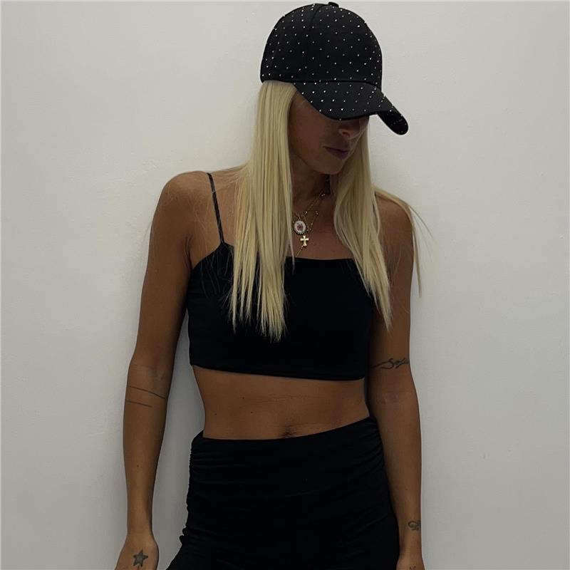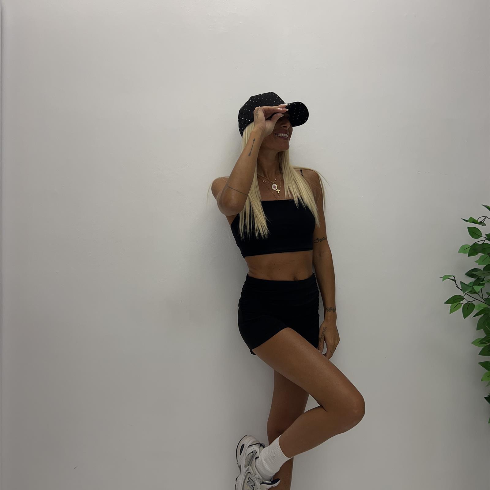 Completo in tessuto elasticizzato top spallino fine shorts con banda alta rappresa ai fianchi