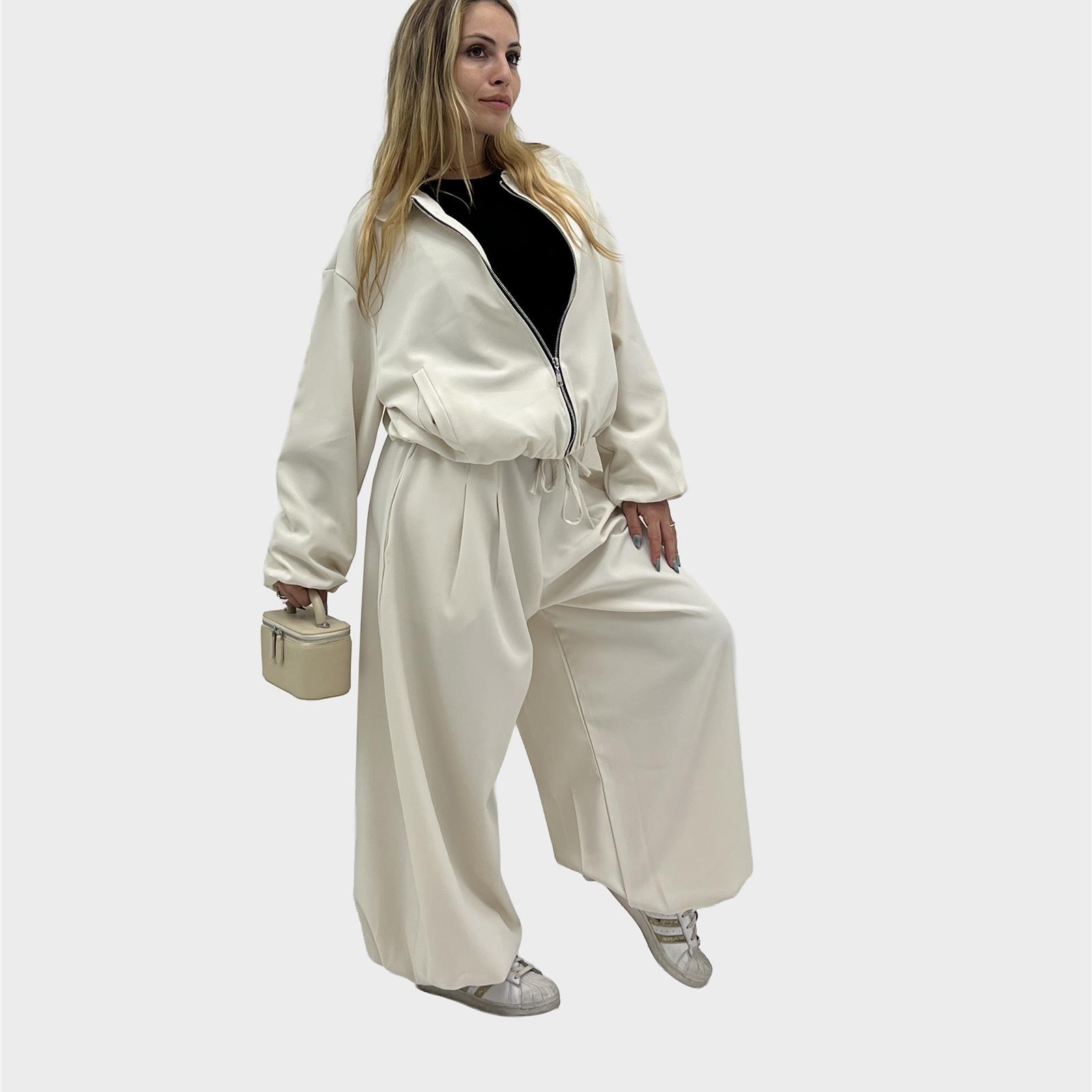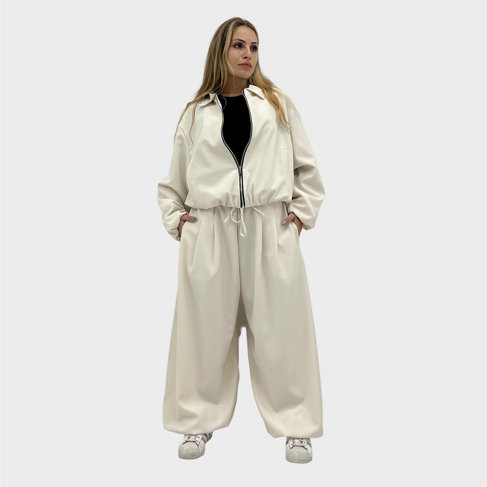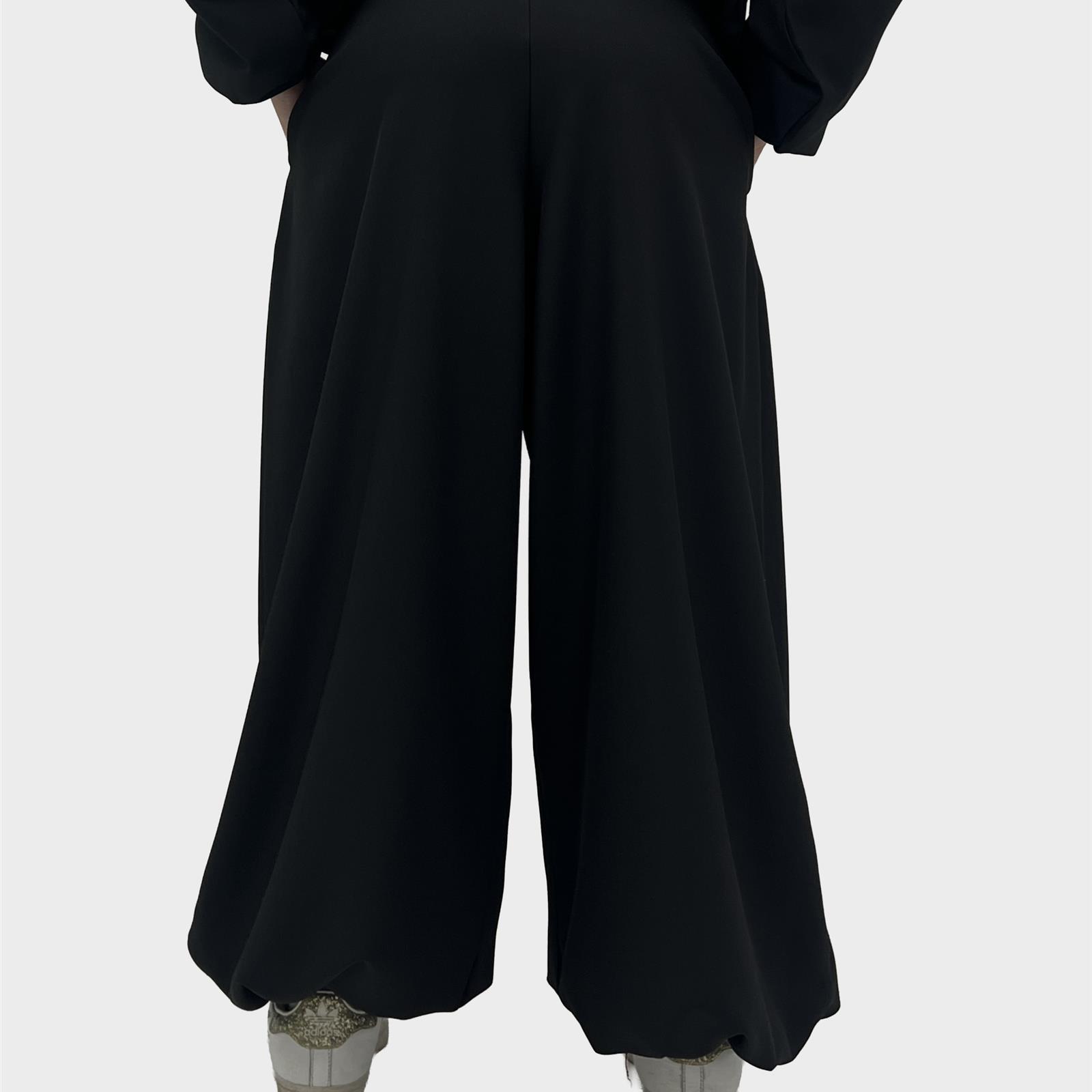 Pantalone modello balloon , elastico regolabile in vita e sul fondo, tasche laterali reali e pence sul davanti.