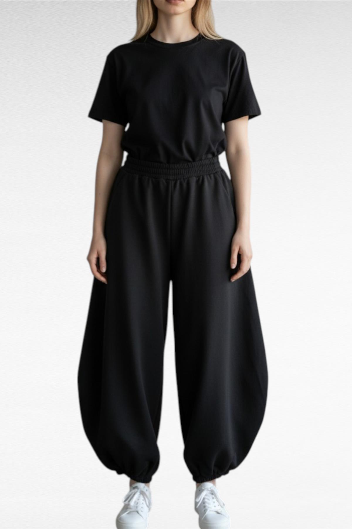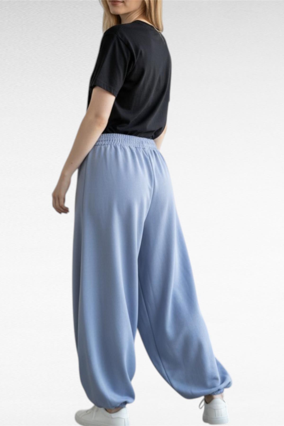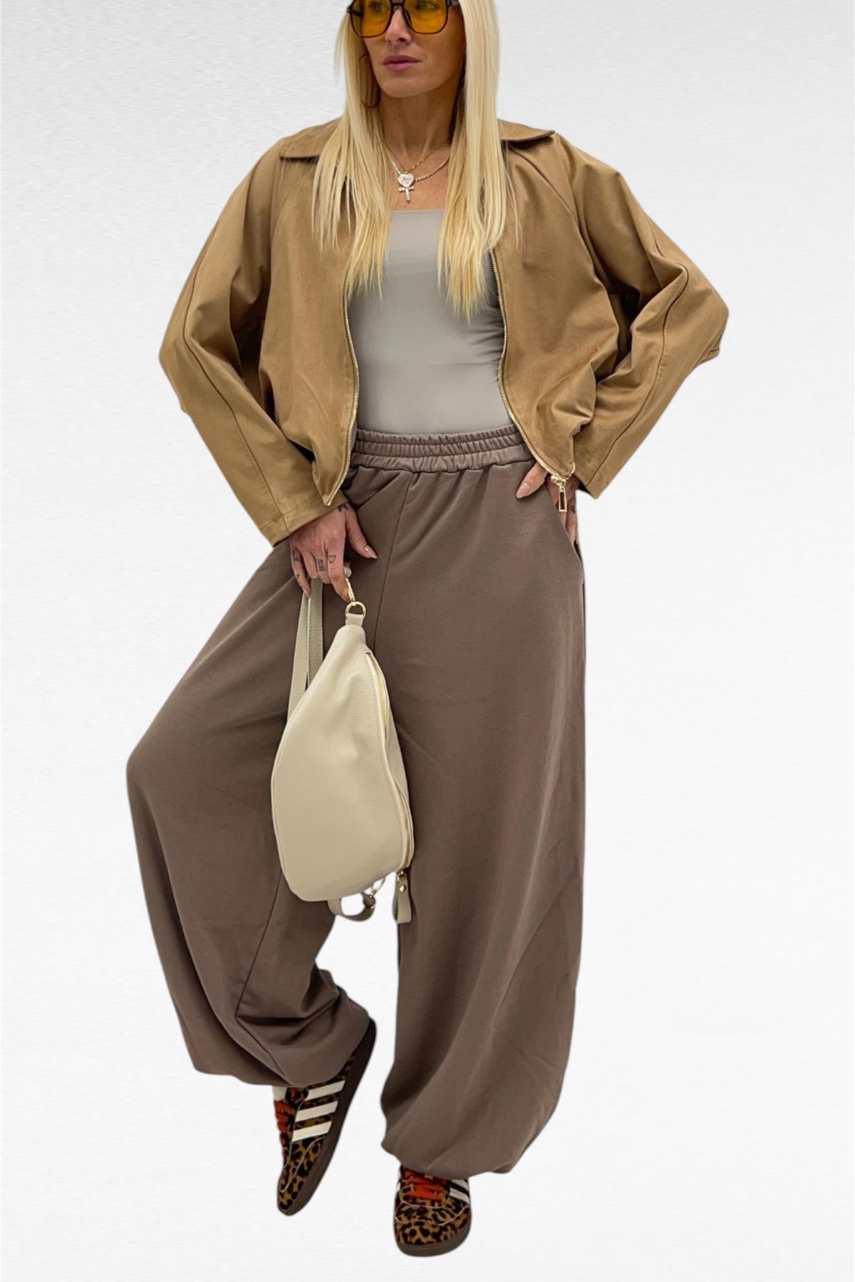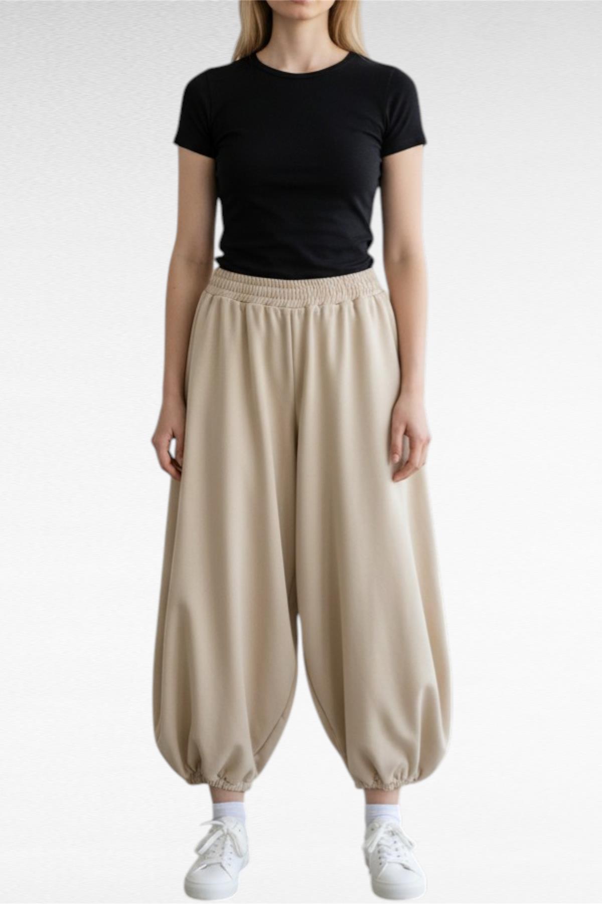 Pantalone modello balloon garzato con tasche laterali, elastico in vita e sul fondo.