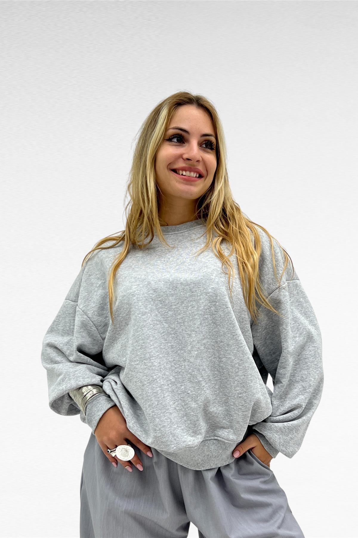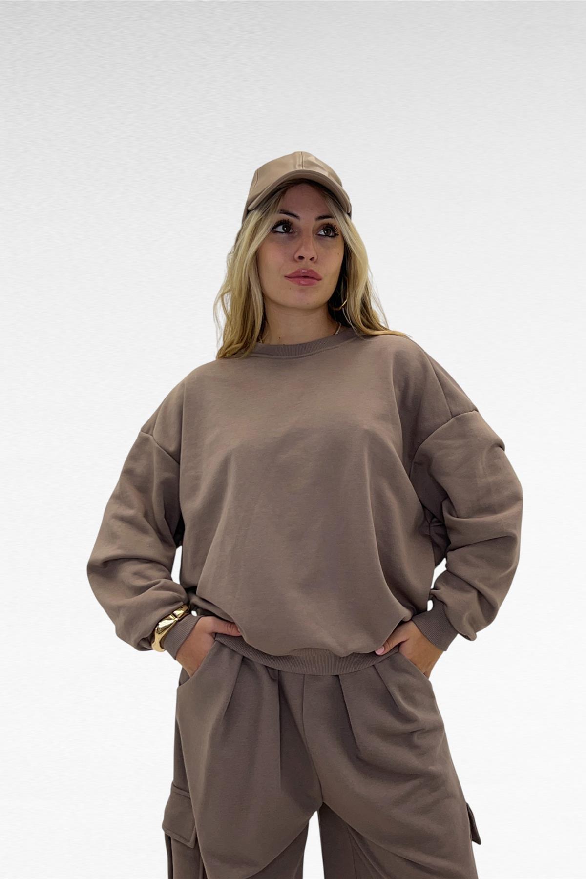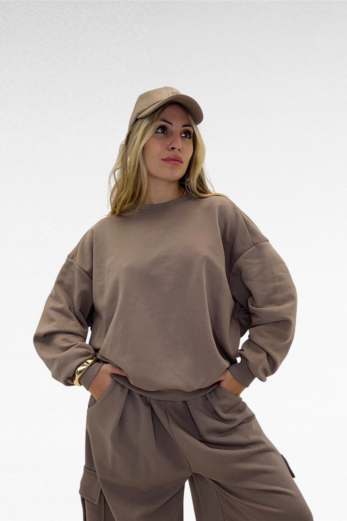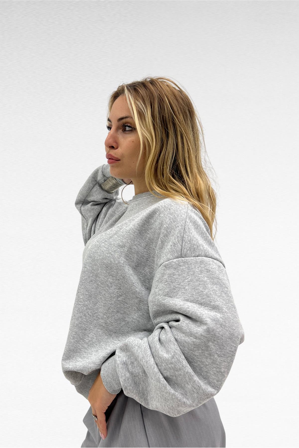 felpa garzata paricollo, elasticizzata, con polsino in costina, girocollo in costina e balza sul fondo in costina.