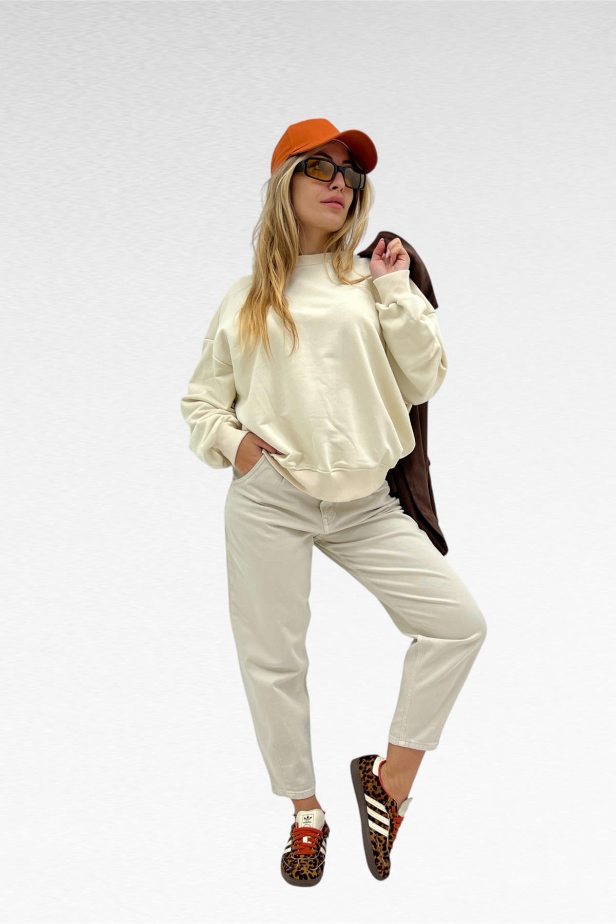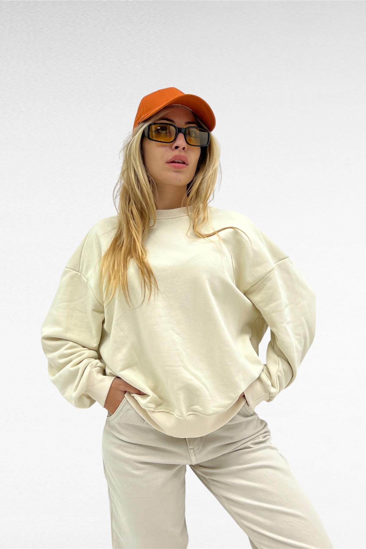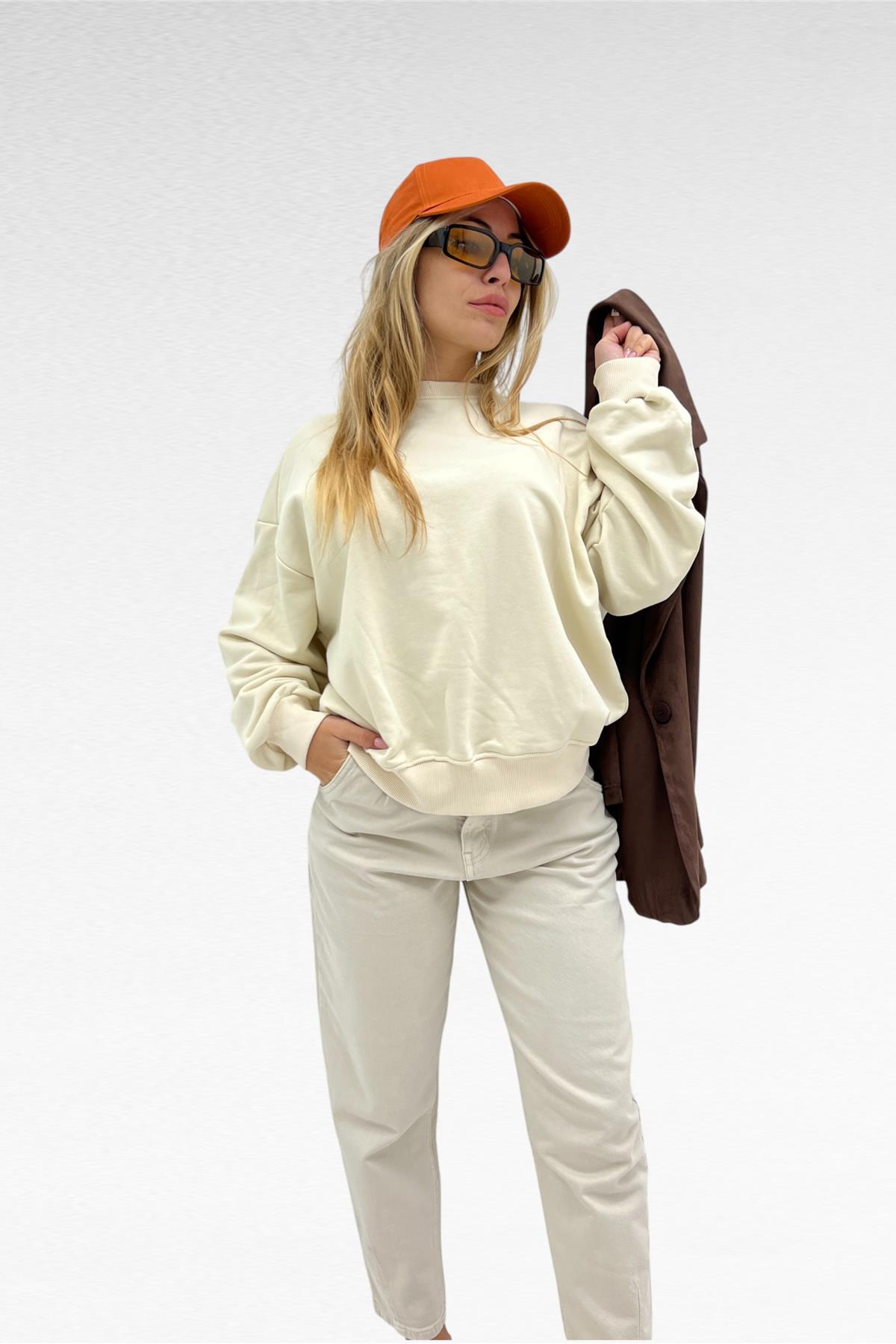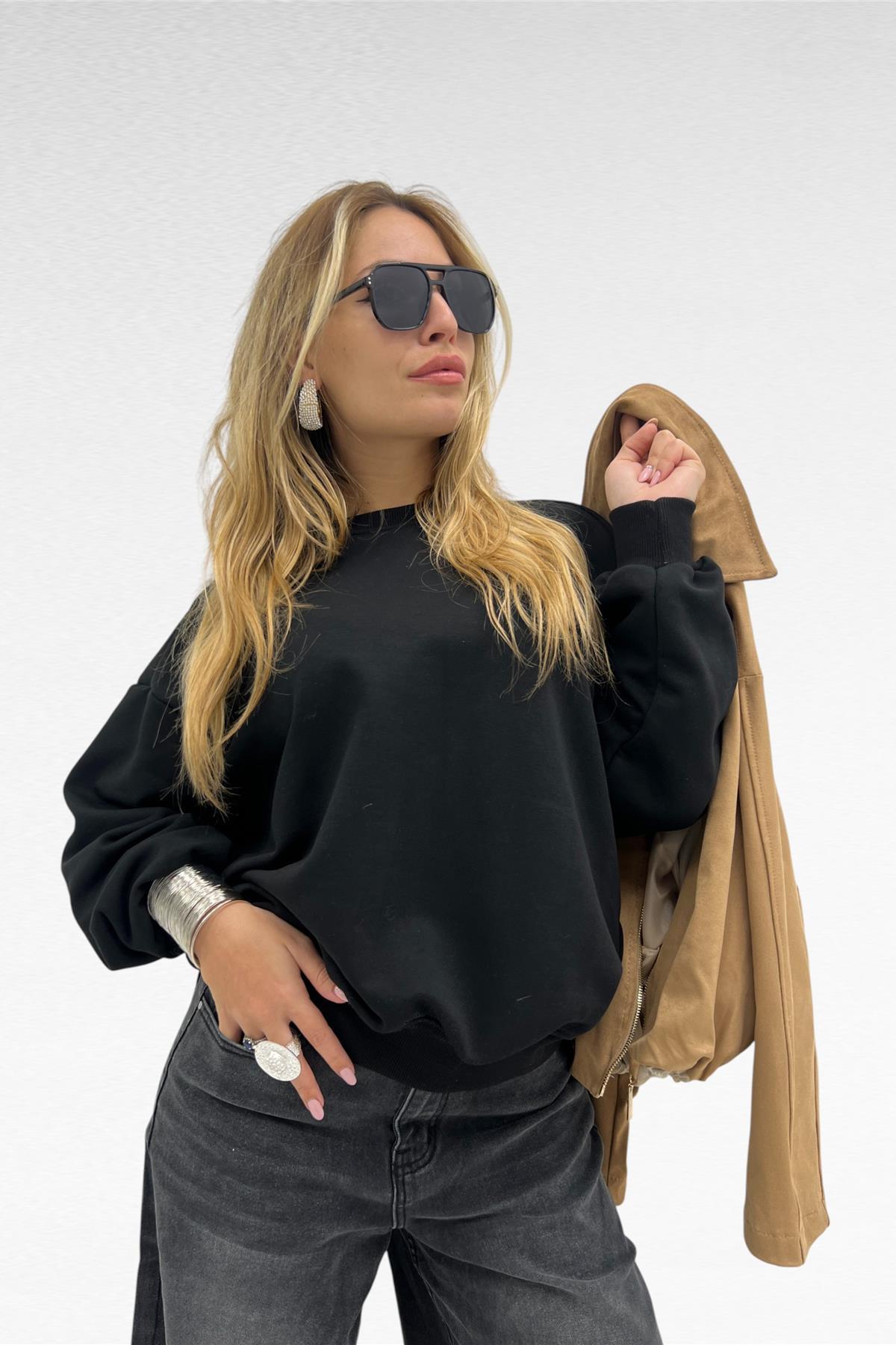 felpa garzata paricollo, elasticizzata, con polsino in costina, girocollo in costina e balza sul fondo in costina.