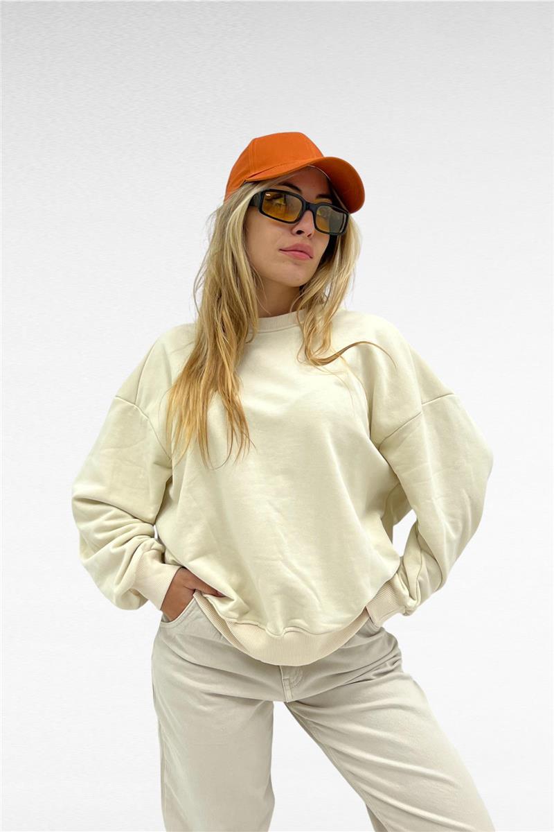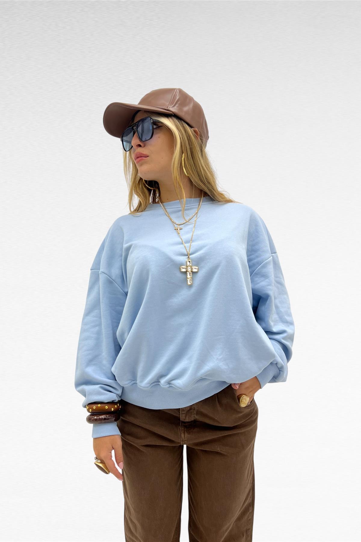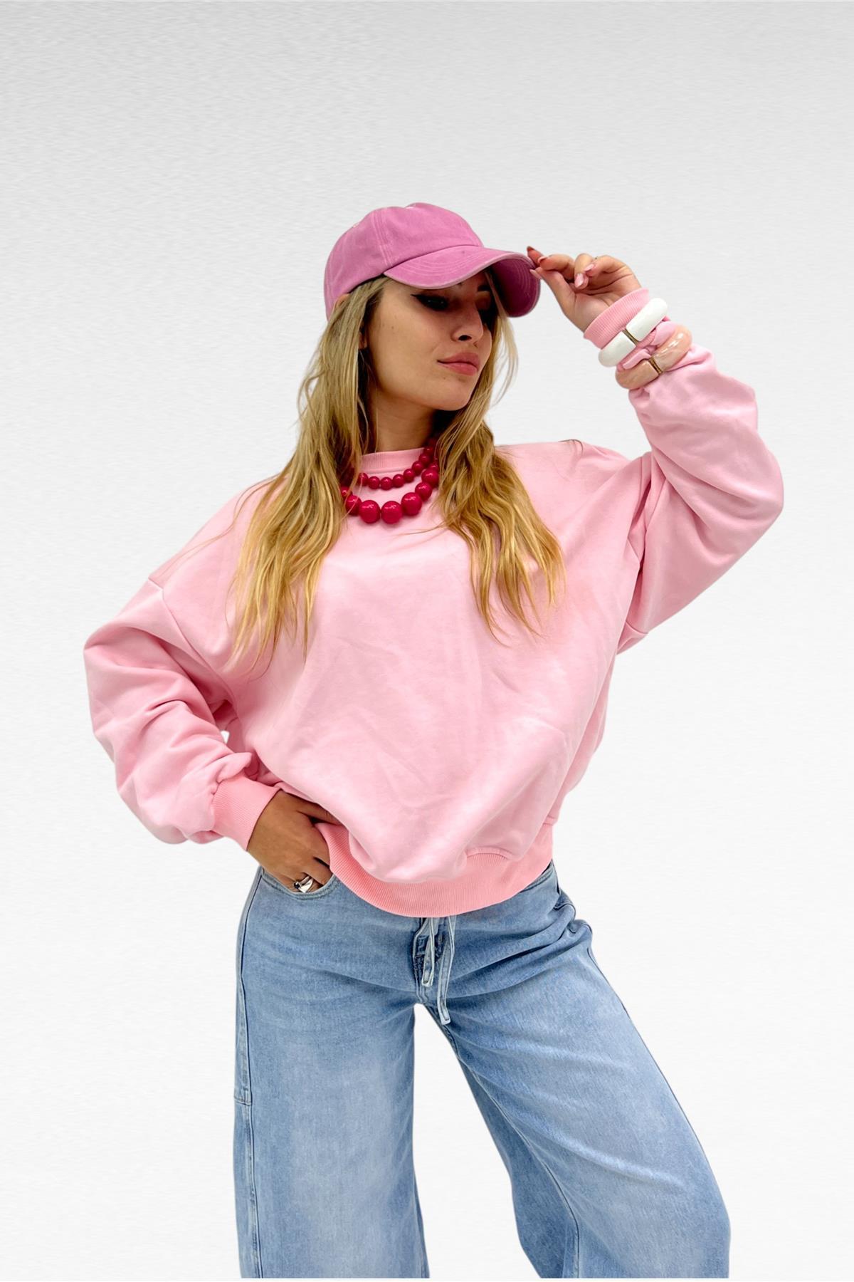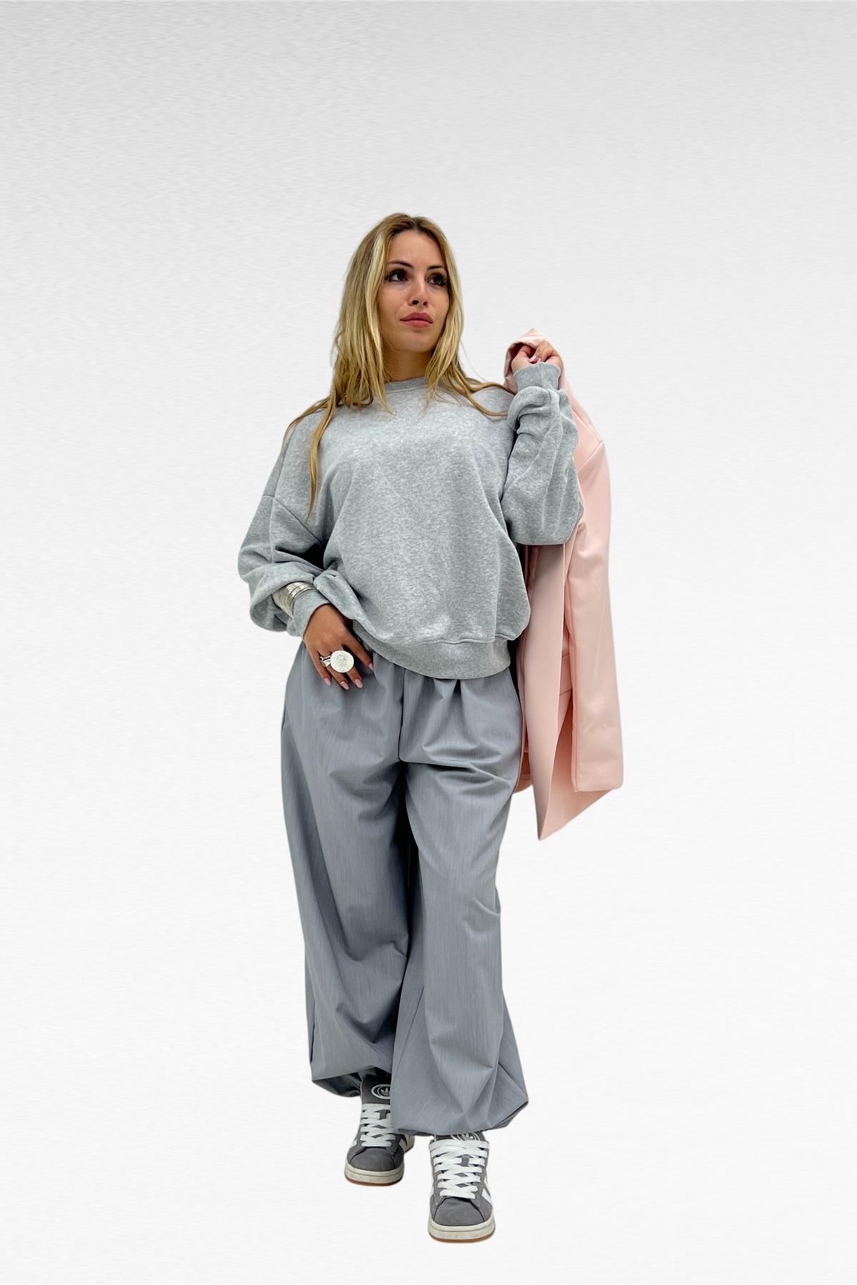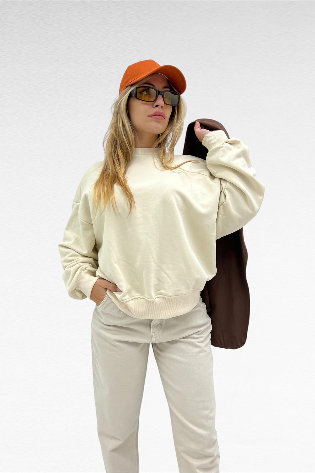 felpa garzata paricollo, elasticizzata, con polsino in costina, girocollo in costina e balza sul fondo in costina.