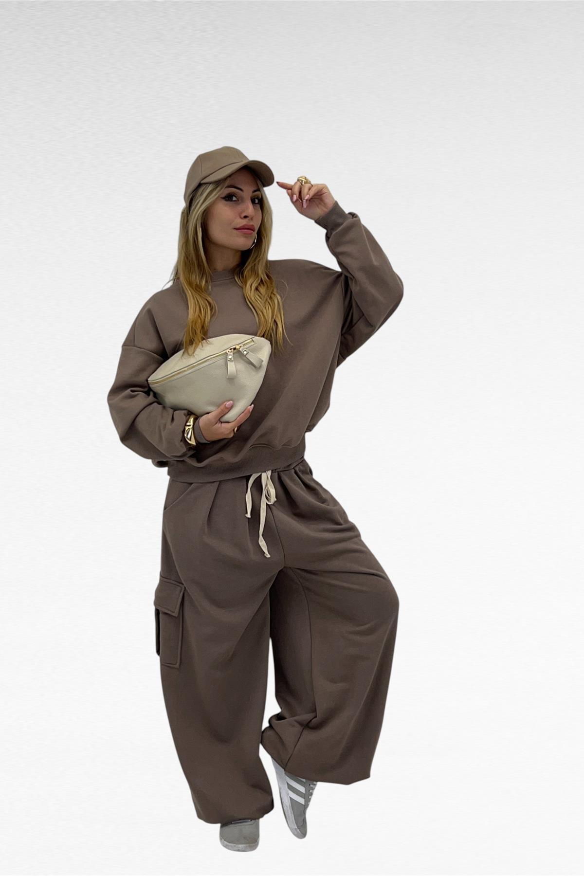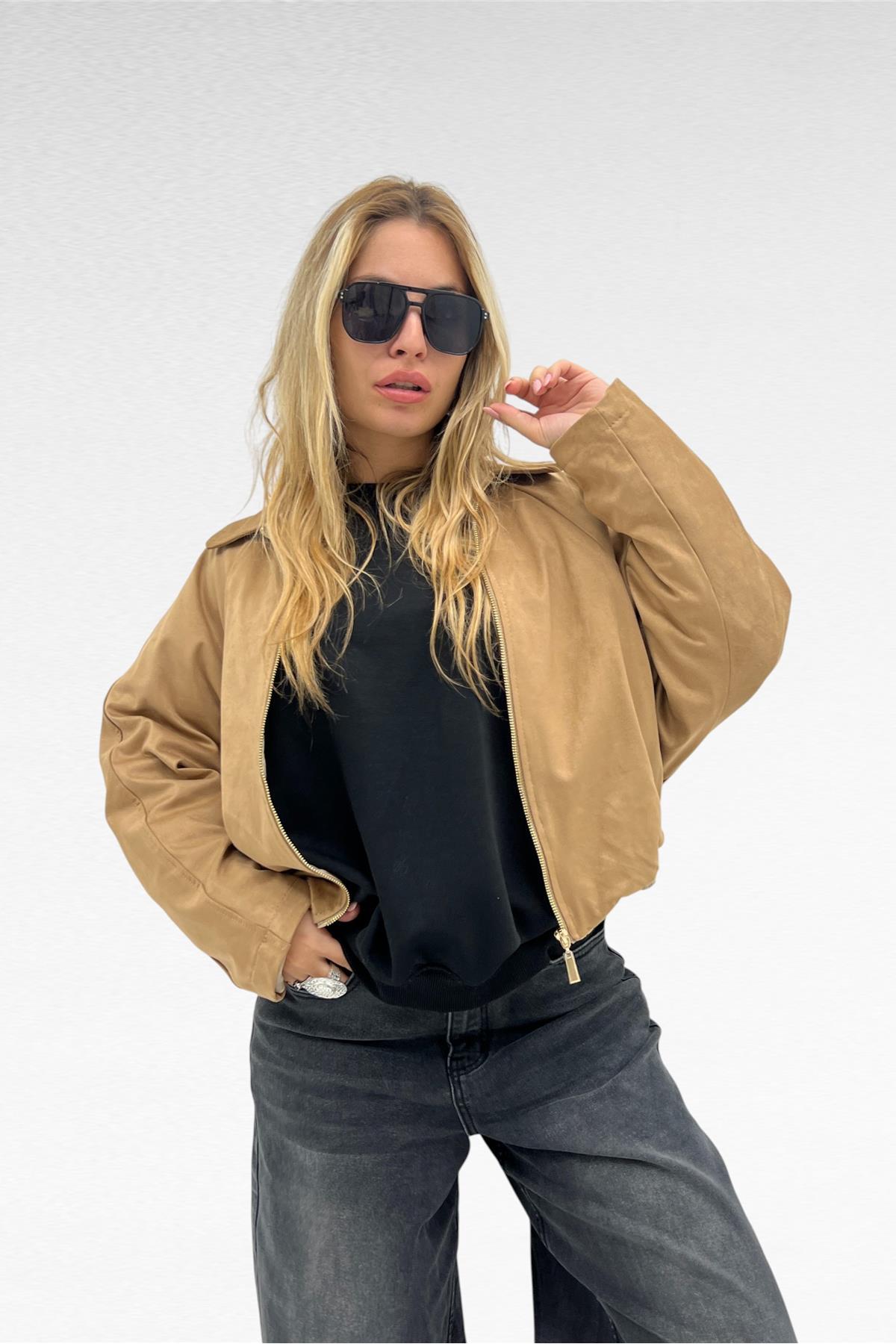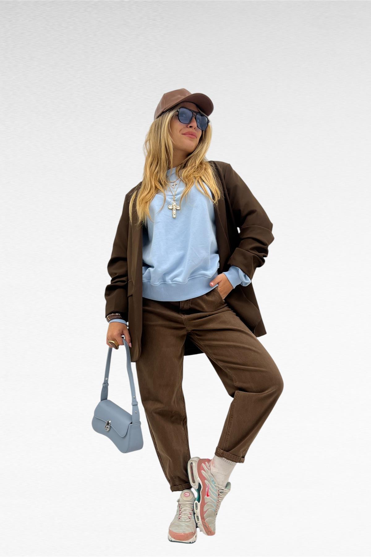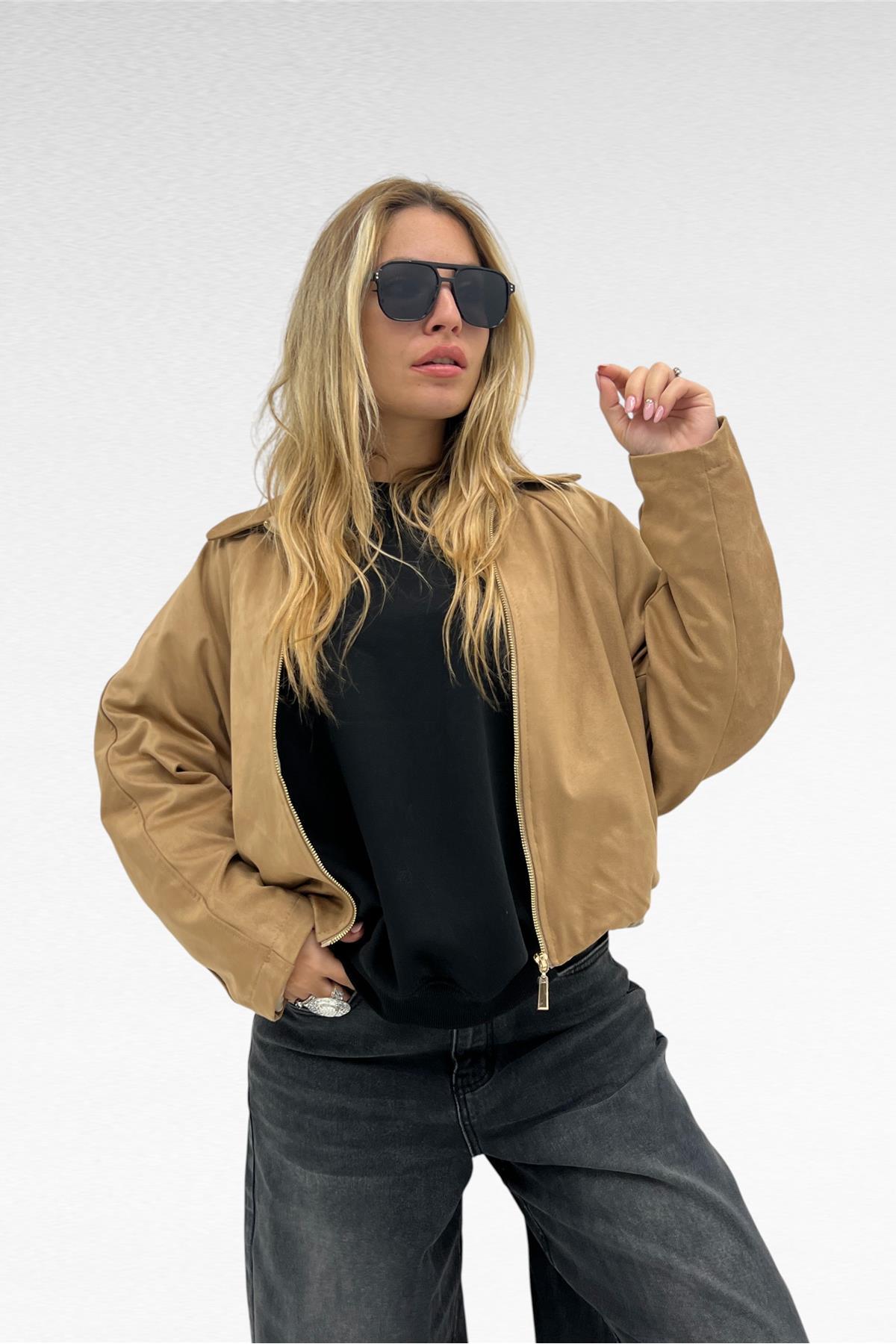 felpa garzata paricollo, elasticizzata, con polsino in costina, girocollo in costina e balza sul fondo in costina.