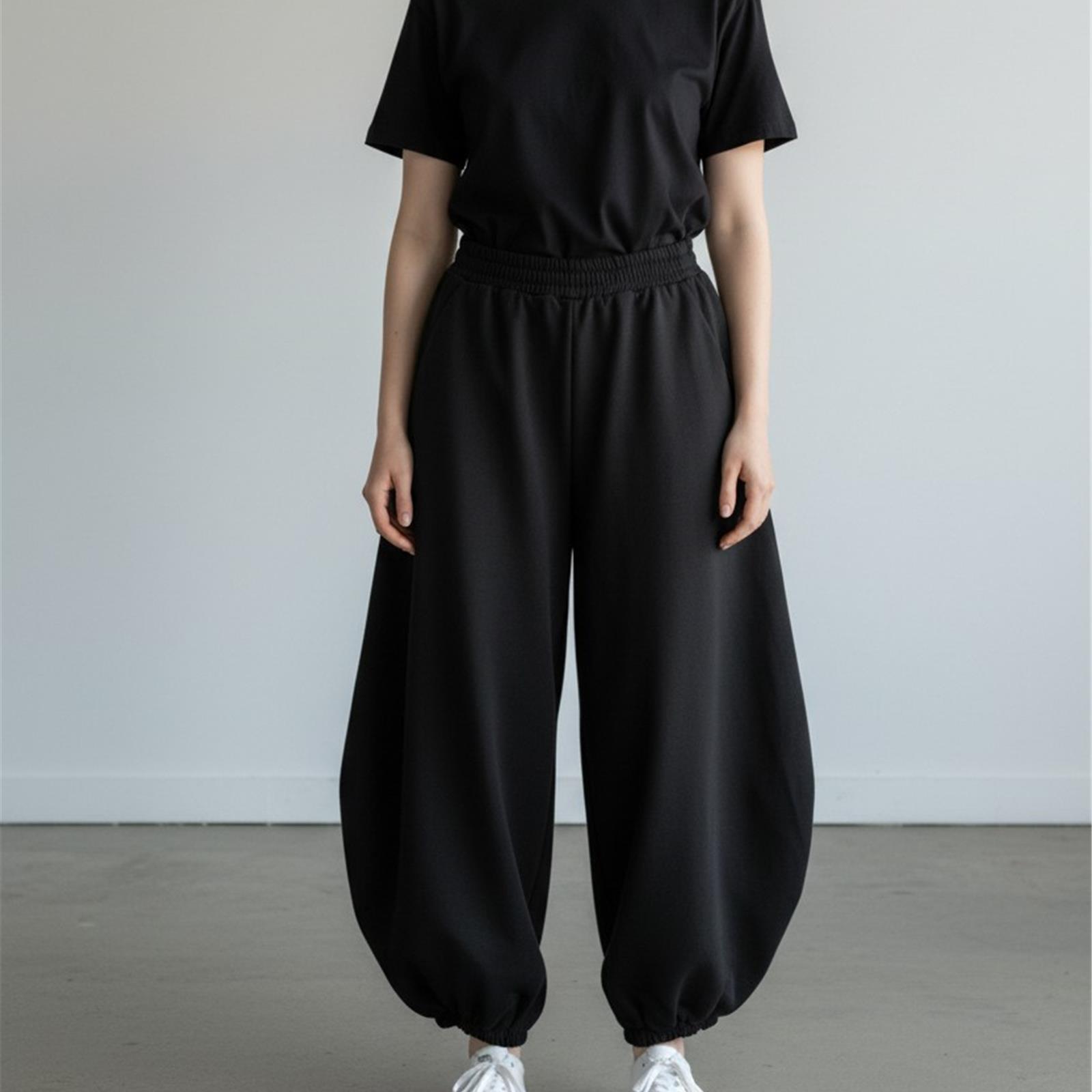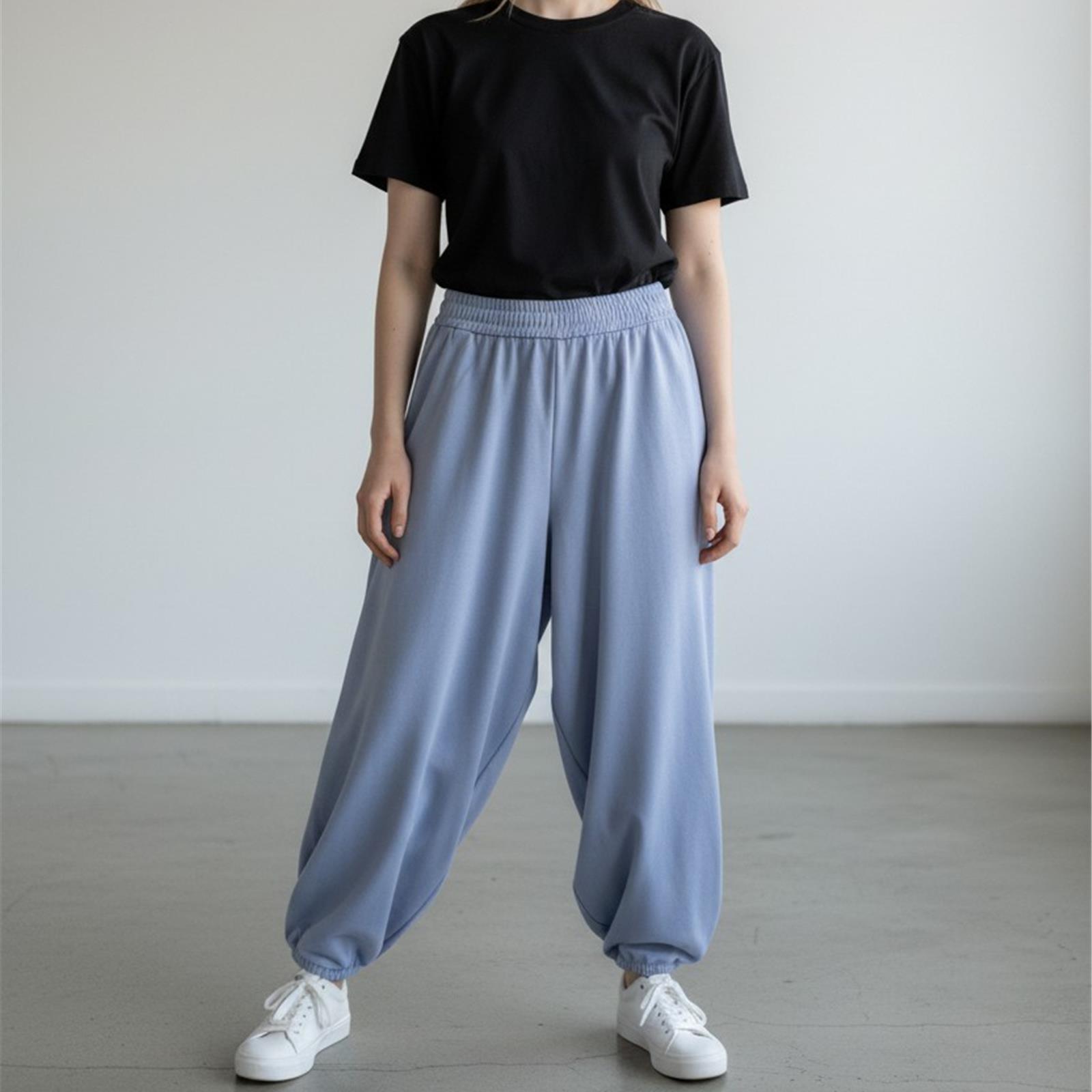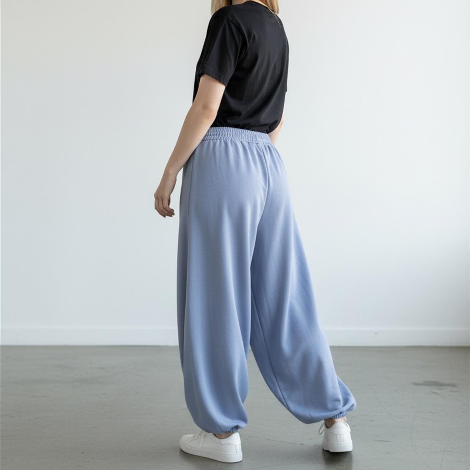 Pantalone modello balloon garzato con tasche laterali, elastico in vita e sul fondo.
