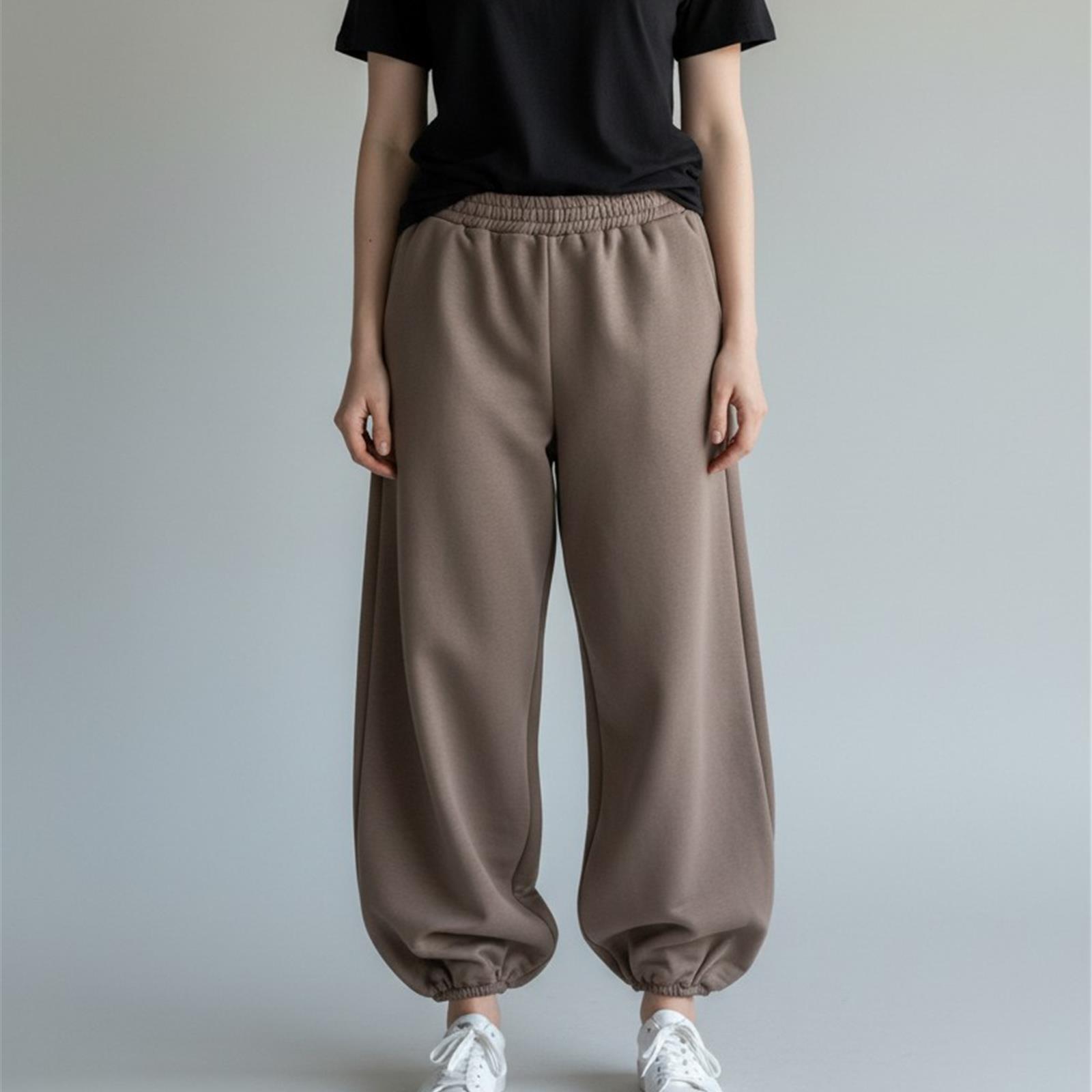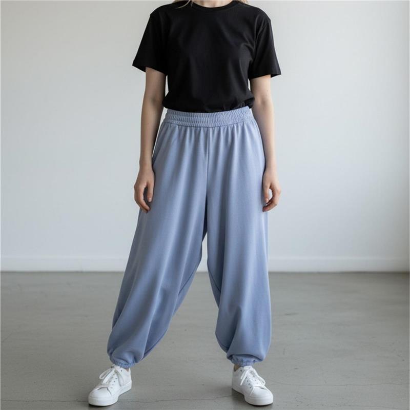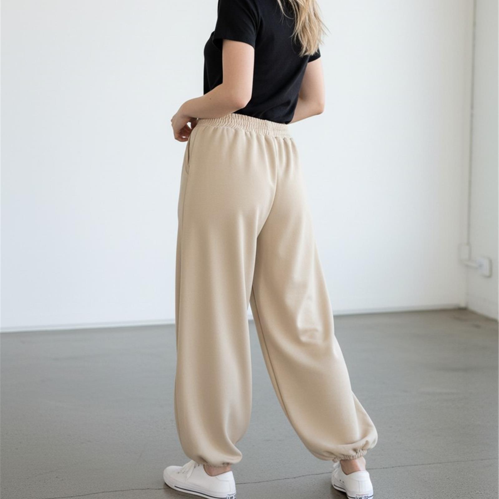 Pantalone modello balloon garzato con tasche laterali, elastico in vita e sul fondo.