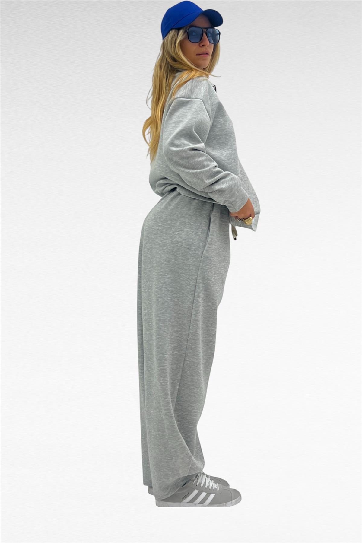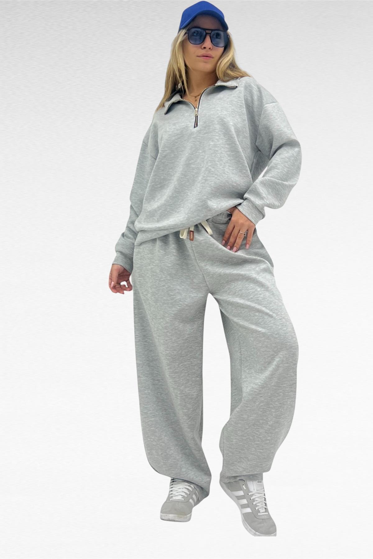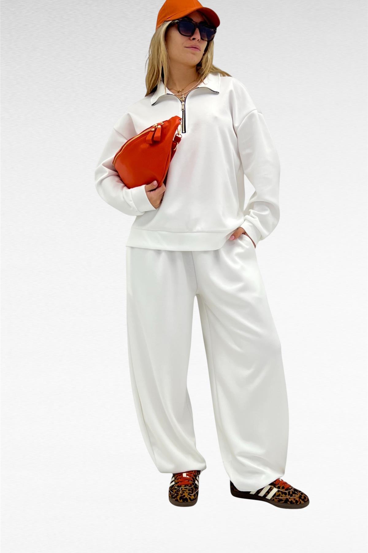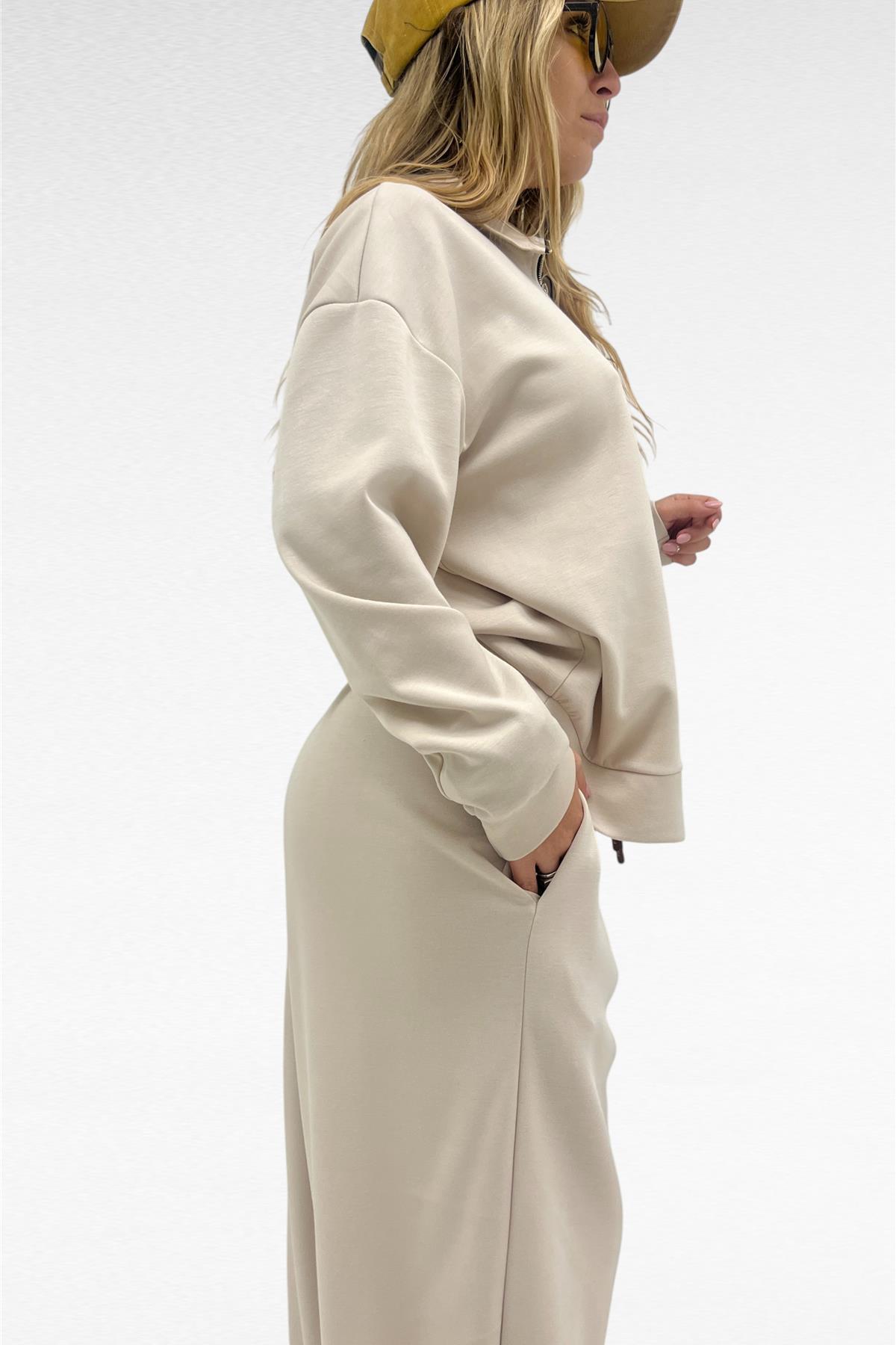 Completo due pezzi con felpa mezza zip e pantalone gamba larga con elastico in vita e laccio regolabile, tessuto elasticizzato.