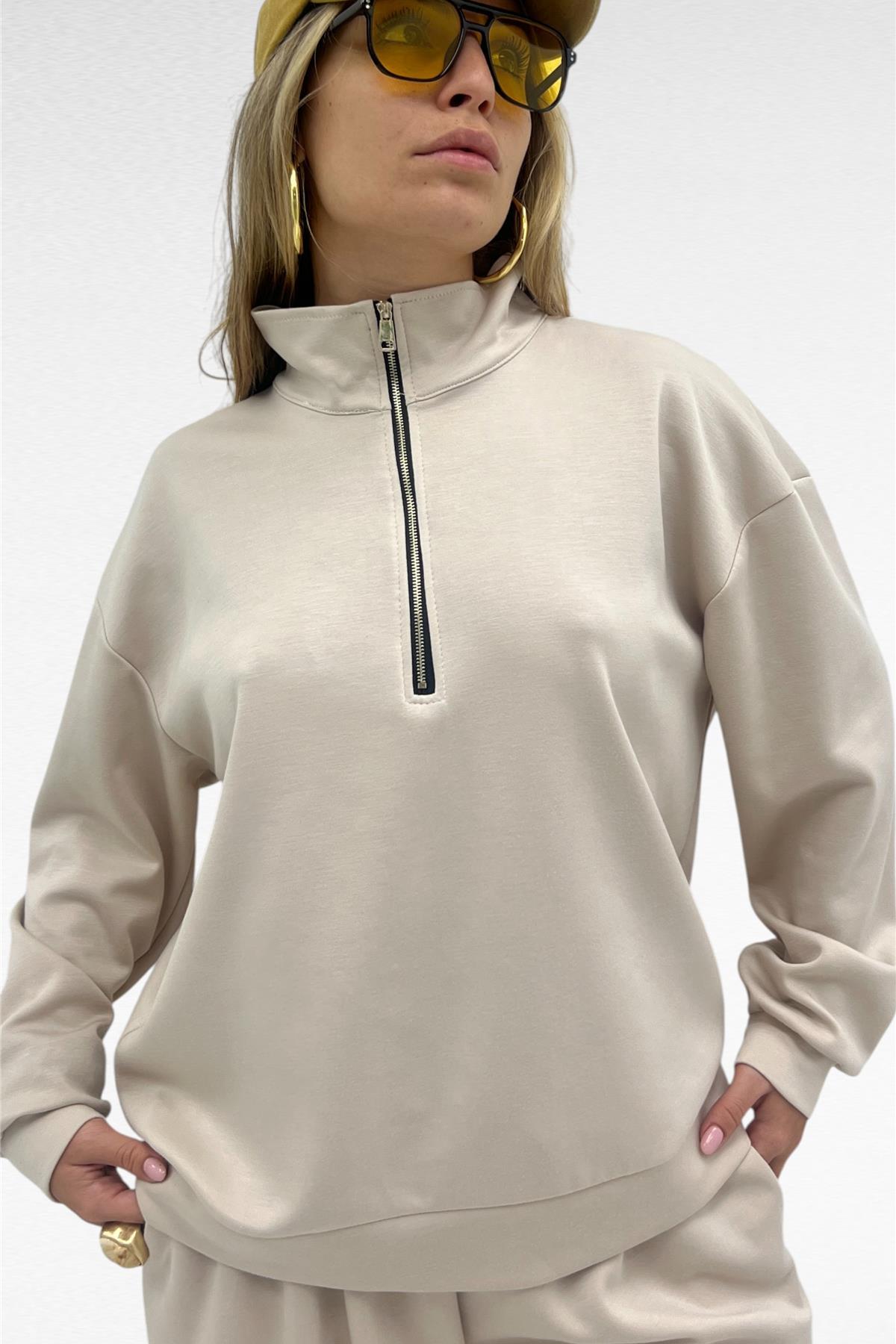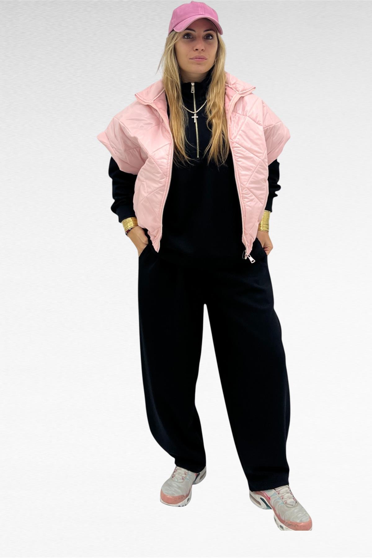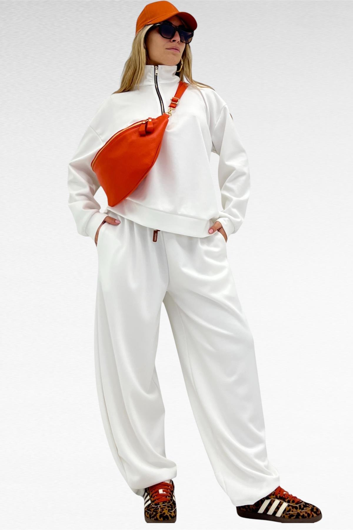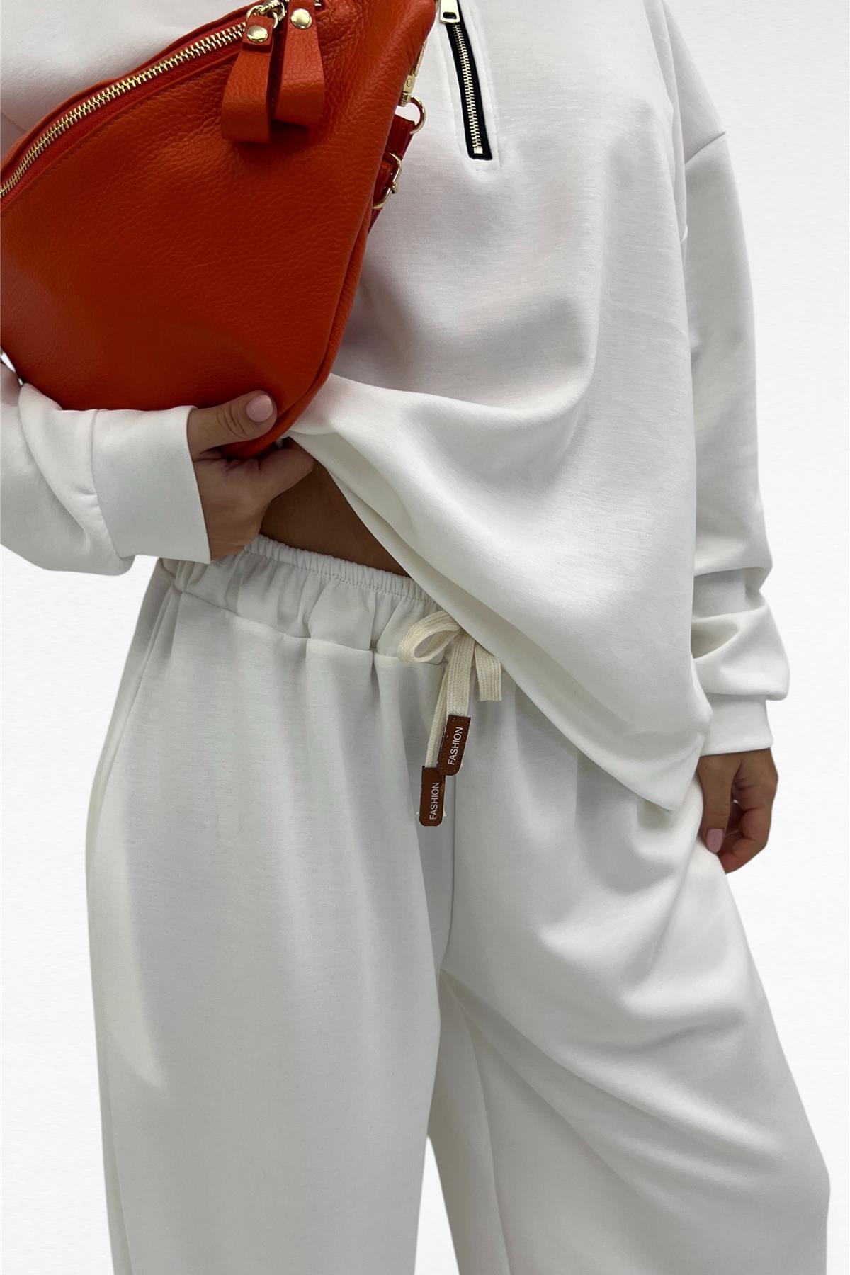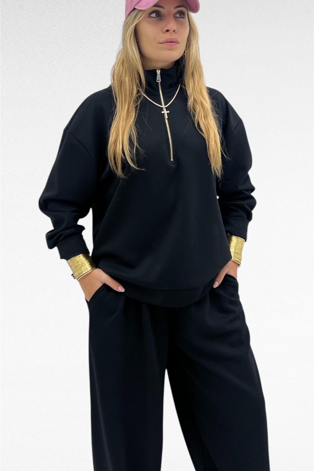 Completo due pezzi con felpa mezza zip e pantalone gamba larga con elastico in vita e laccio regolabile, tessuto elasticizzato.