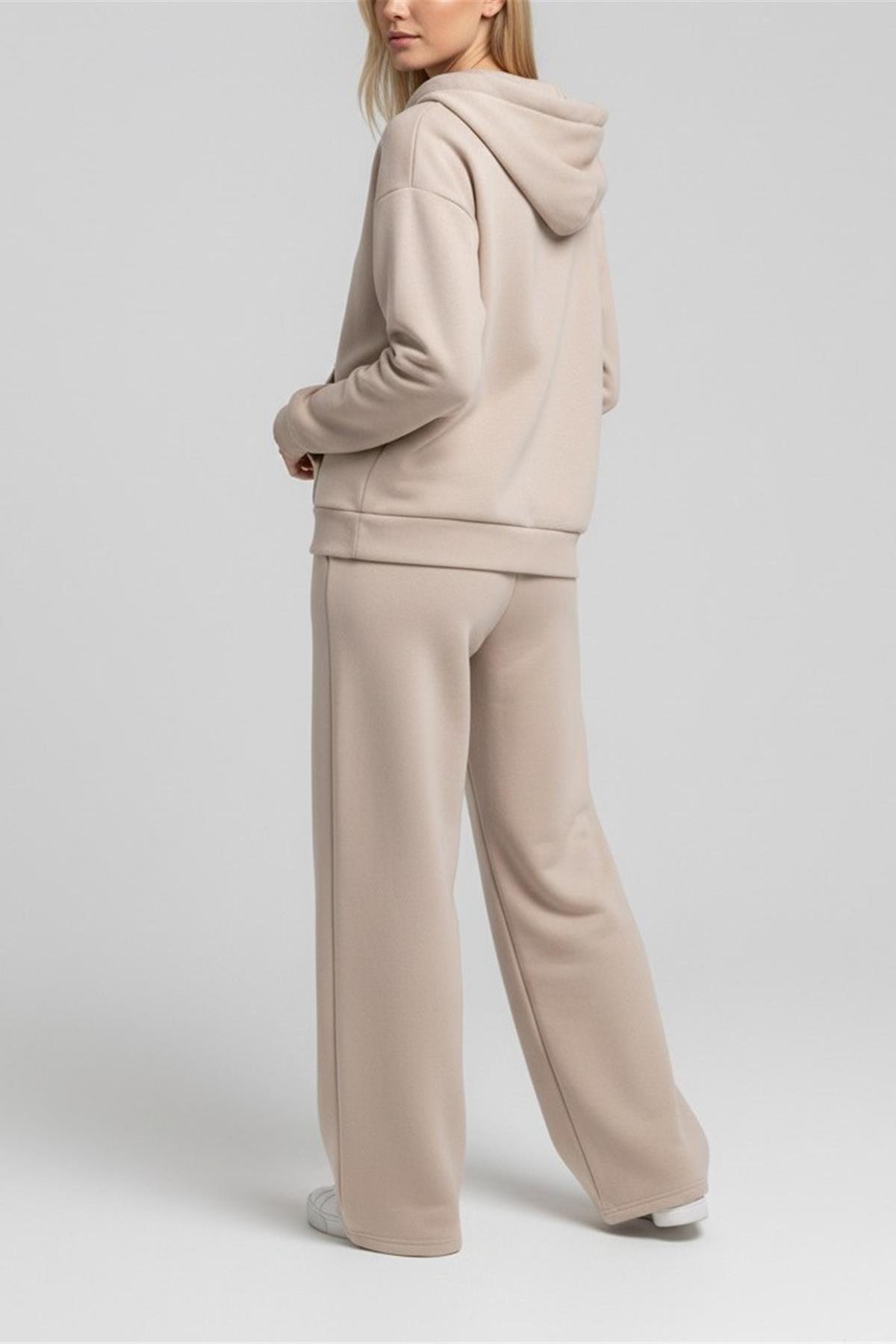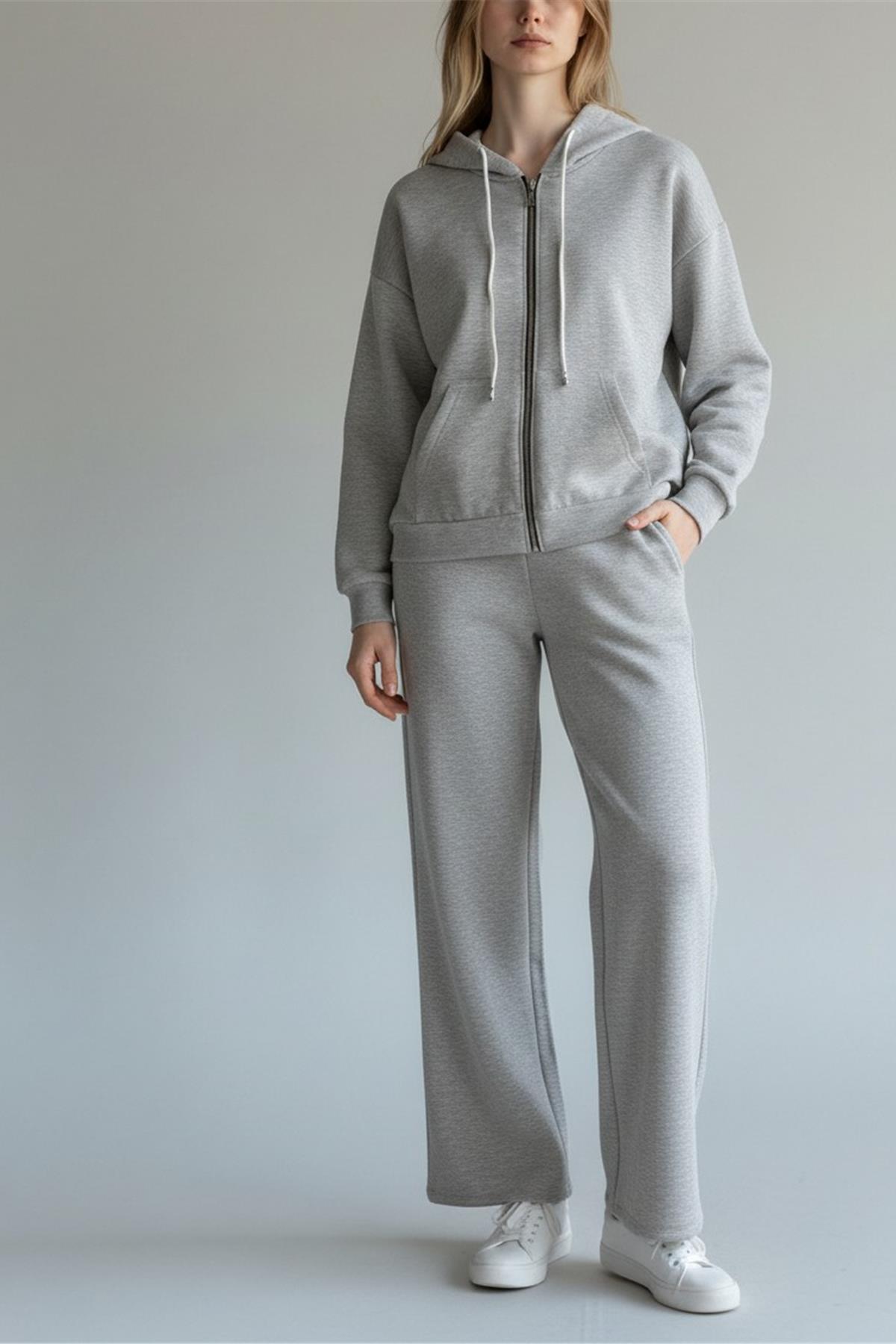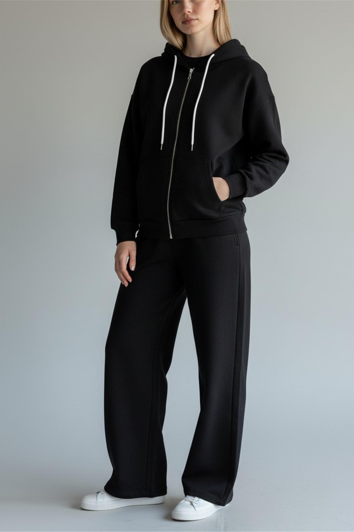 Tuta sportiva in tessuto bielastico,composta da felpa con cappuccio, zip e tasche funzionali sul davanti e pantalone dritto con elastico morbido in vita, tasche laterali