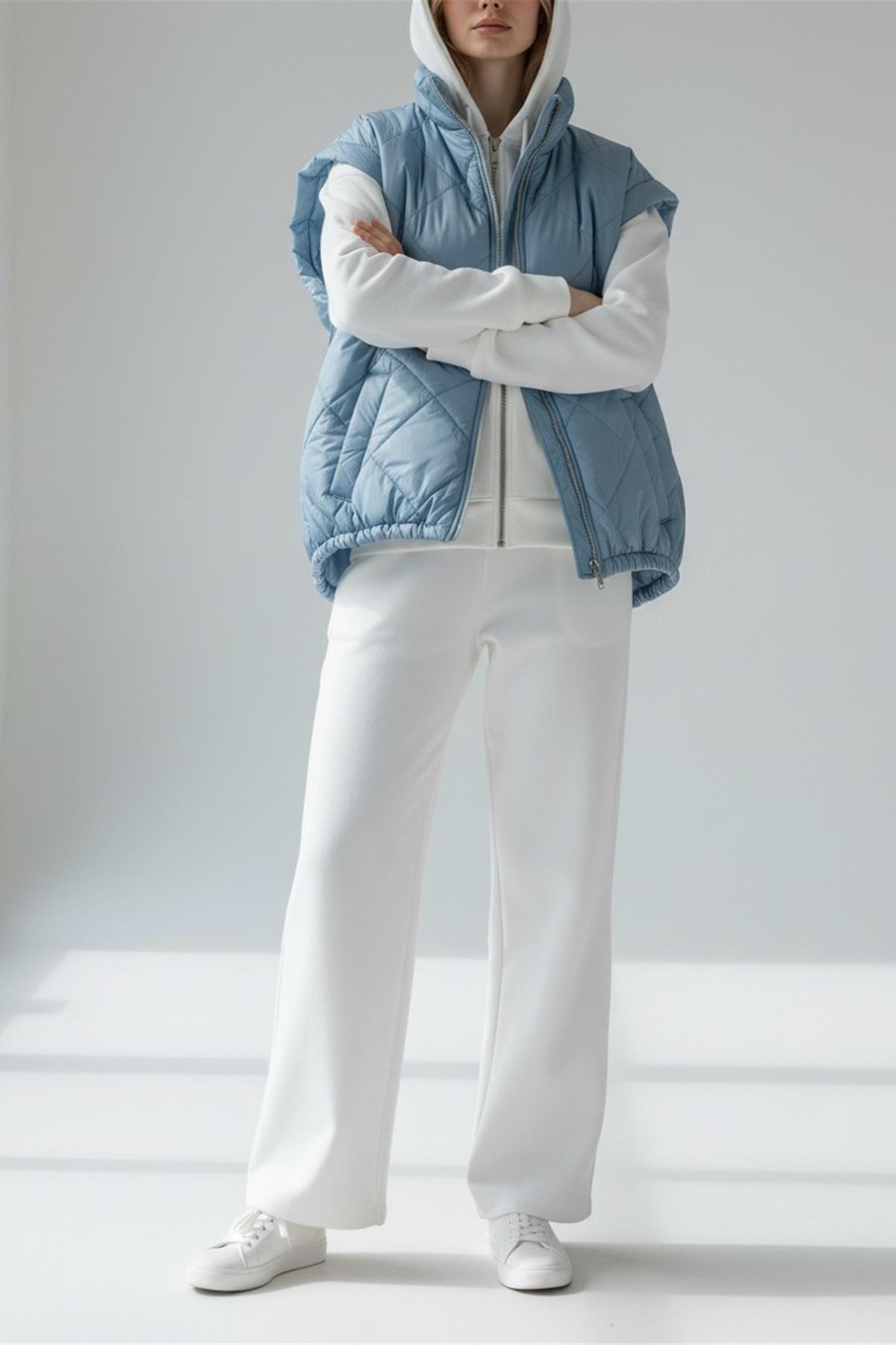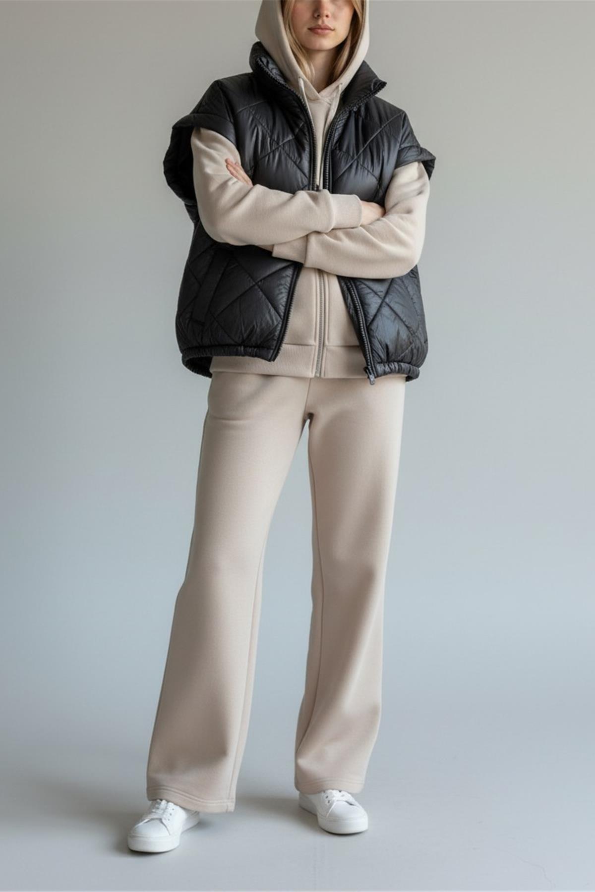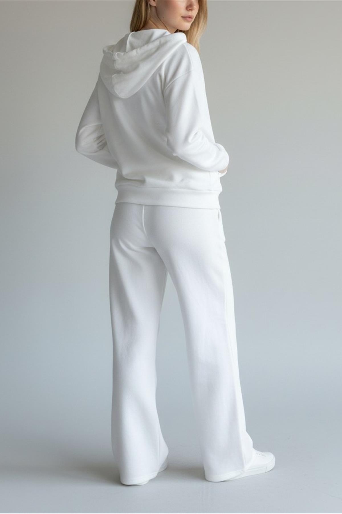 Tuta sportiva in tessuto bielastico,composta da felpa con cappuccio, zip e tasche funzionali sul davanti e pantalone dritto con elastico morbido in vita, tasche laterali