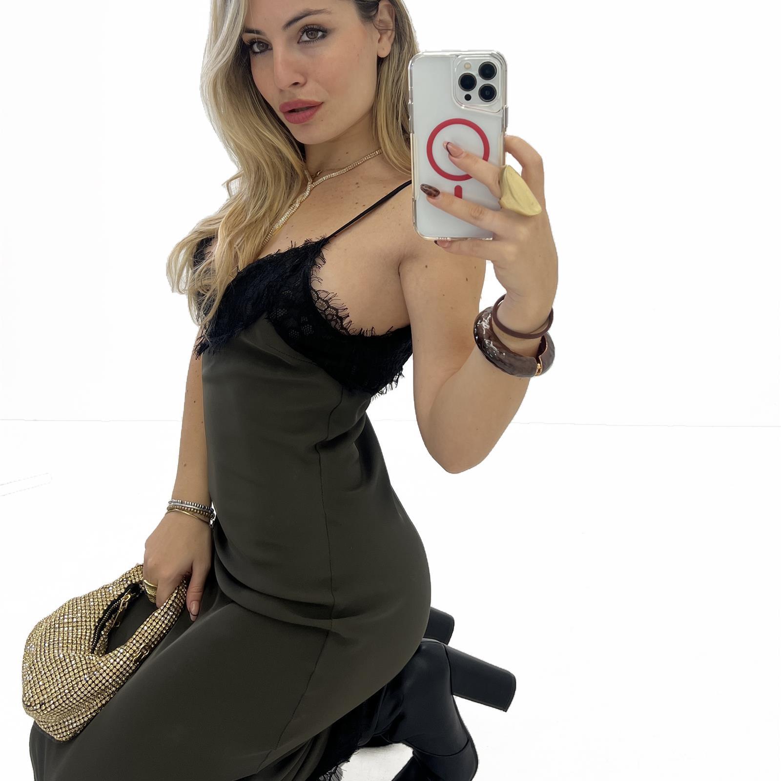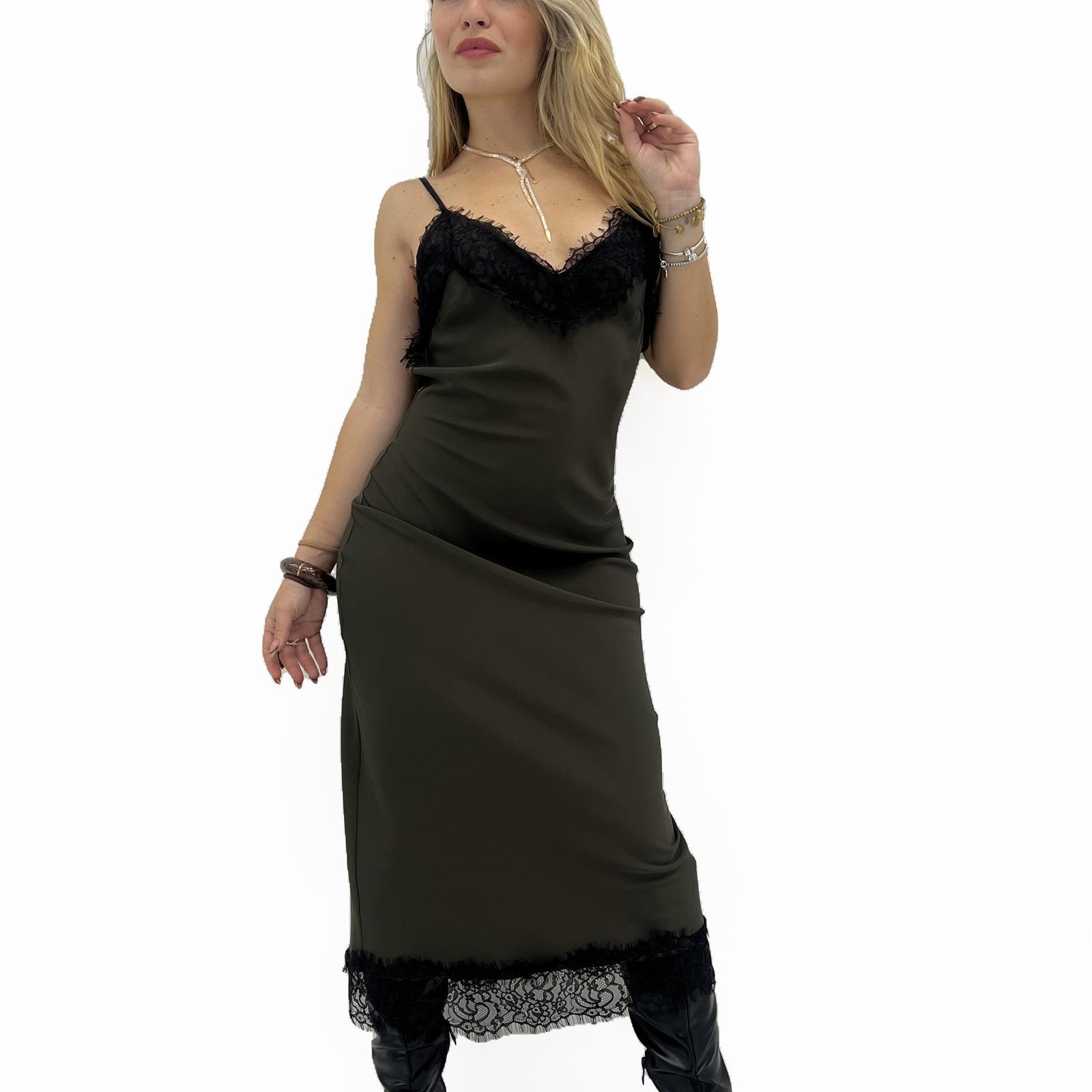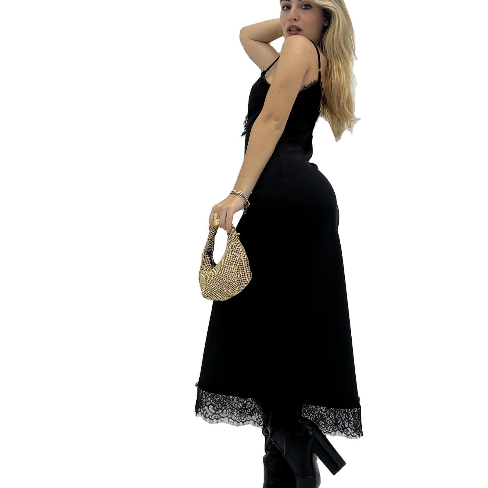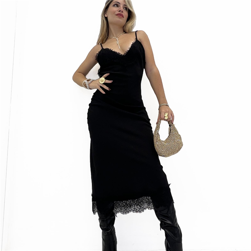 Abito lungo con scollo a V, spalline regolabili e motivi in pizzo sia sulla parte superiore che inferiore