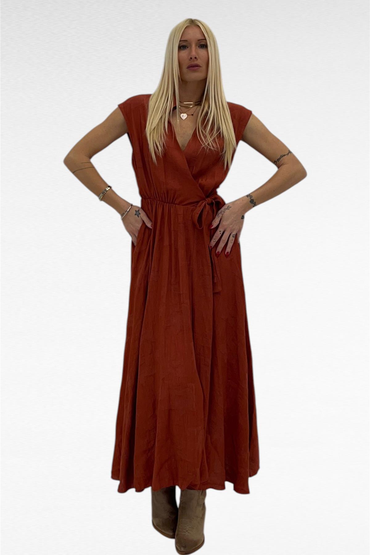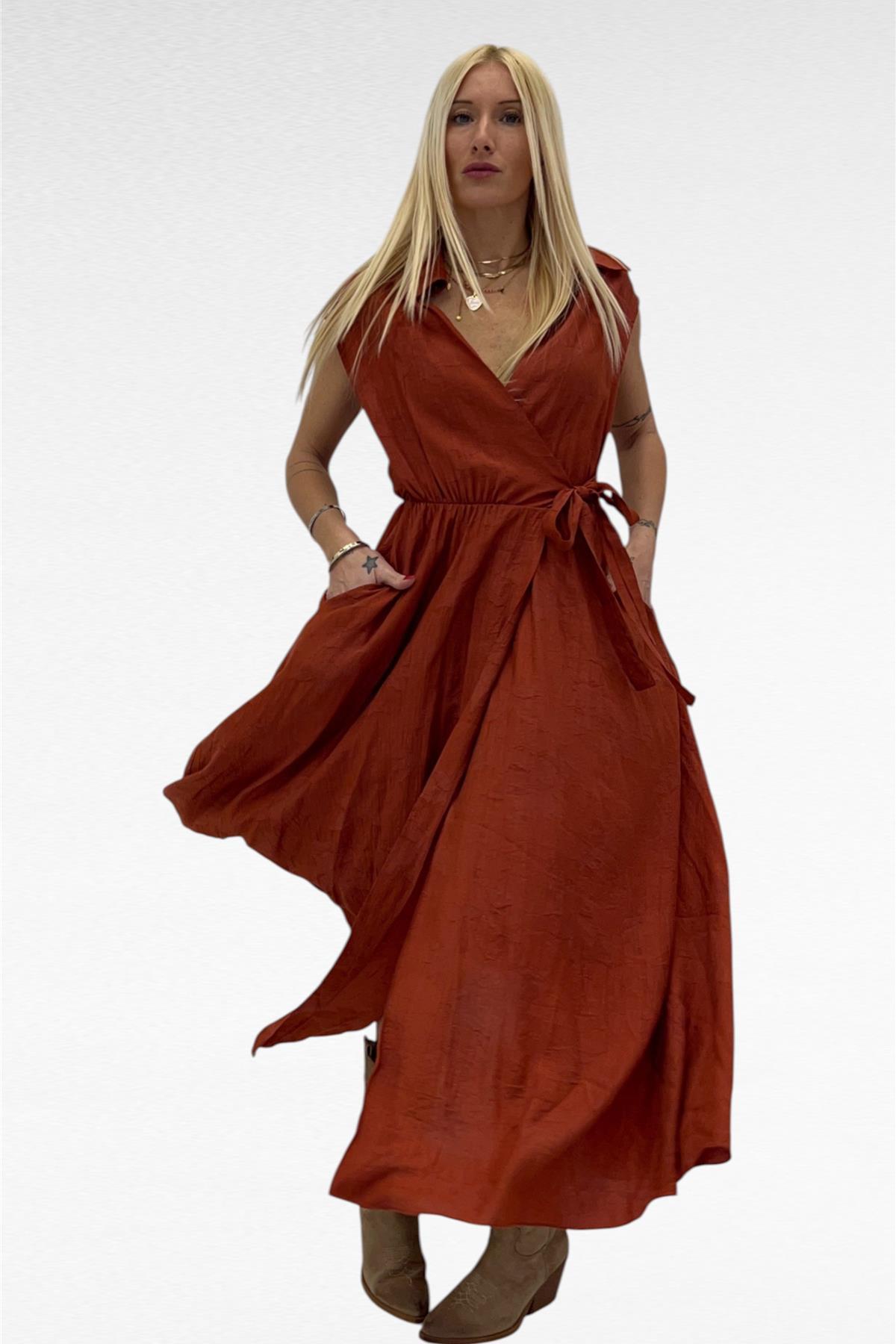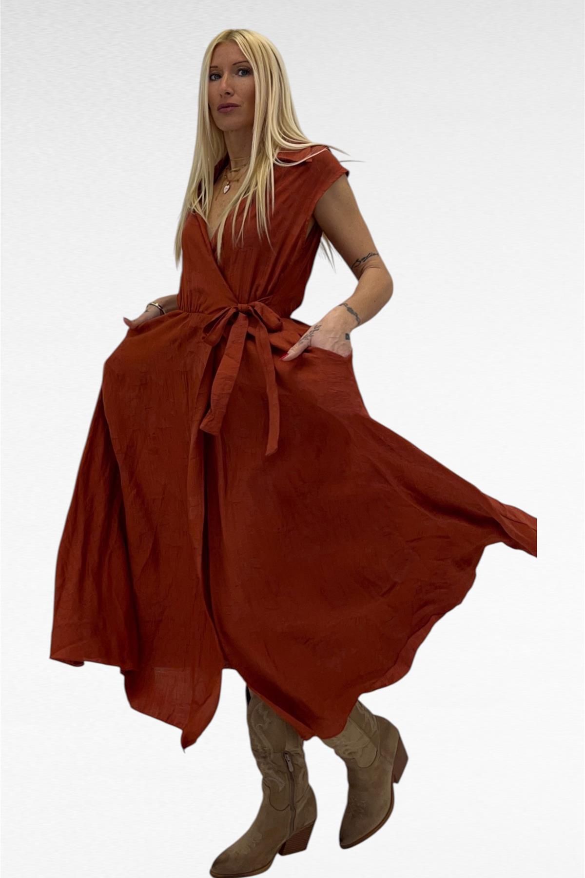 abito con chiusura a portafoglio senza bottoni , tasche laterali ,fantasia floreale leggera tono su tono