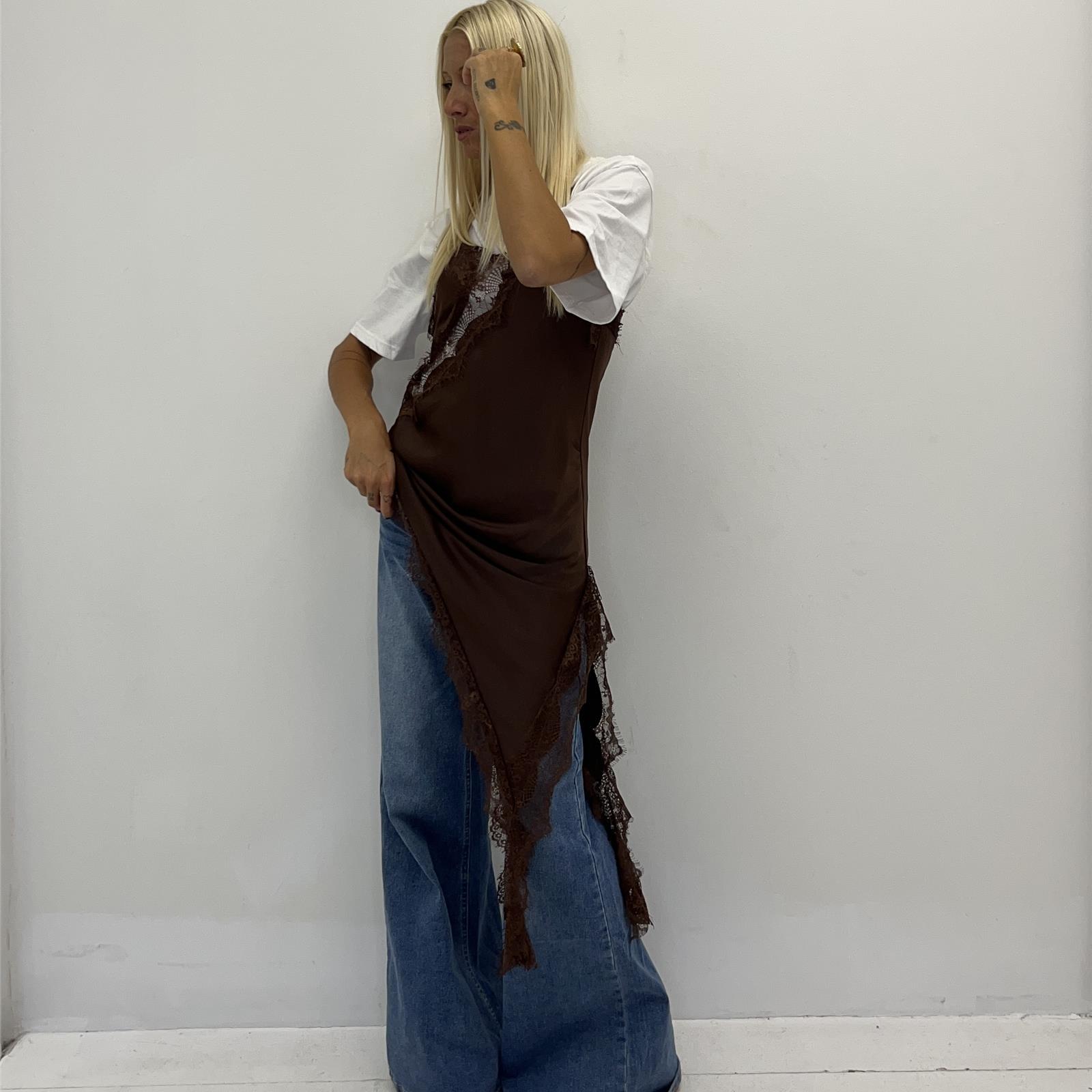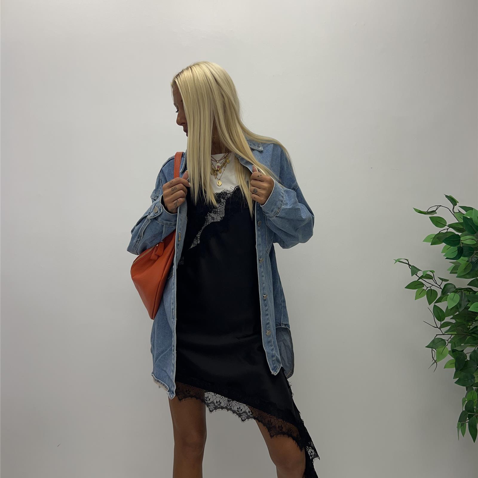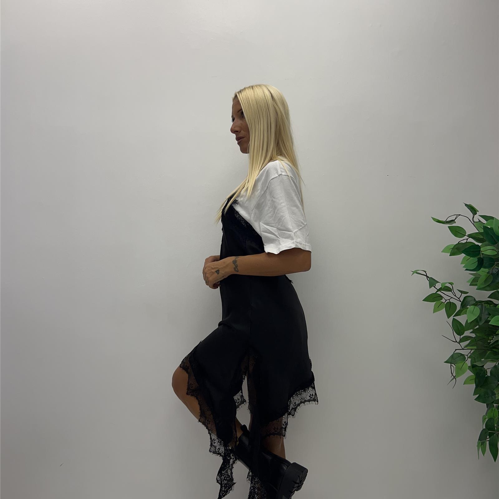 Abito effetto raso spallino fine applicazioni in pizzo asimmetrico