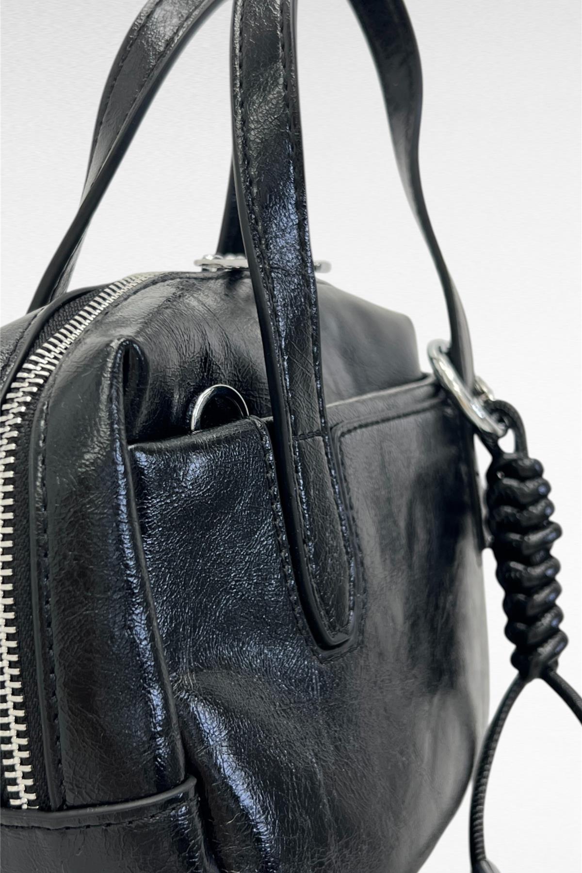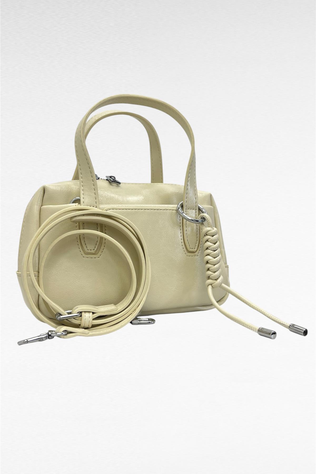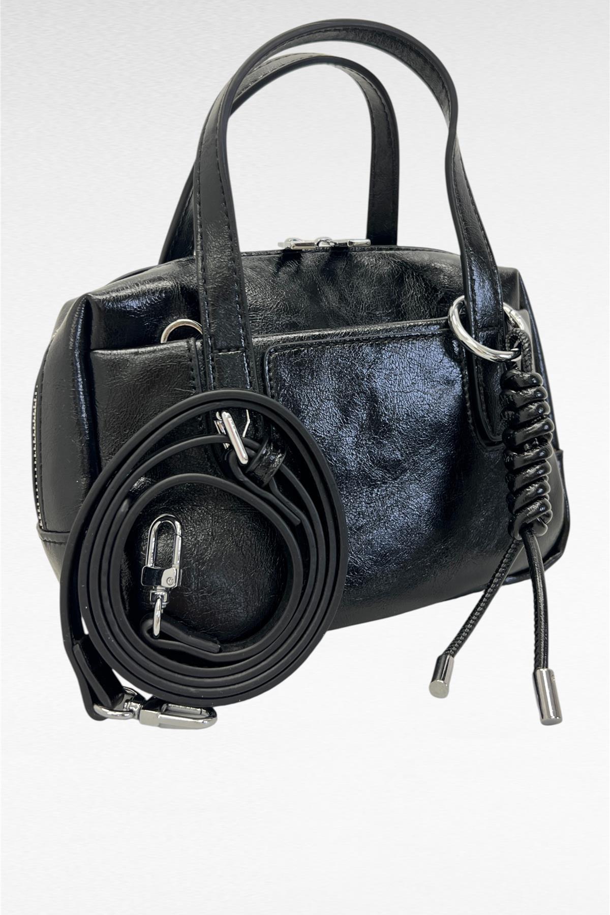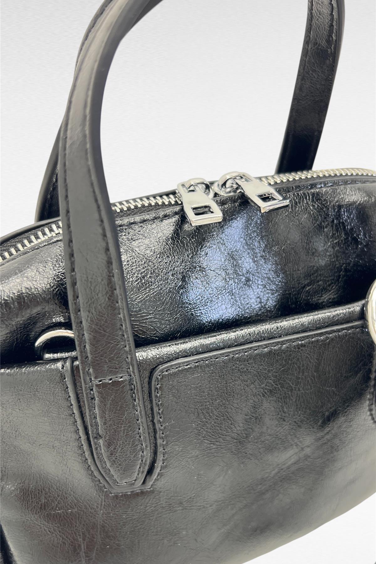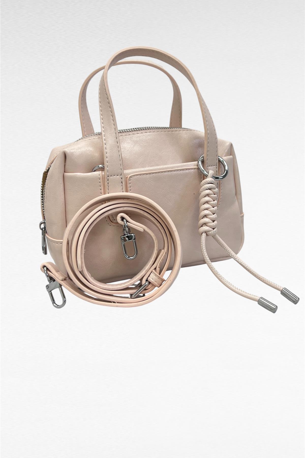 Borsa mini semi rigida in simil pelle con zip di chiusura , portabile a mano oppure a tracolla (regolabile e removible inserita all'interno).