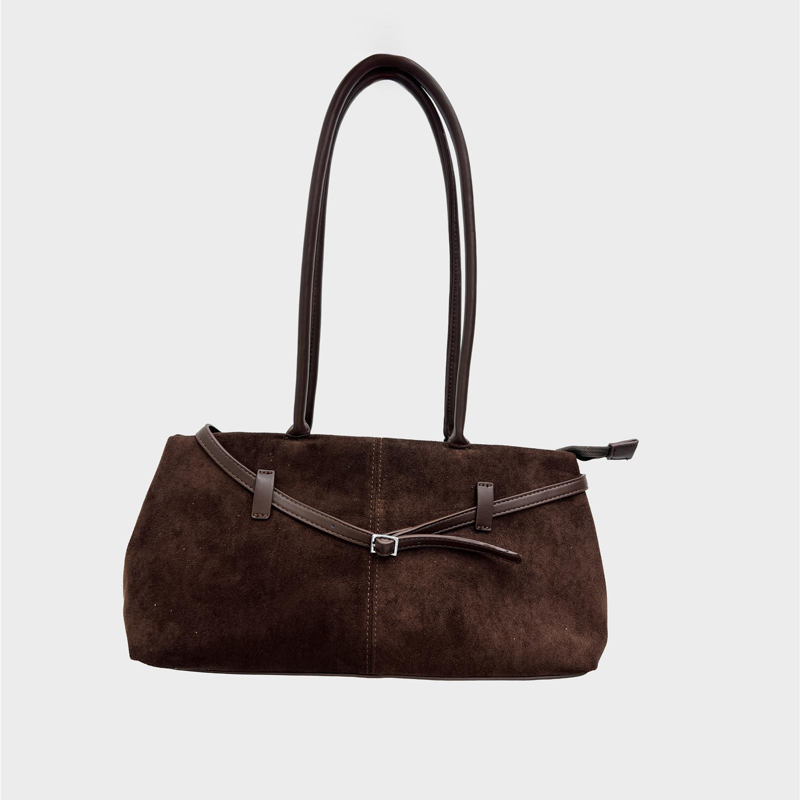Borsa rettangolare in simil camoscio con manici in simil pelle, zip per chiusura e tasche interne