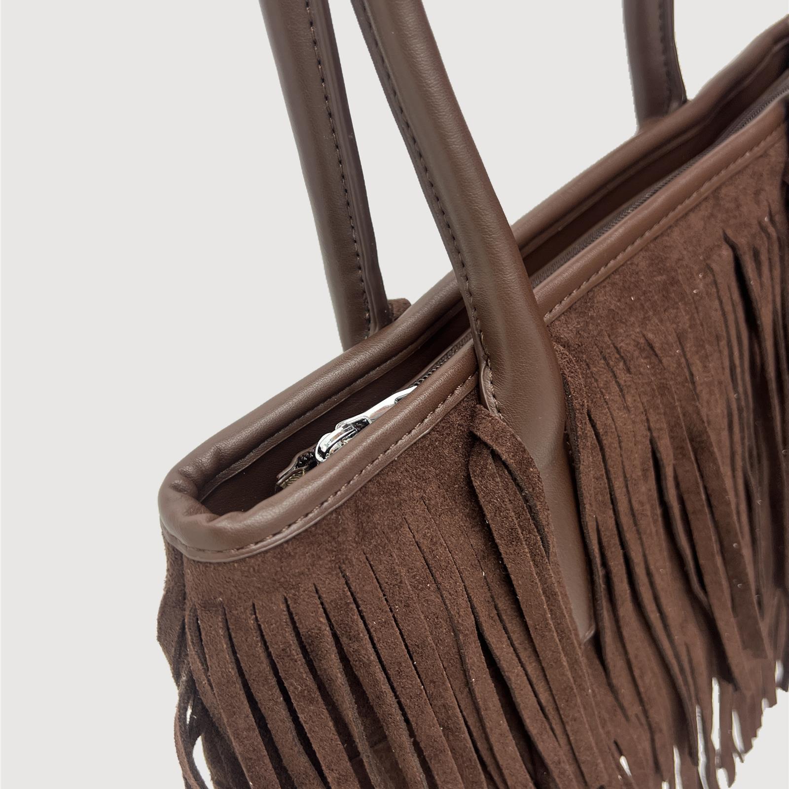 Borsa rettangolare in camoscio, con frange, tracolla a mano, due tasche interne e chiusura con cerniera.