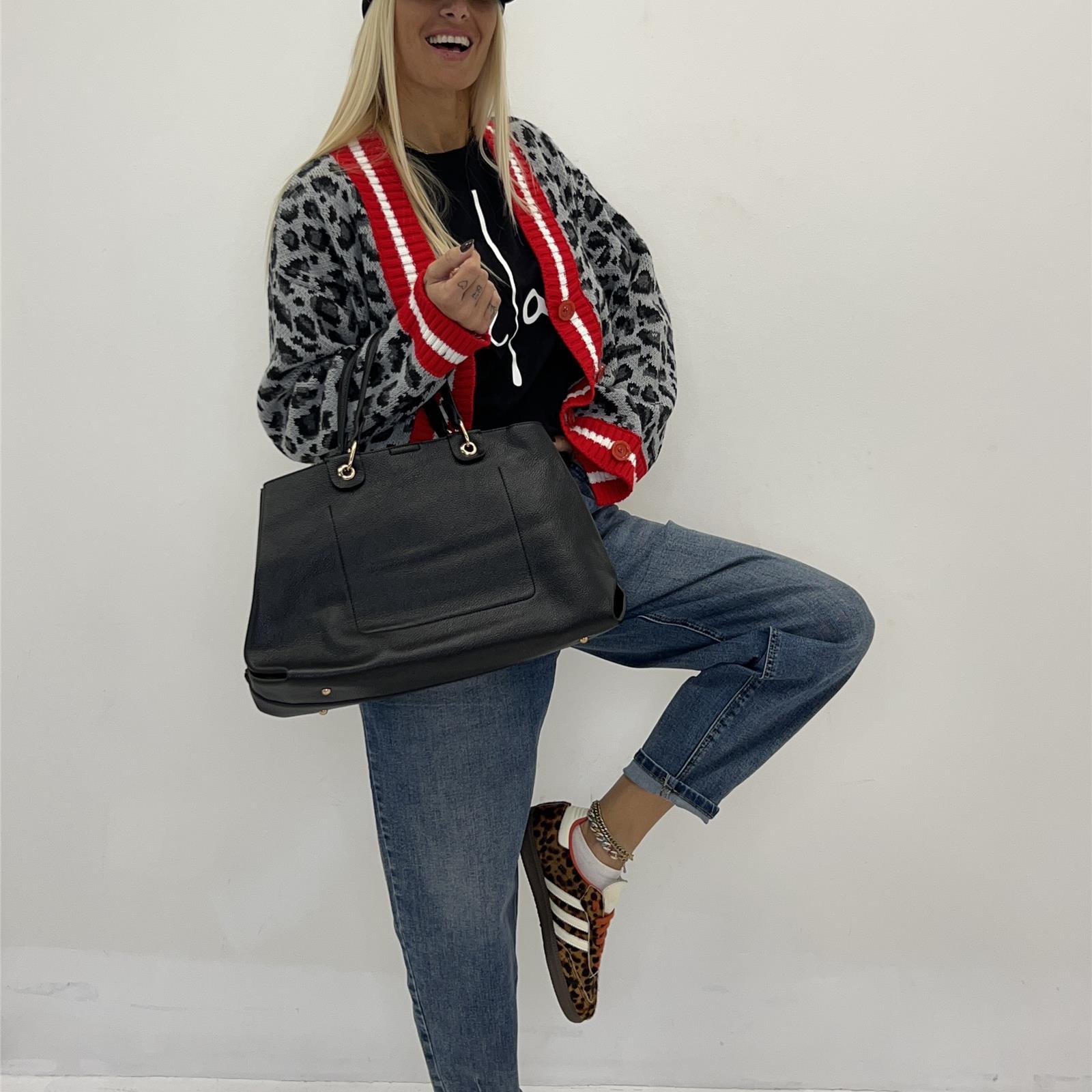 Borsa simil pelle rigida con tracolla removibile e regolabile , tasca interna nel mezzo con zip , con bottone per chiusura