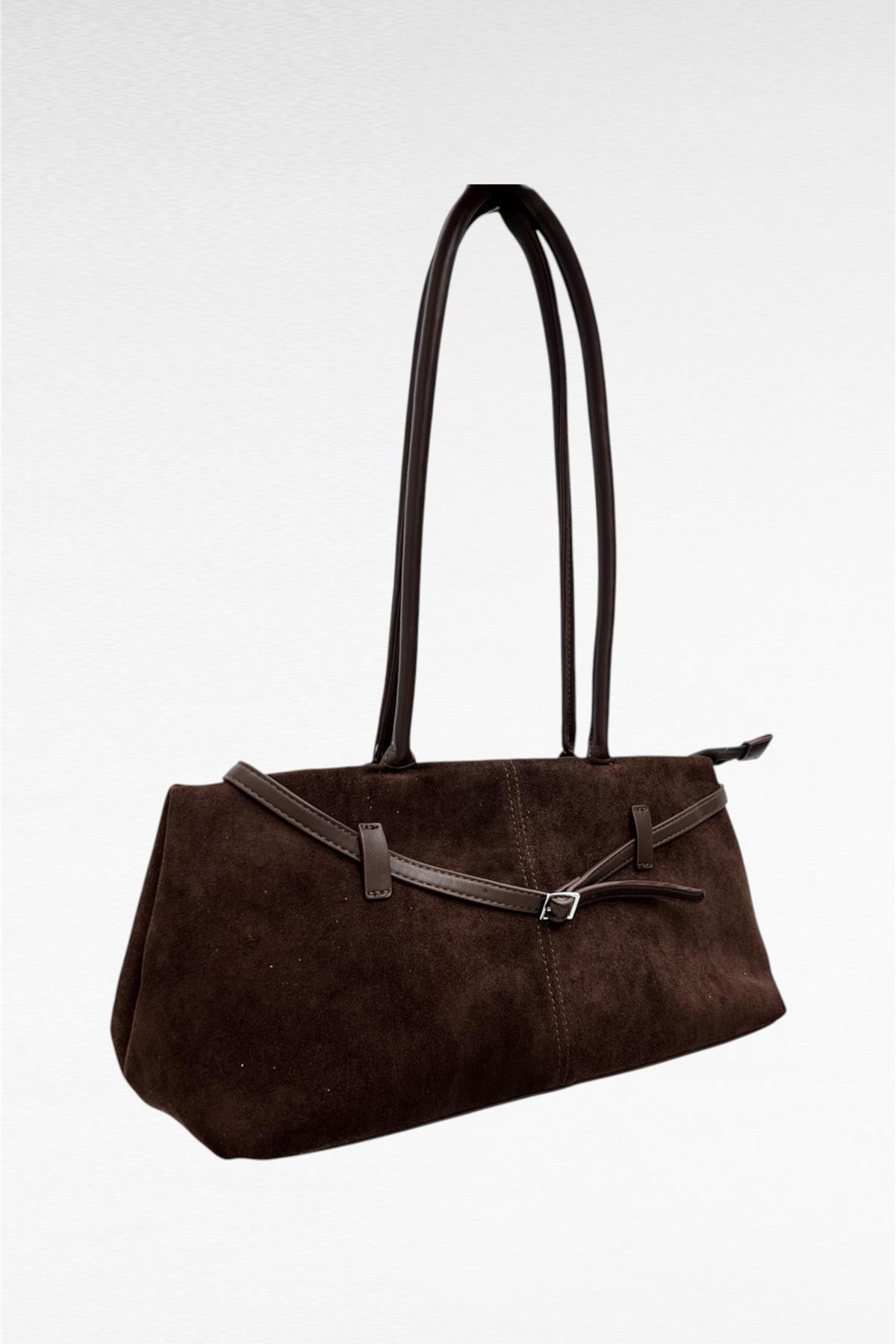 Borsa rettangolare in simil camoscio con manici in simil pelle, zip per chiusura e tasche interne
