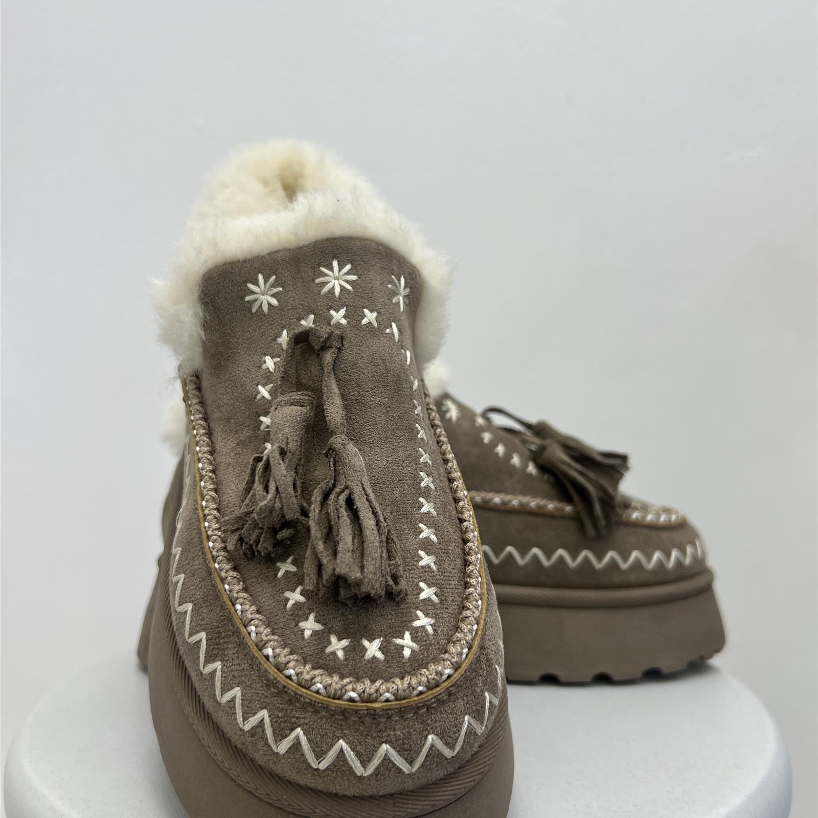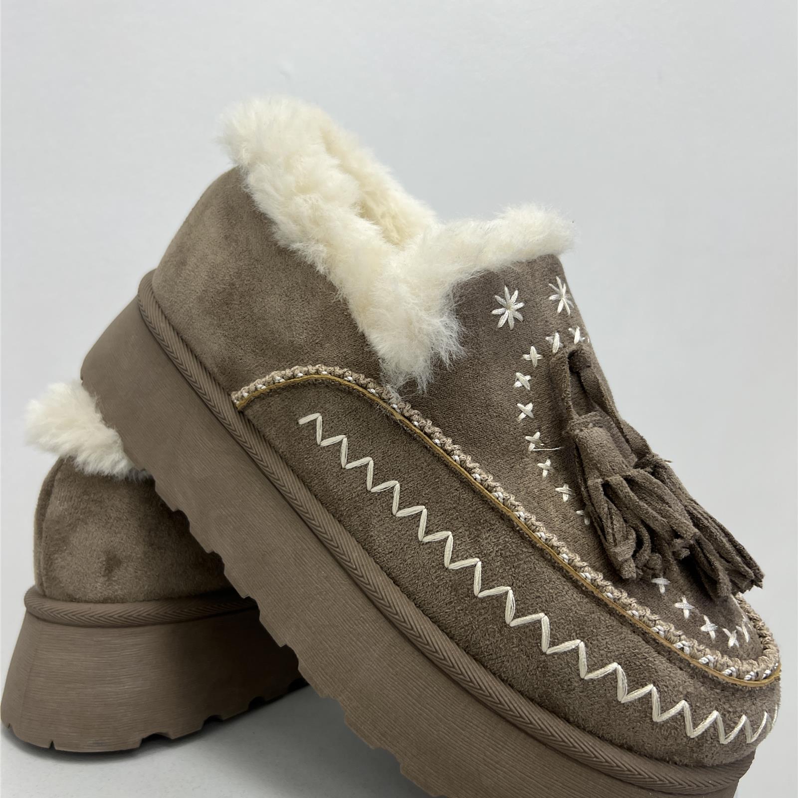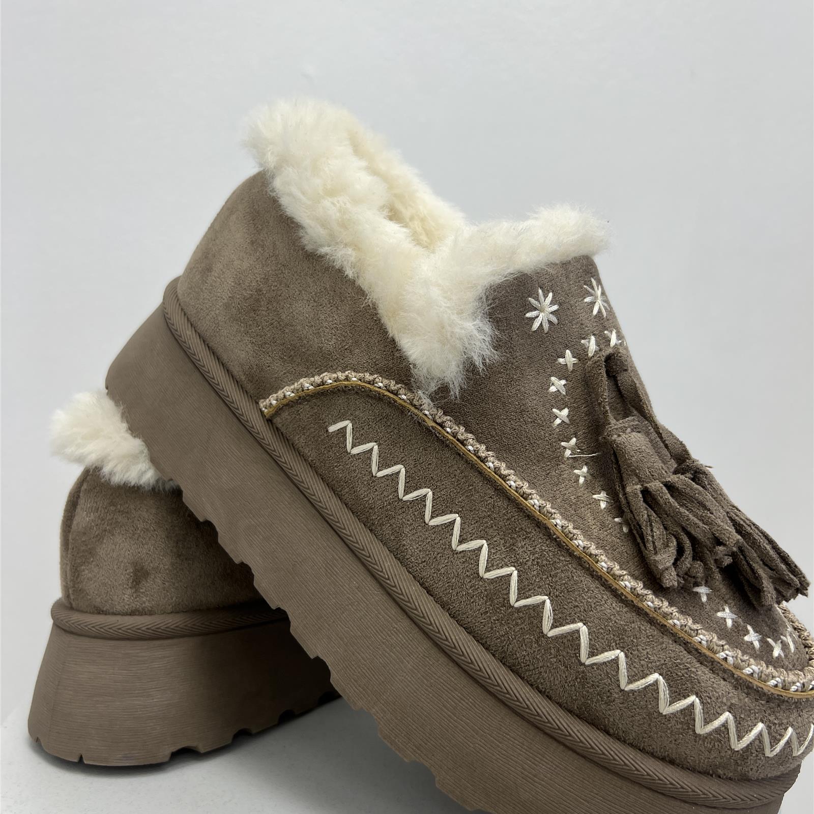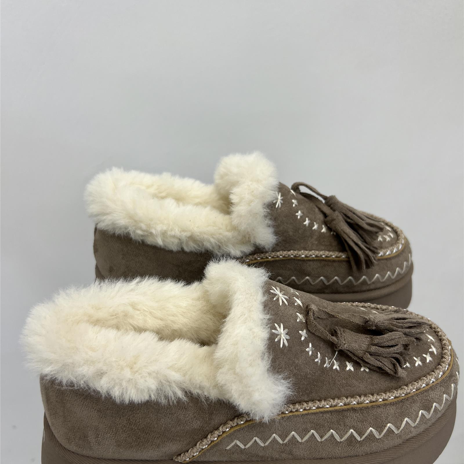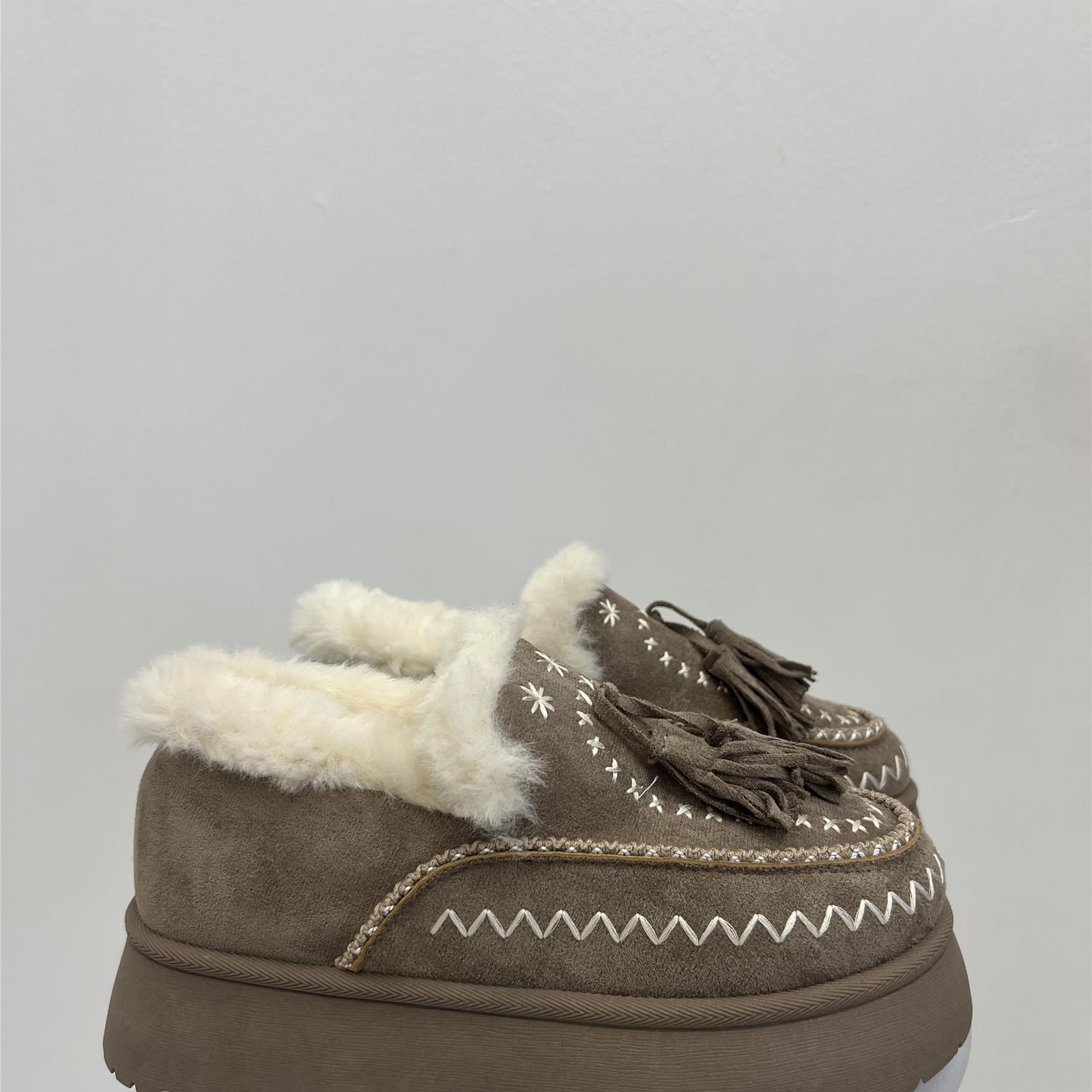 Sabot con pelo interno, simil camoscio , ricami sul davanti