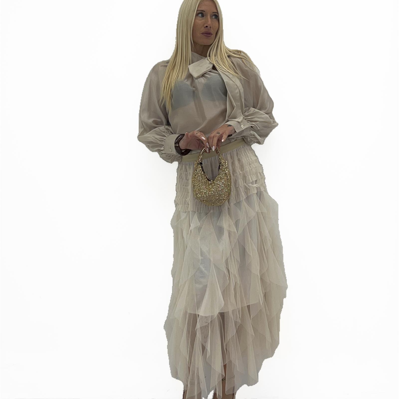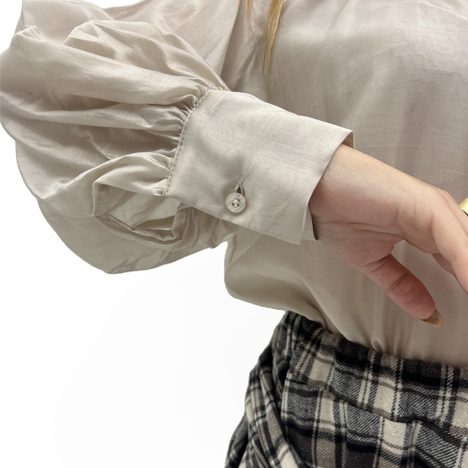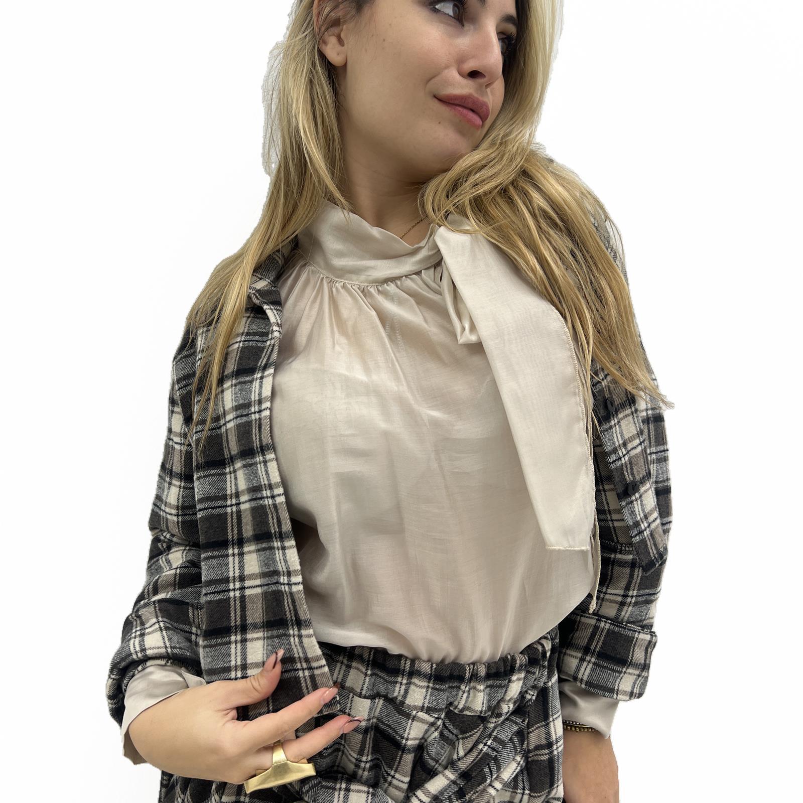 Blusa semitrasparente con apertura sul davanti e chiusura frontale con nastro.
