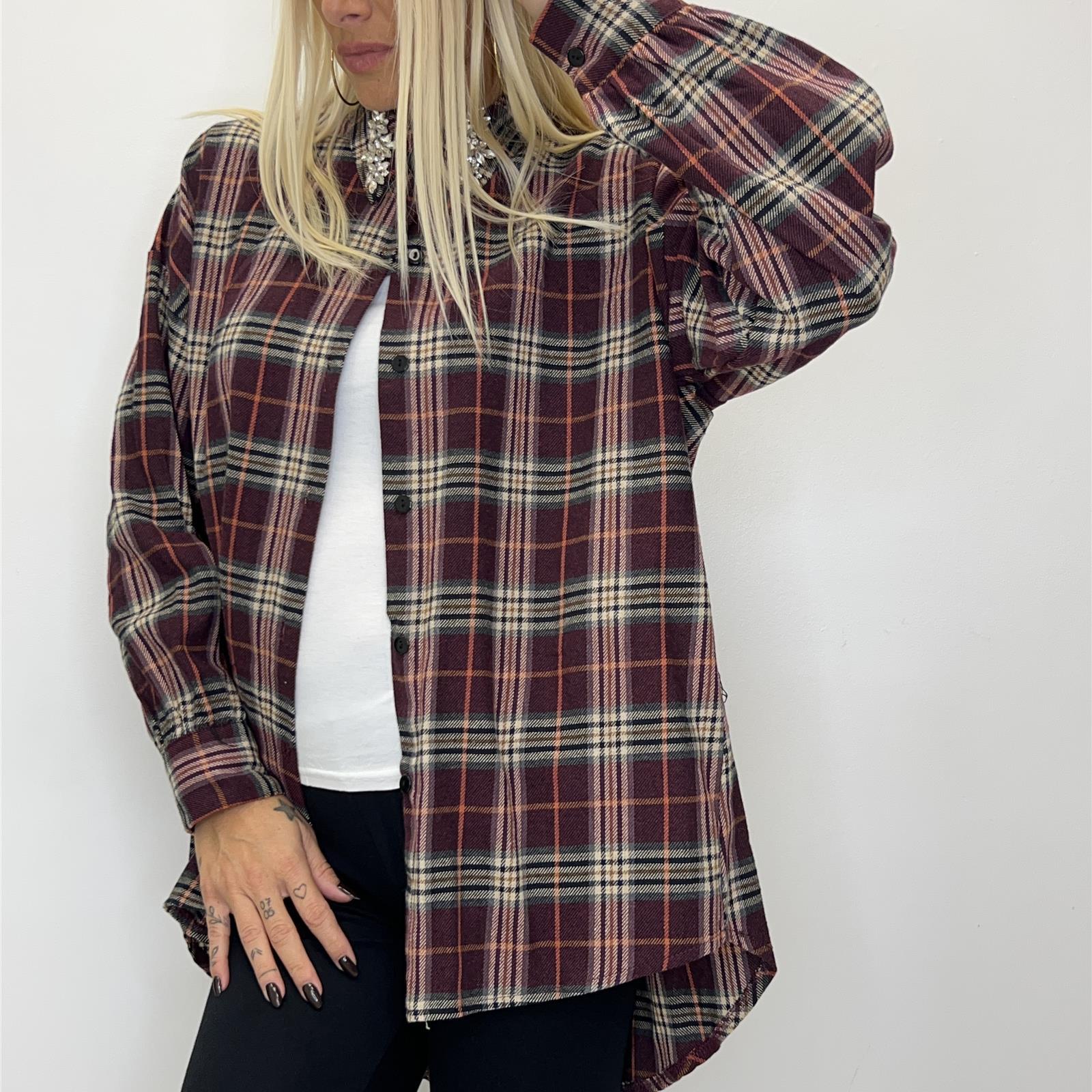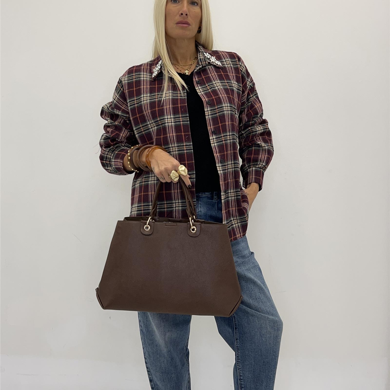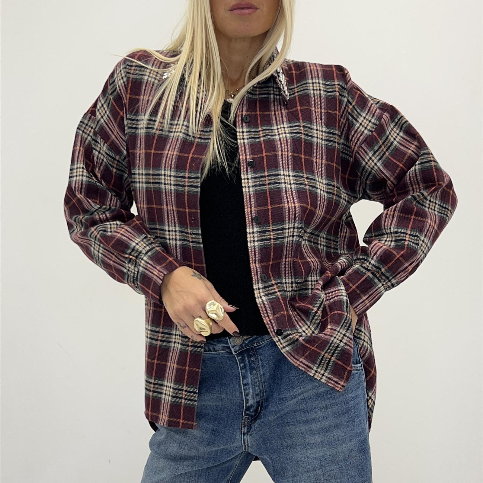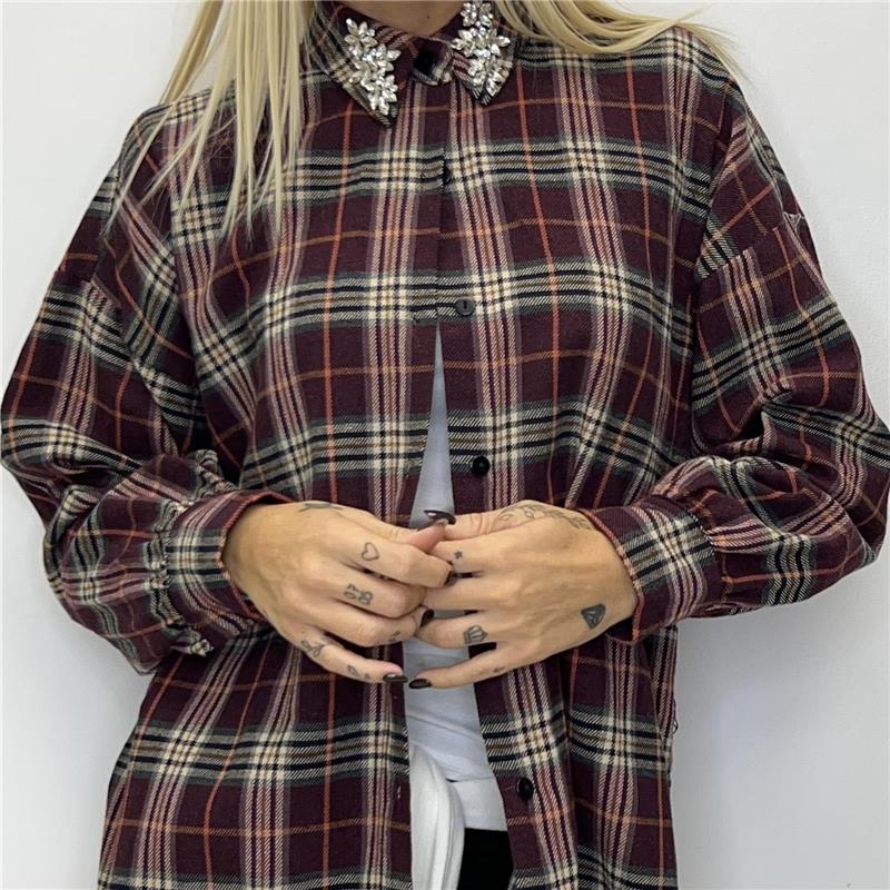 Camicia asimmetrica più lunga dietro e corta sul davanti, bottoni sul davanti e sulla manica con applicazioni gioiello sul colletto