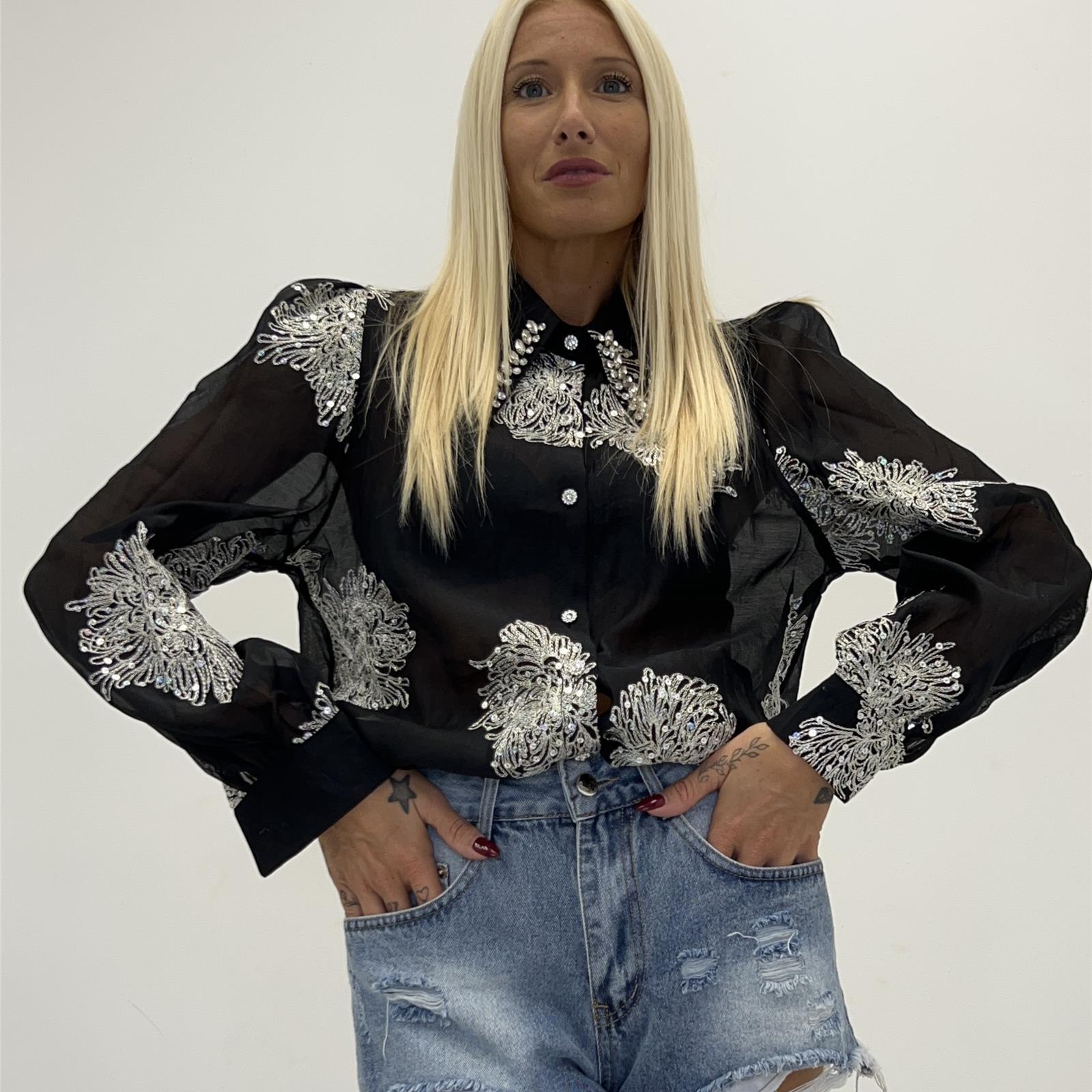 Camicia semi trasparente con applicazioni sopra e ricami con paillettes , bottoni fontali e sulla manica