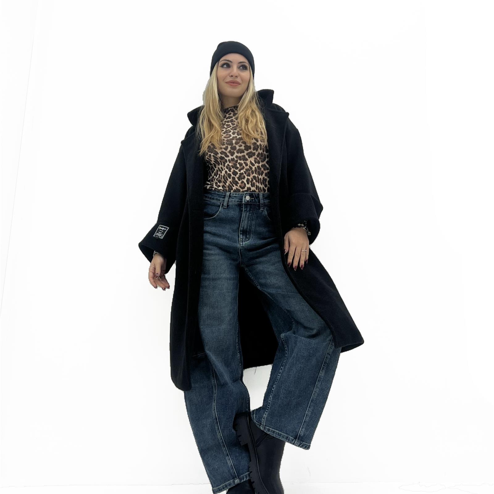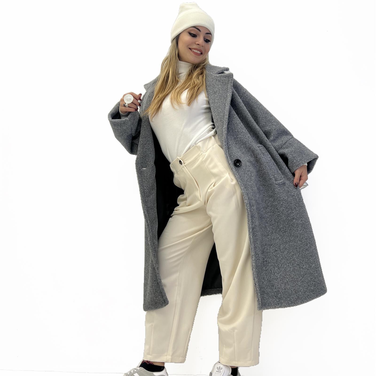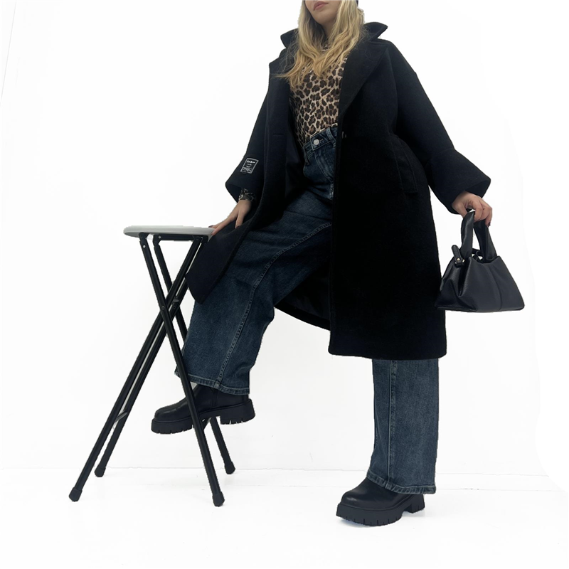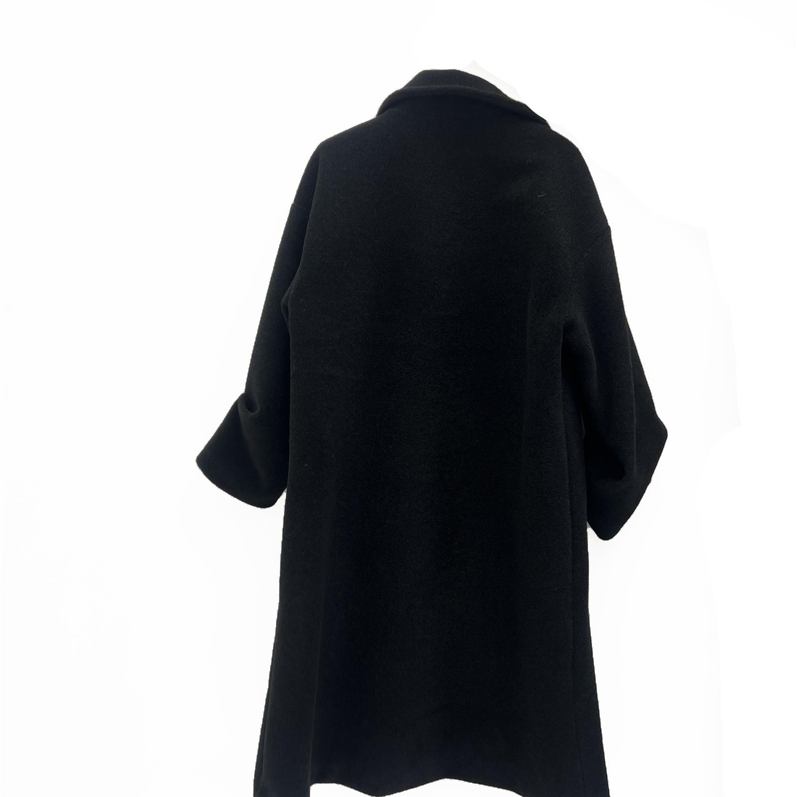 Cappotto foderato con bottone singolo per la chiusura, manica leggermente arricciata in maniera permanente  con  polsino alto e patch cucito sulla manica destra, tasche reali .