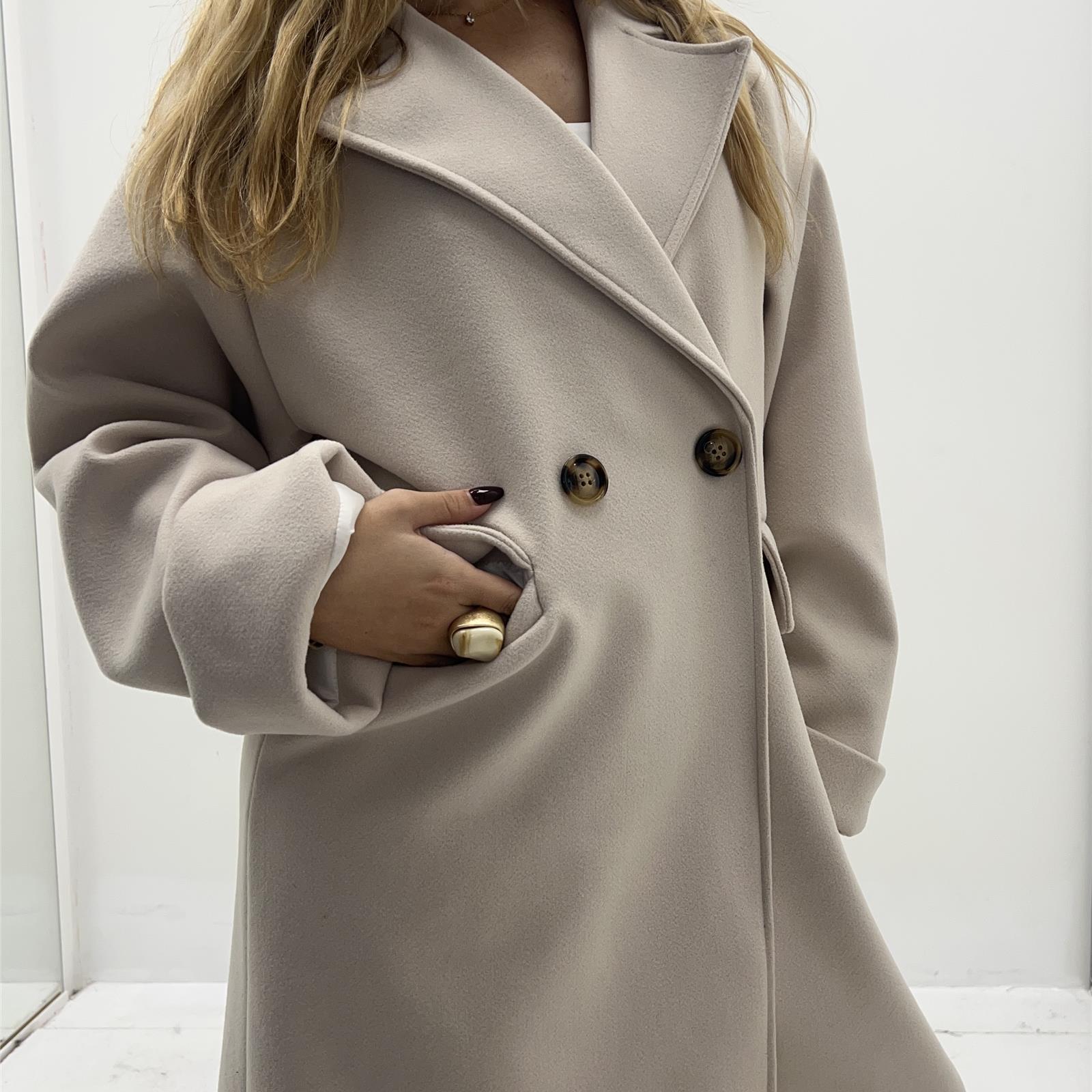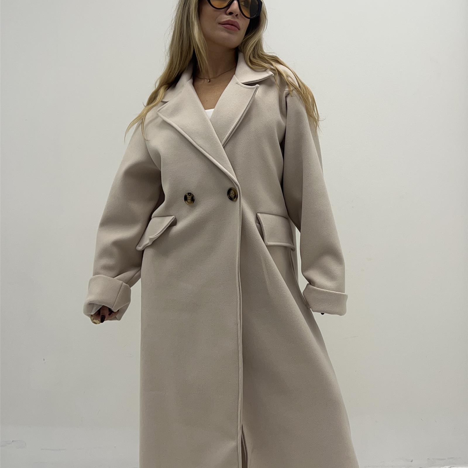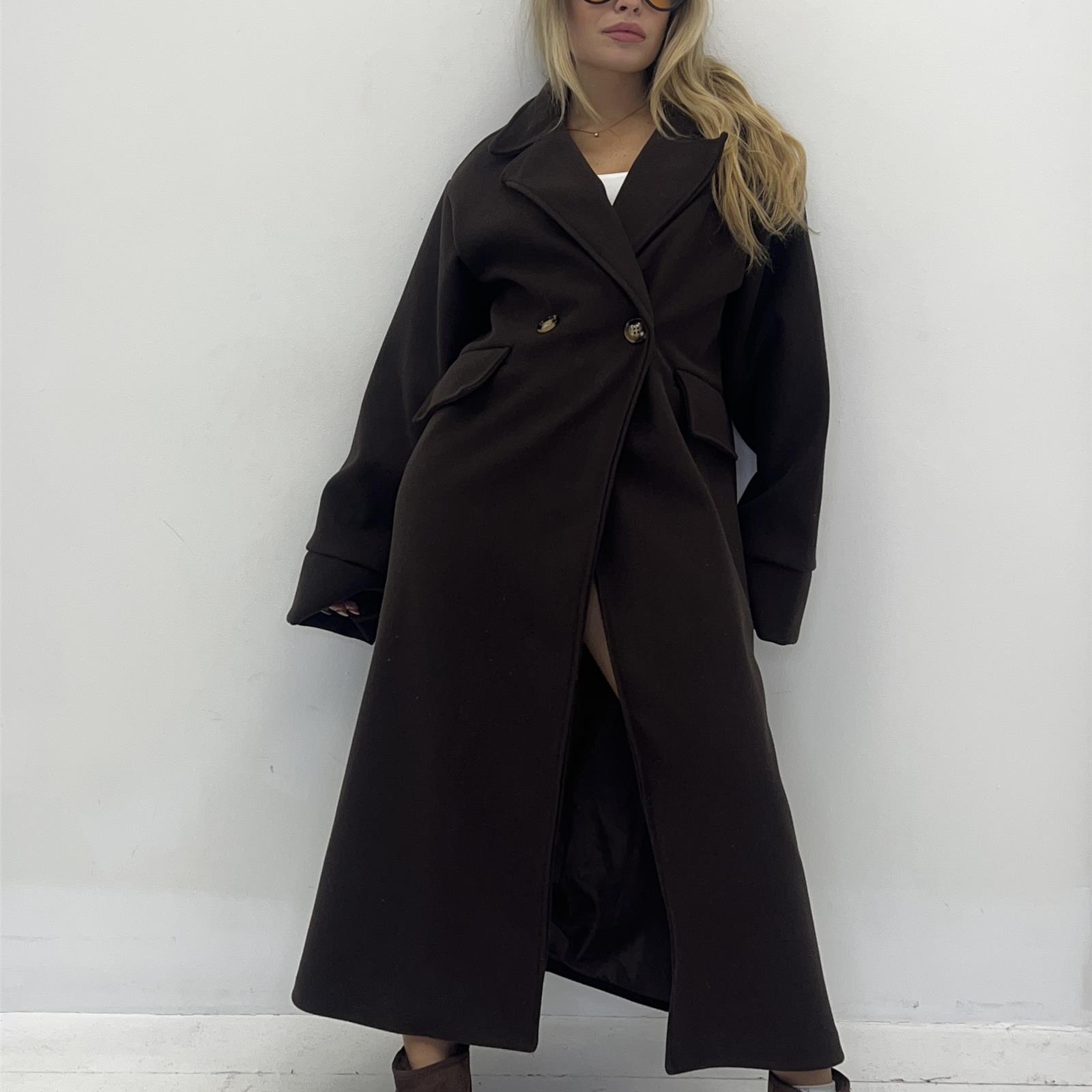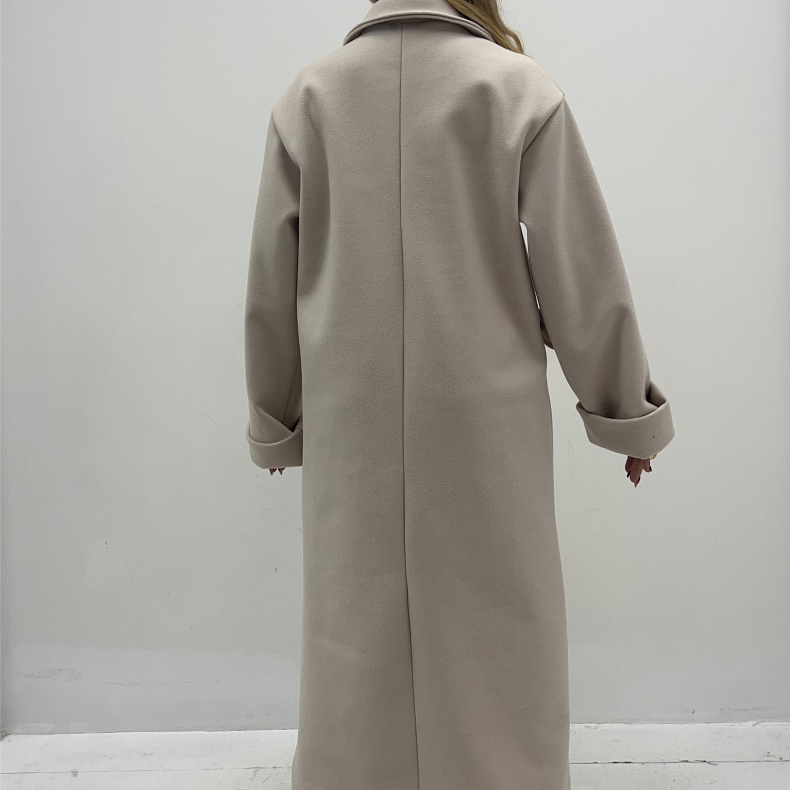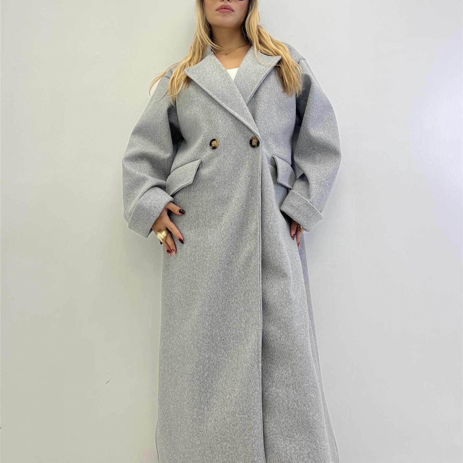 Cappotto lungo foderato, con bottoni sul davanti, tasche frontali.