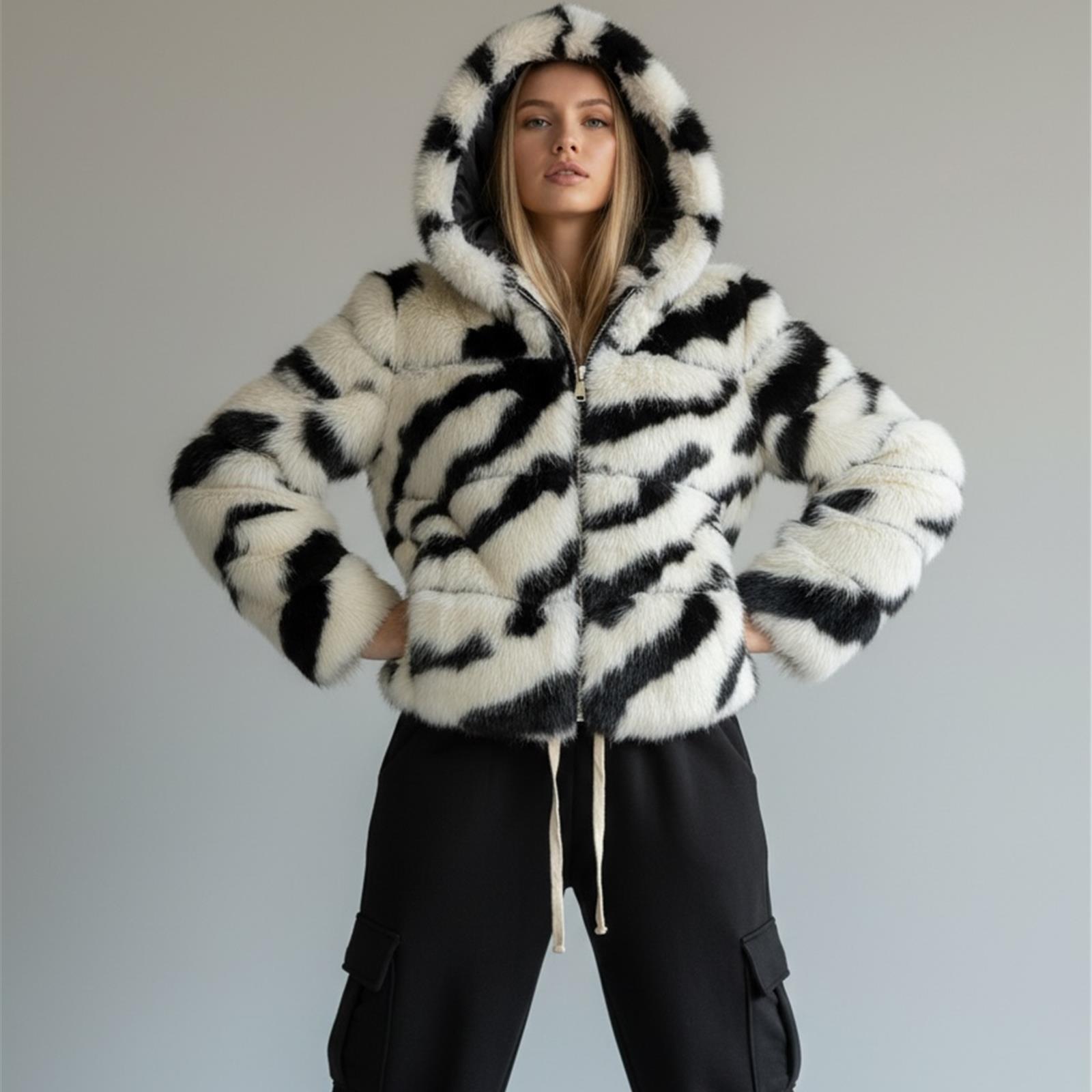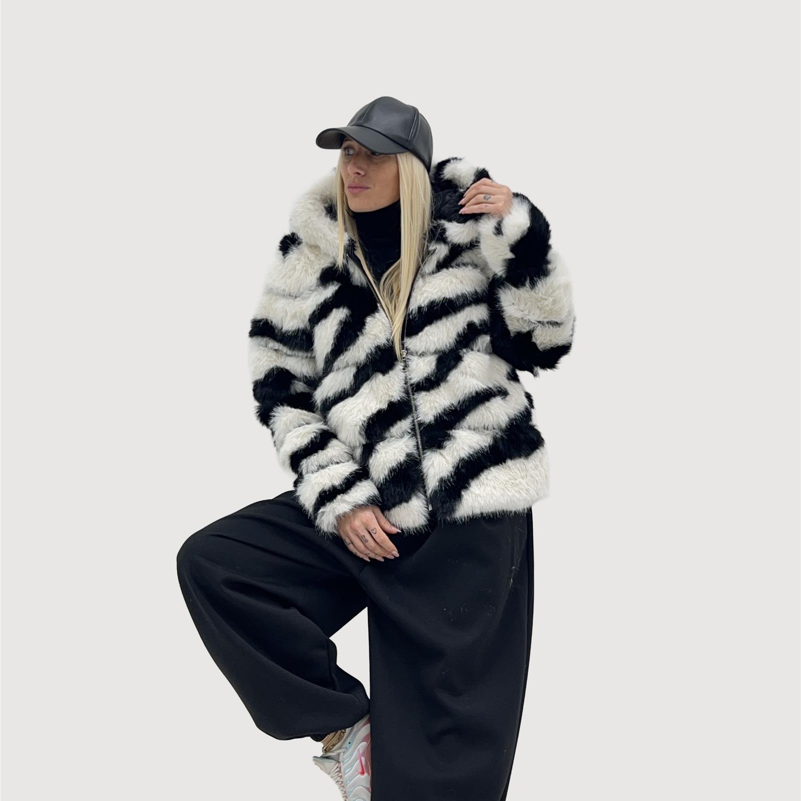 Pellicia foderata con lato interno in pelle , con cappuccio e cerniera per la chiusura, due tasche laterali reali
