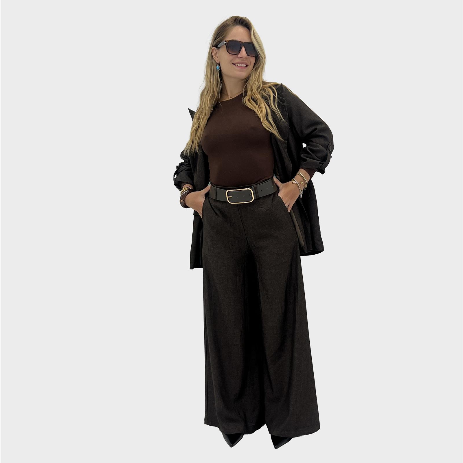 Pantalone: modello pantagonna con passanti e cintura simil pelle, elastico sul retro,zip a scomparsa e tasche reali laterali.