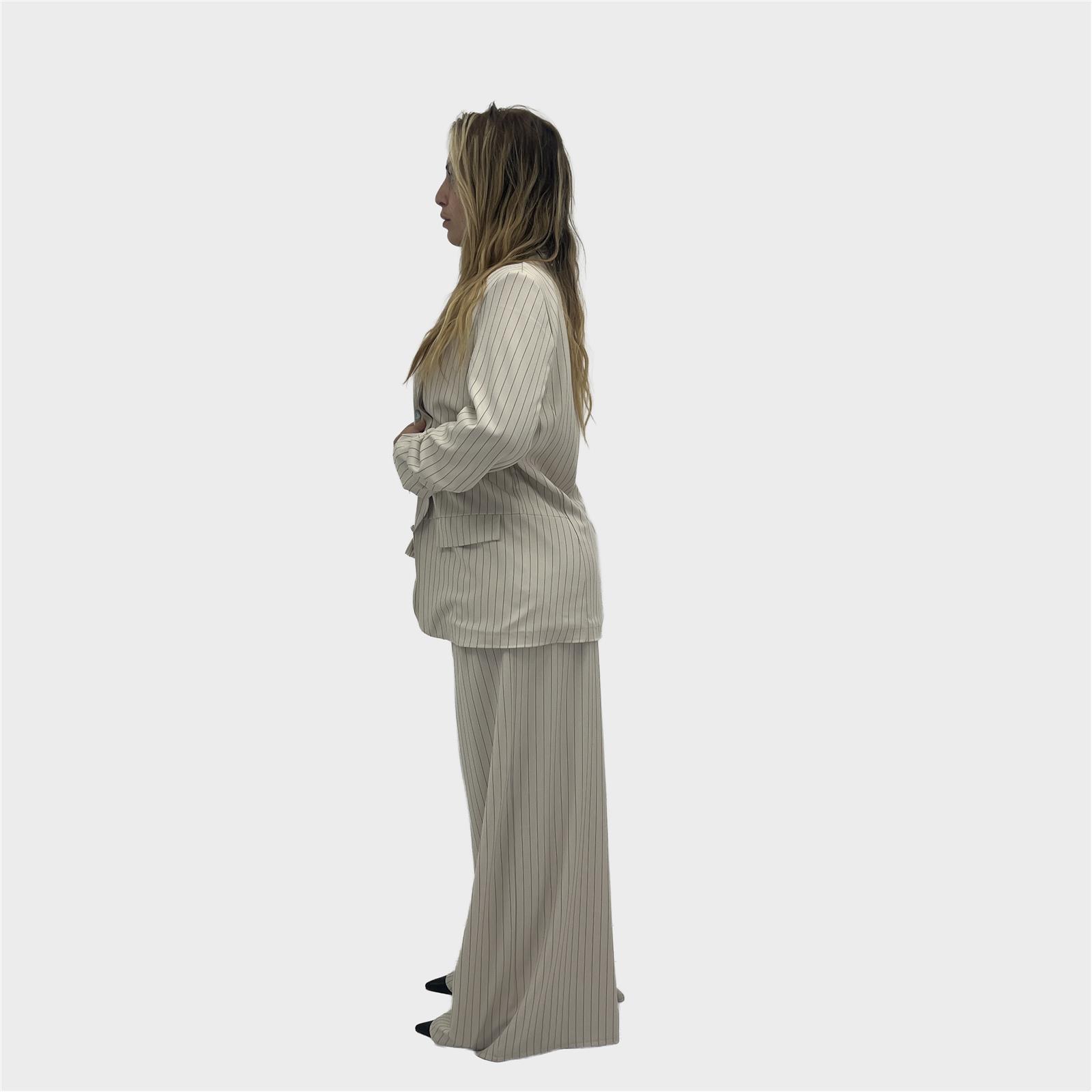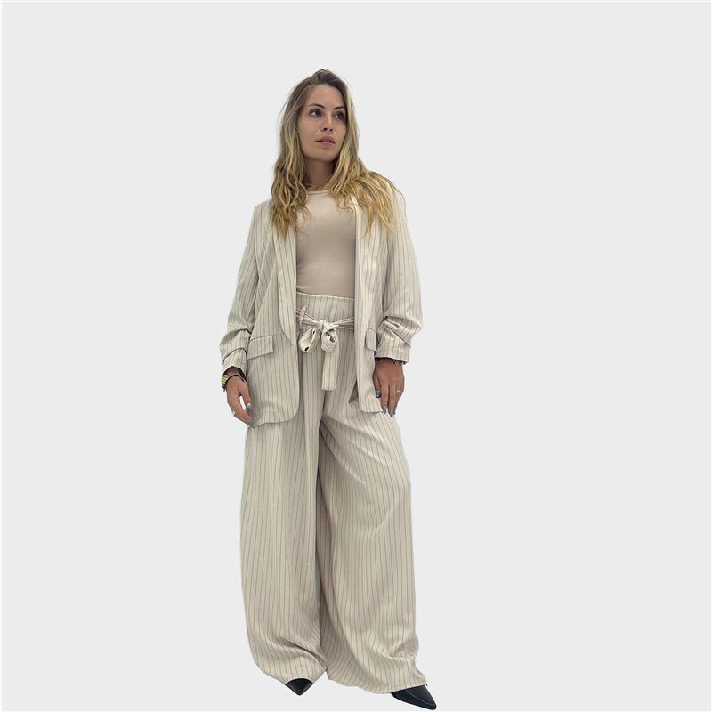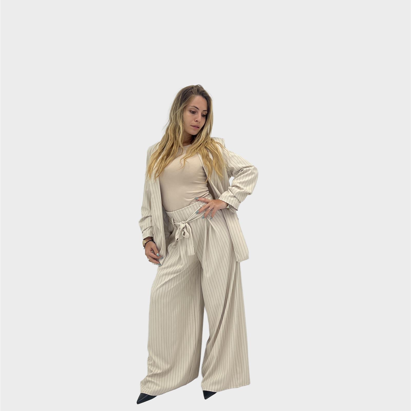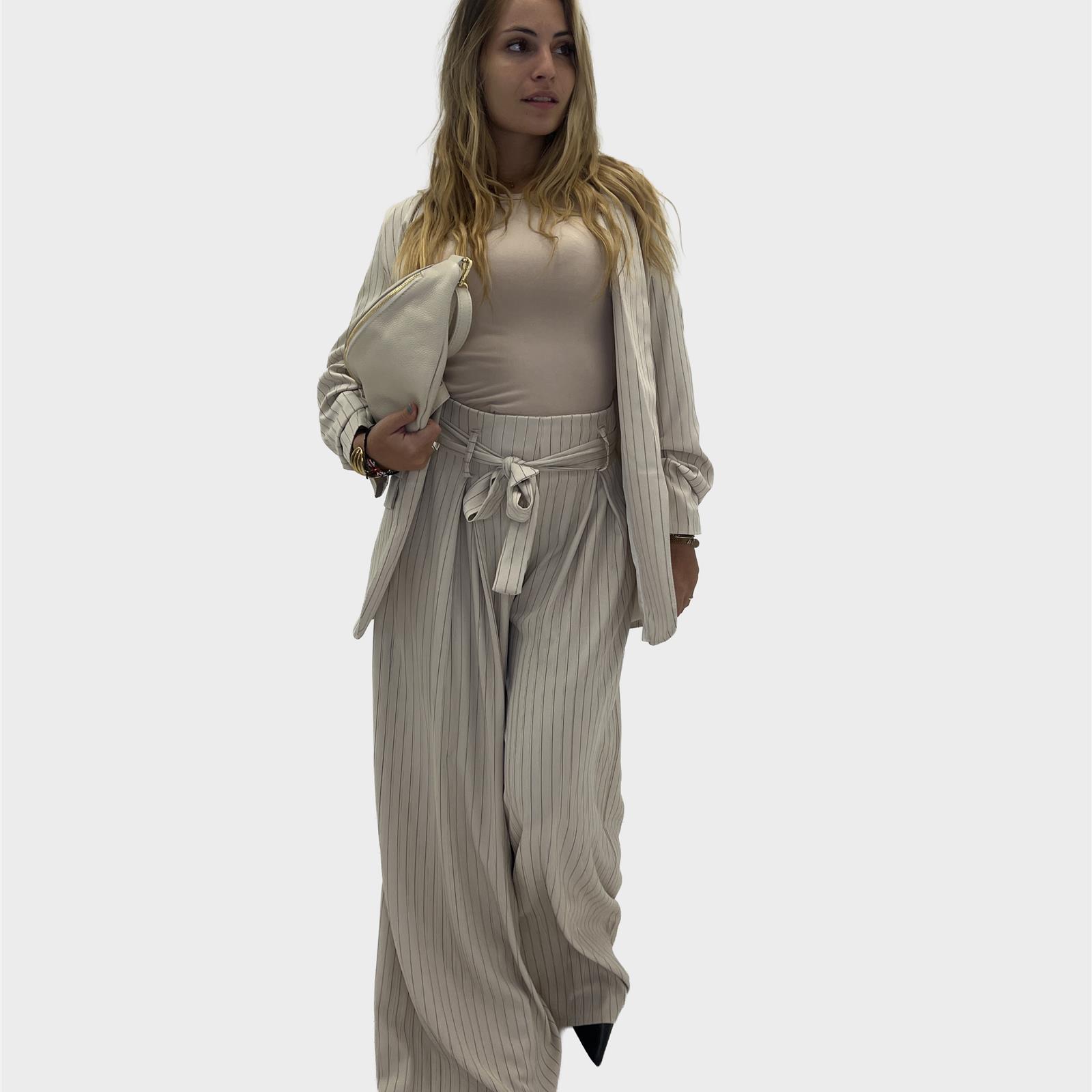 pantalone modello ampio, con elastico sul retro, passanti e cintura. pence sul davanti