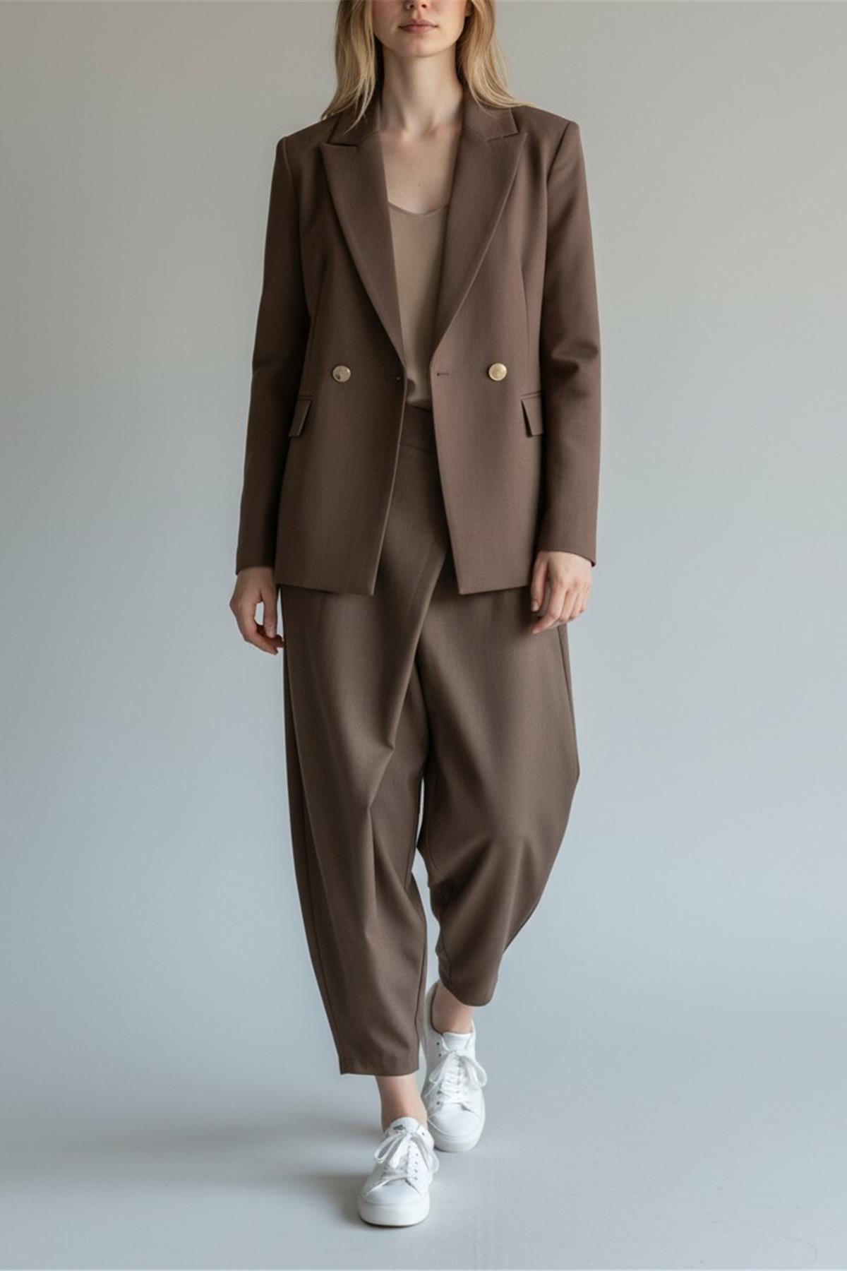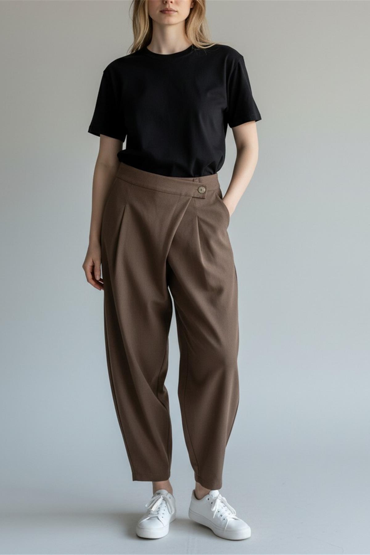 pantalone con pence sul davanti, bottone per chiusura, chiusura a portafoglio , modello balloon e tasche reali laterali