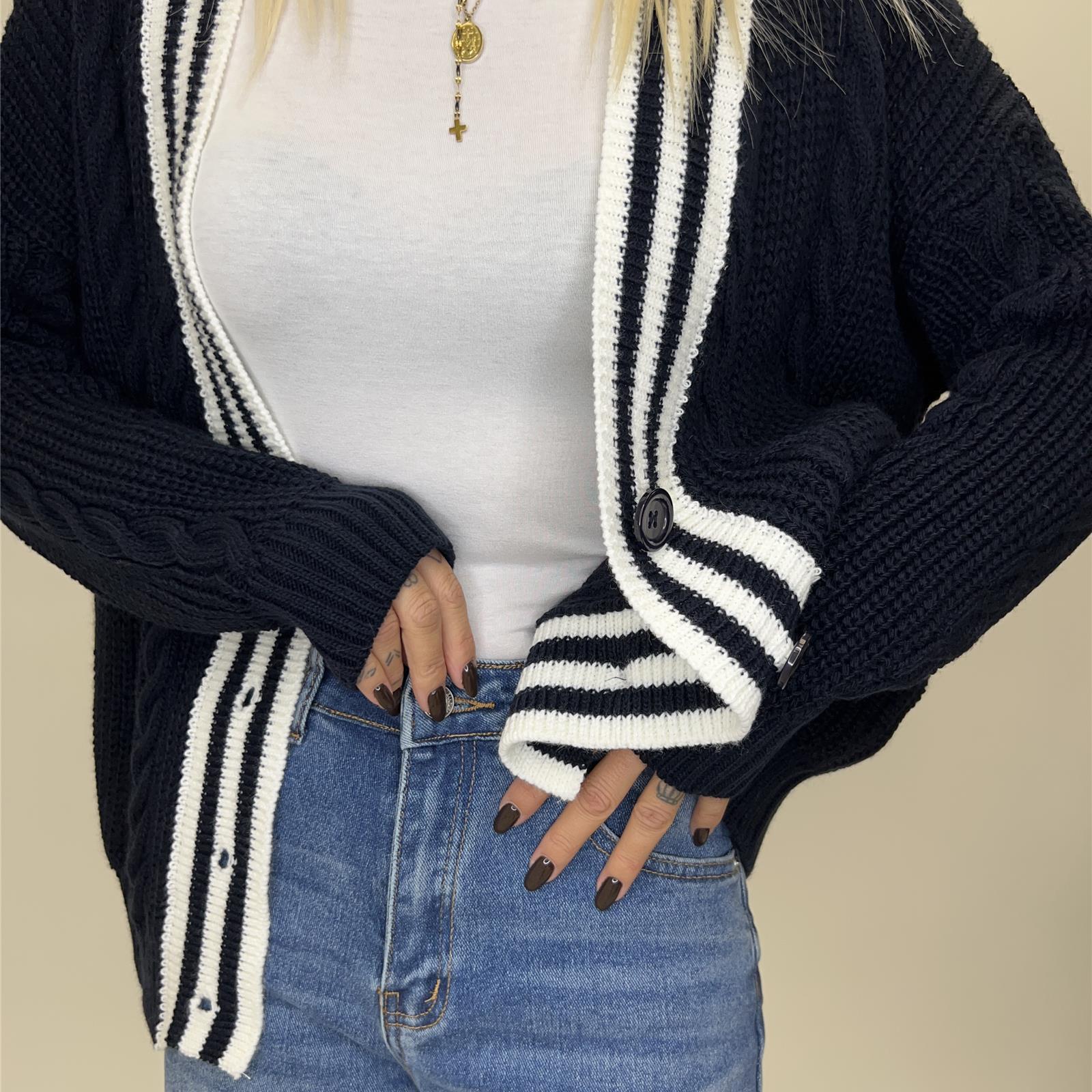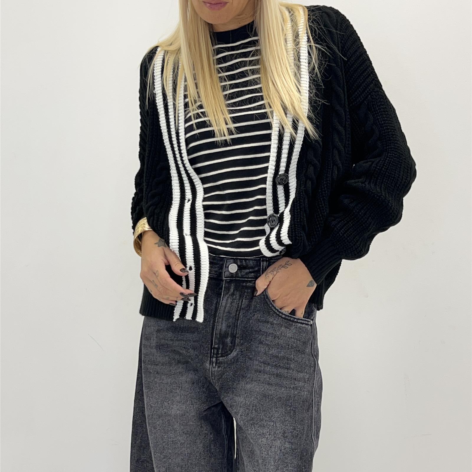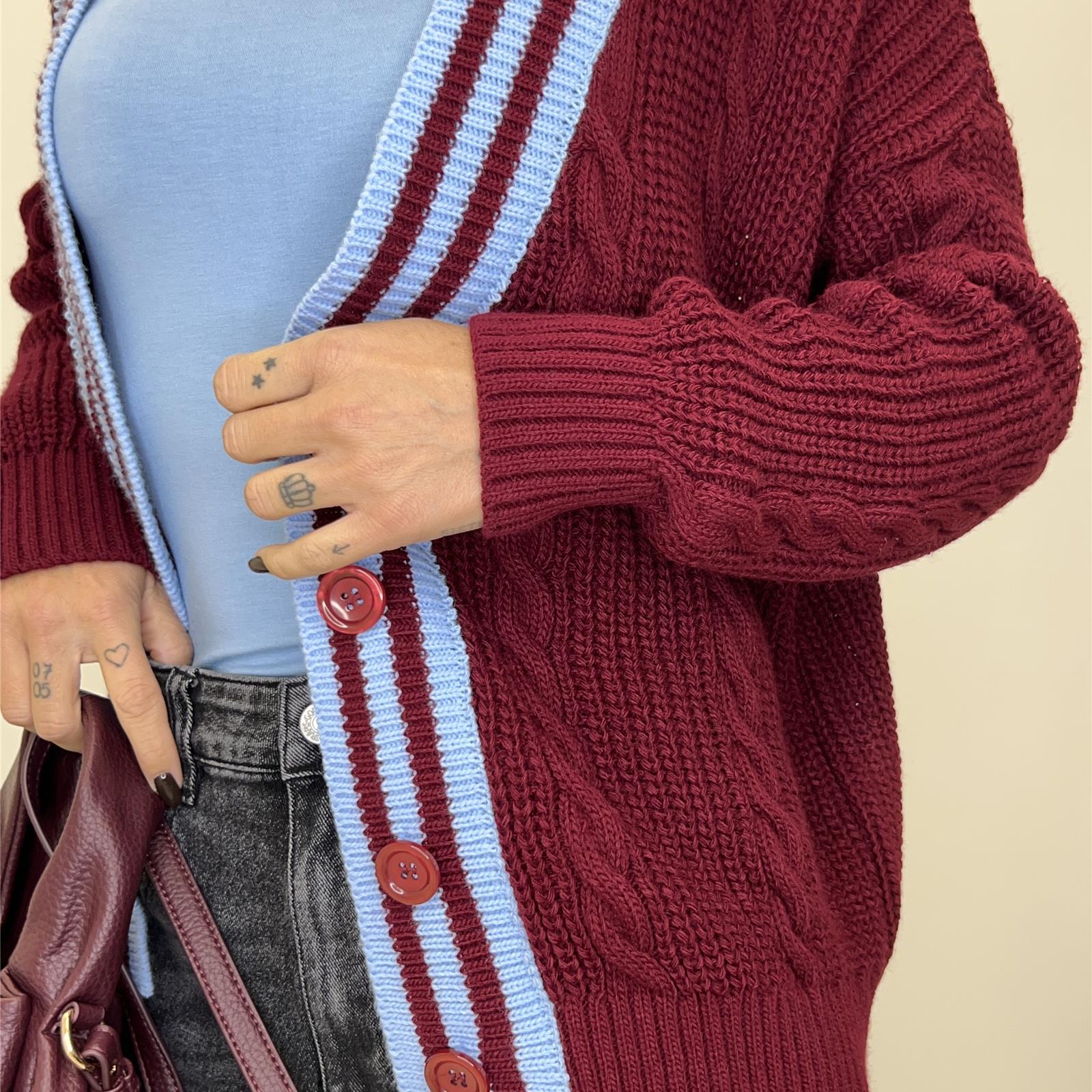 Cardigan in maglia , realizzato con lavorazione in treccia, bottoni sul davanti e ampio scollo a V