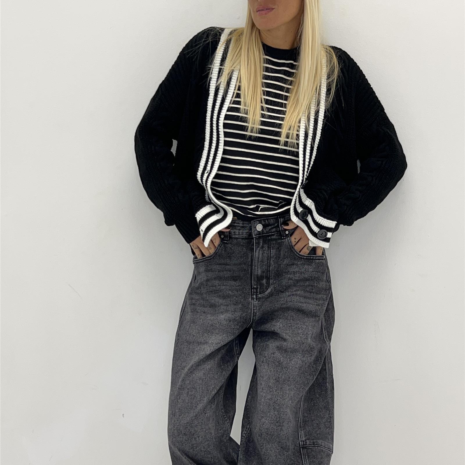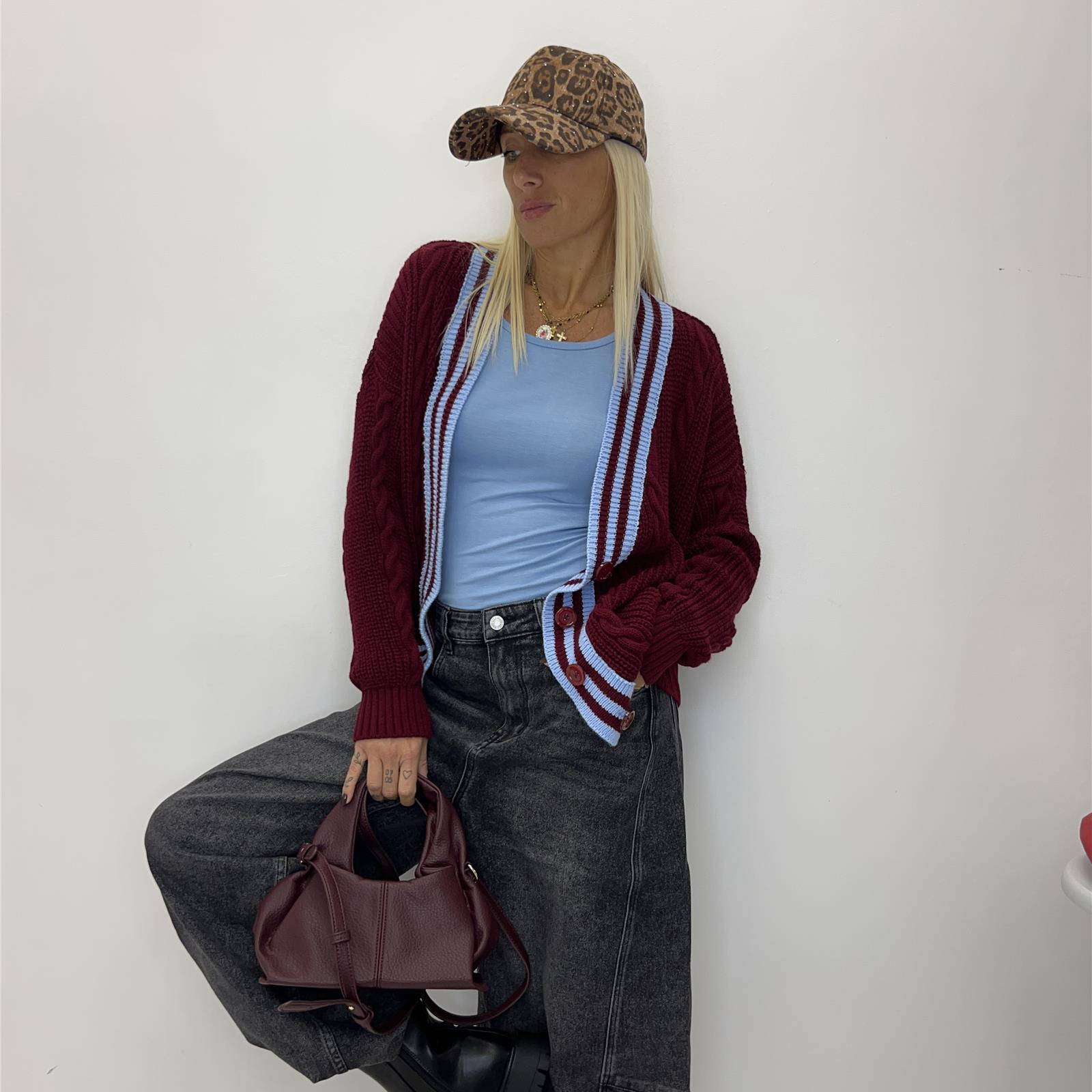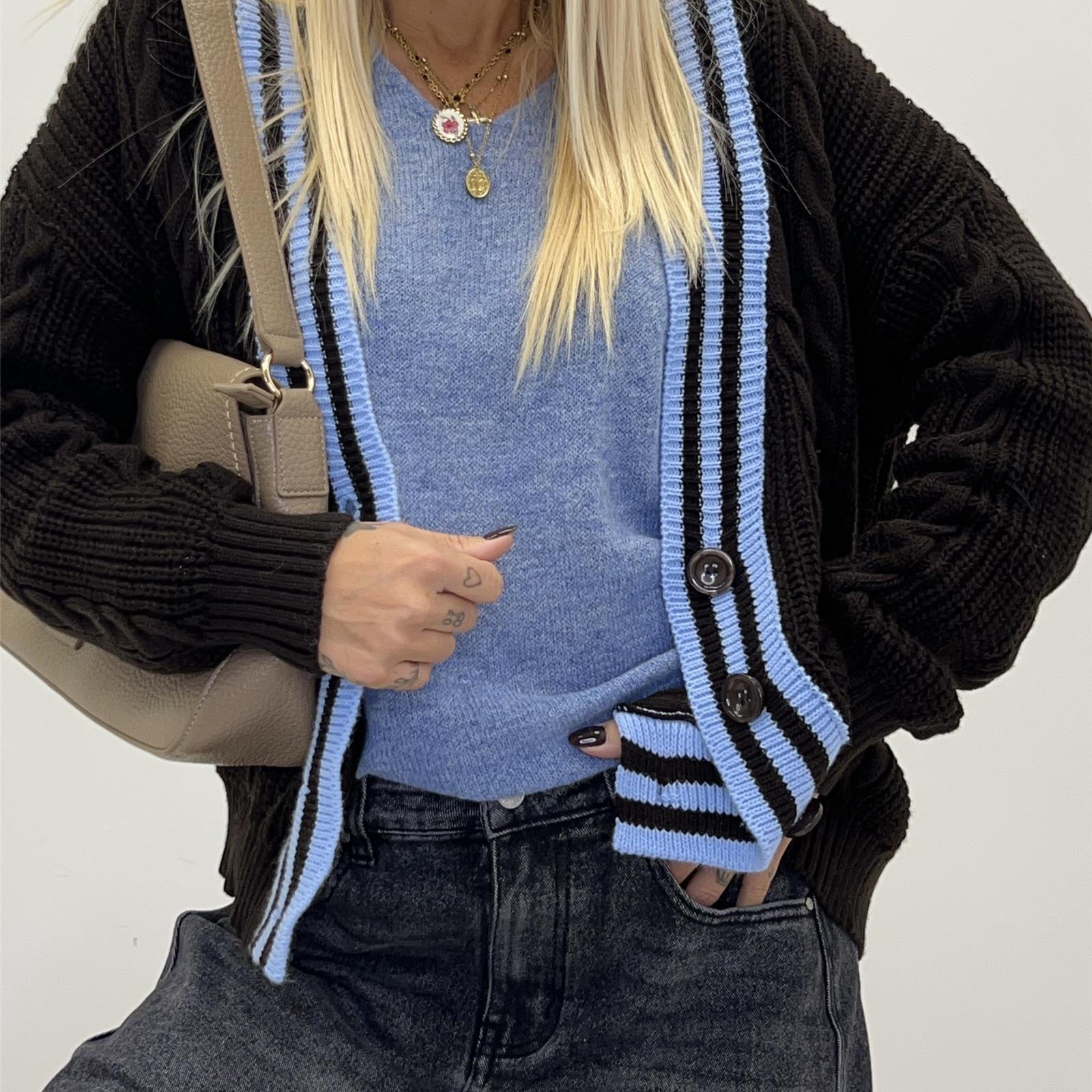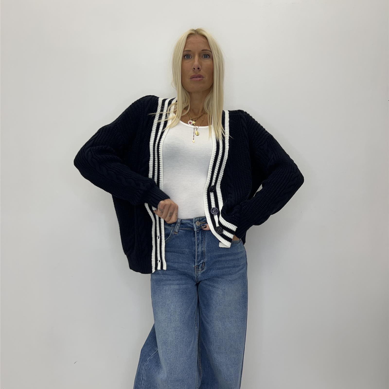 Cardigan in maglia , realizzato con lavorazione in treccia, bottoni sul davanti e ampio scollo a V