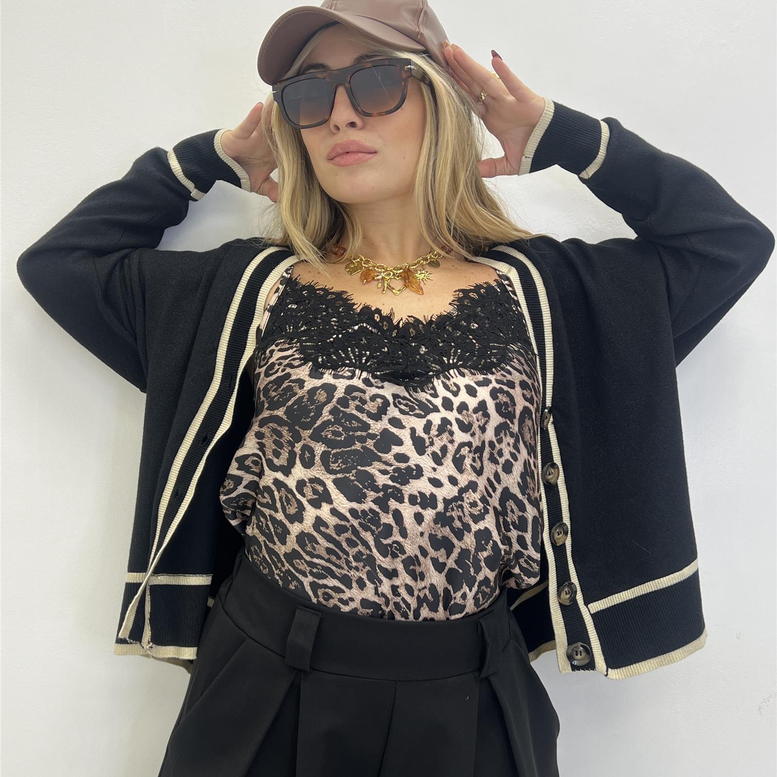 Cardiga over in tessuto elasticizzato effetto lurex bande dorate bottoni di chiusura scollo v