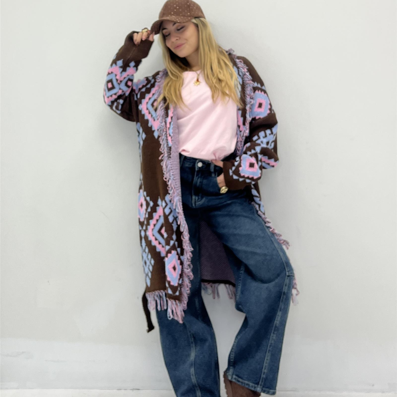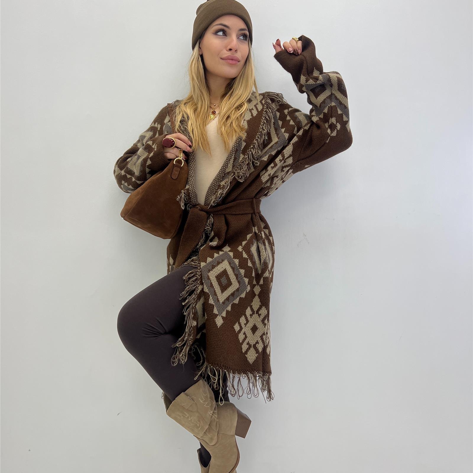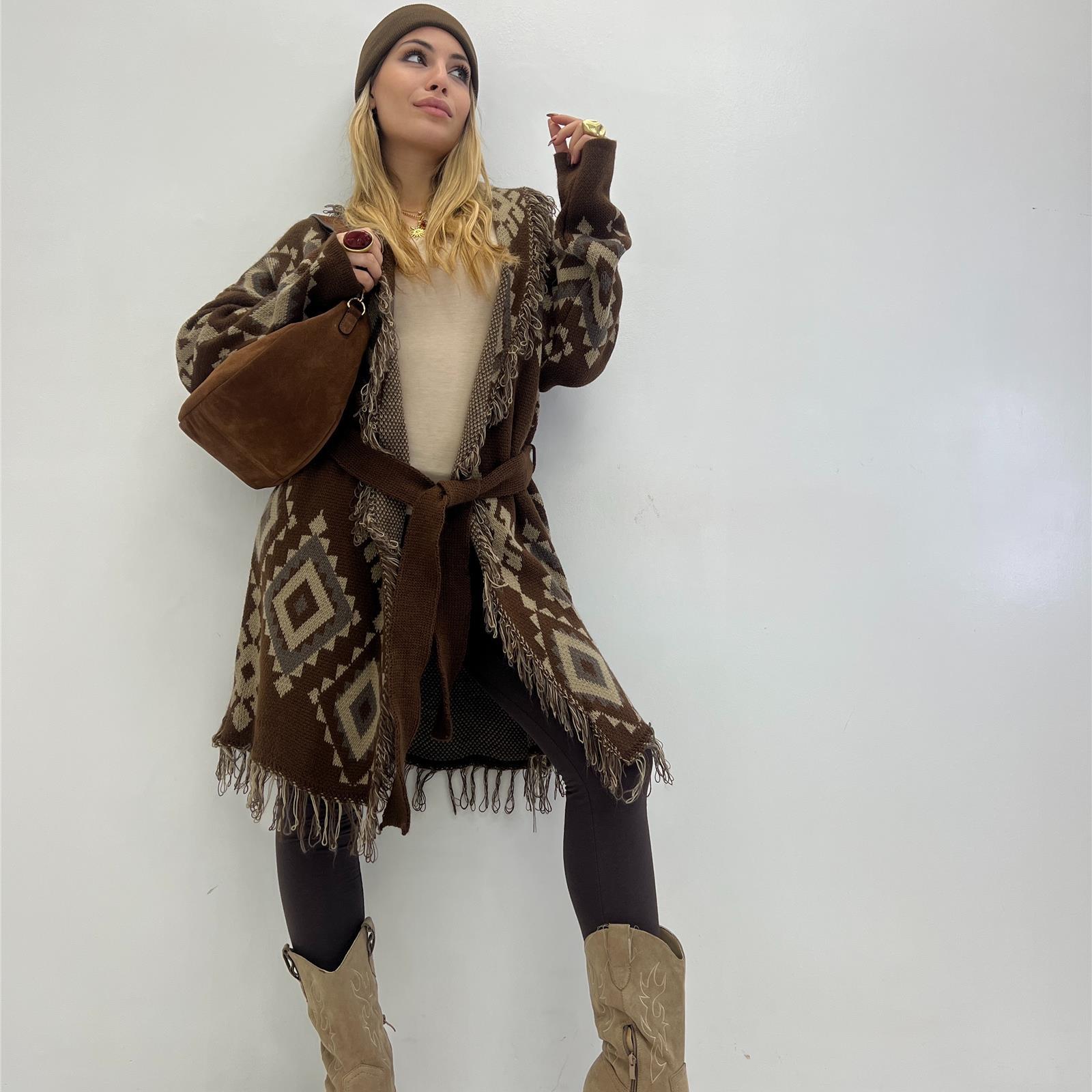 Cardigan modello kimono con passanti, cintura e frange sul davanti