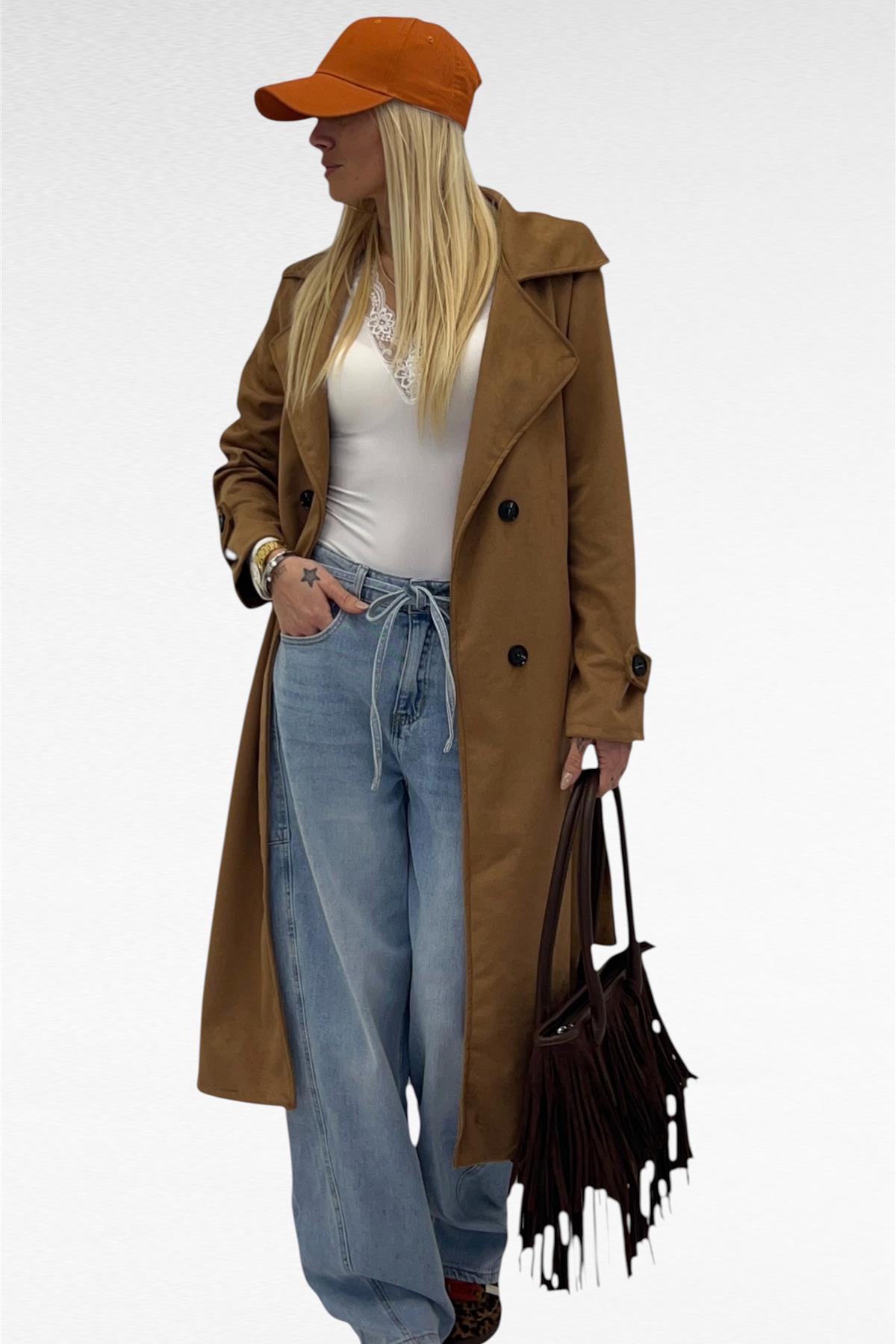 Trench in simil camoscio, doppio petto, sfoderato, con tasche laterali reali e cintura in vita.