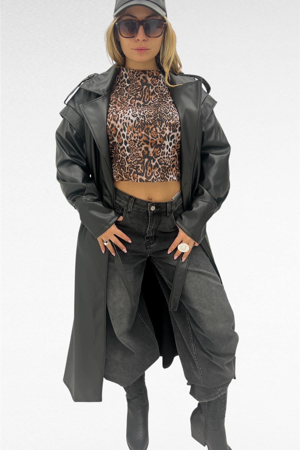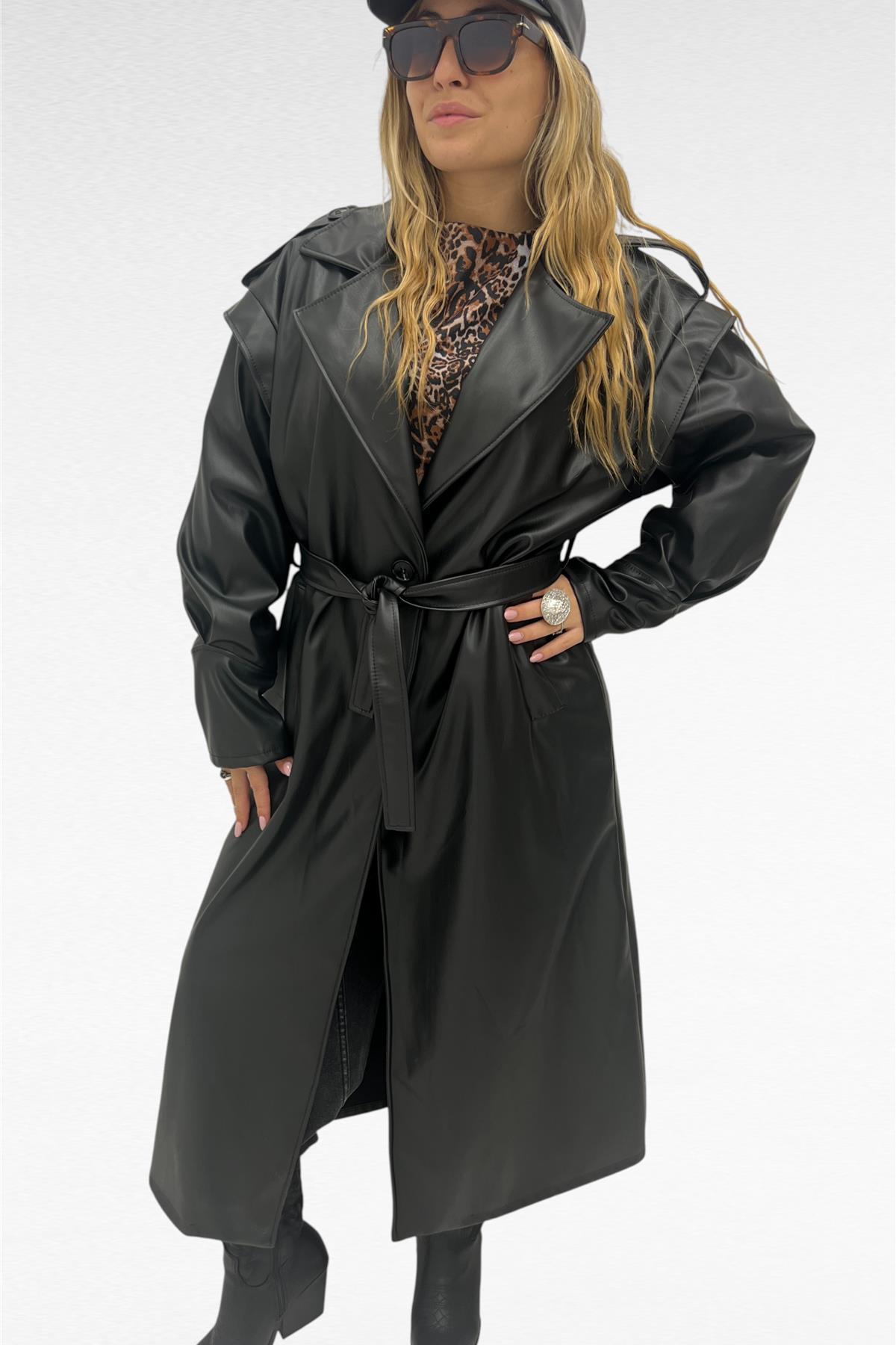Trench in ecopelle sfoderato, con tasche laterali reali, polsini larghi, cintura in vita e un bottone per la chiusura.
