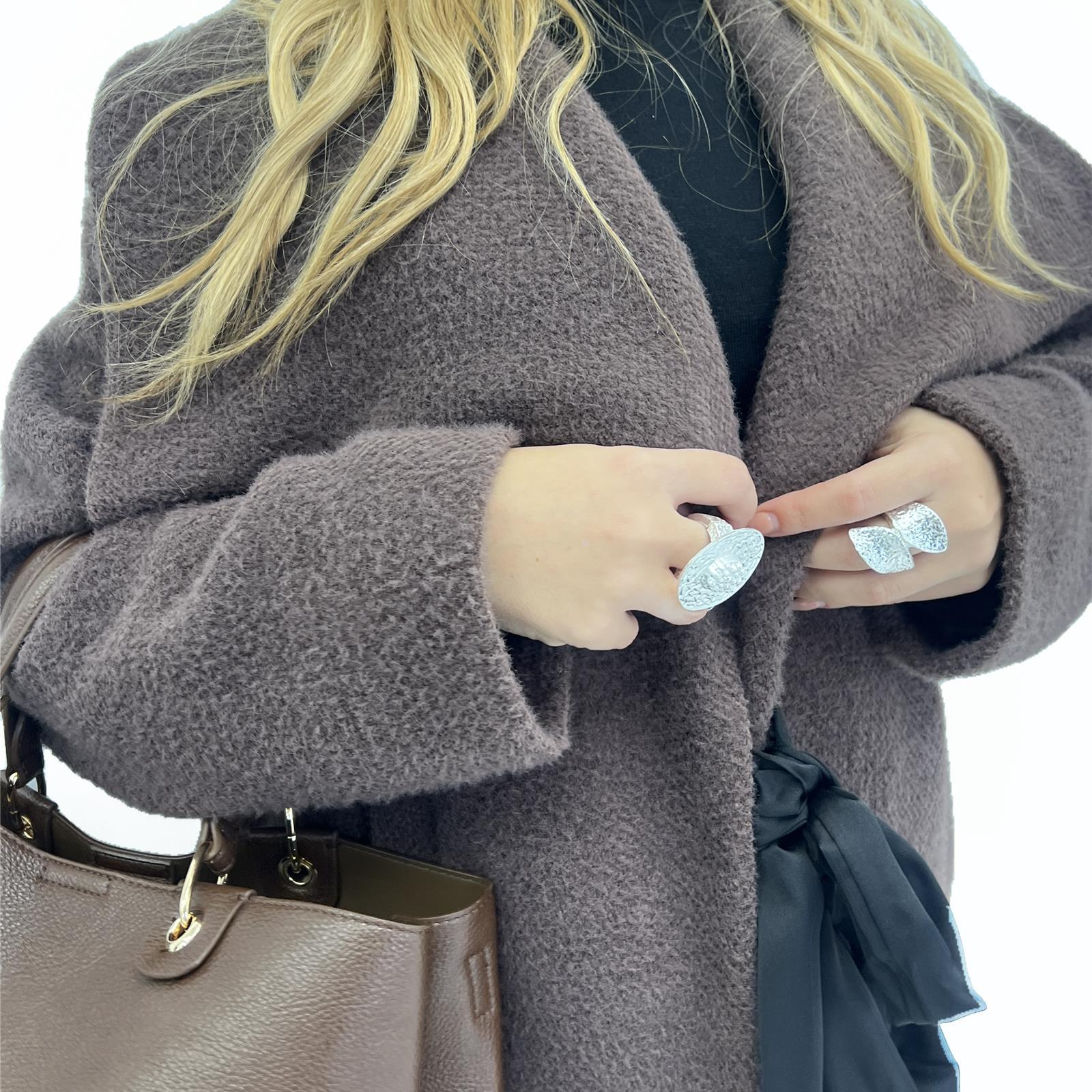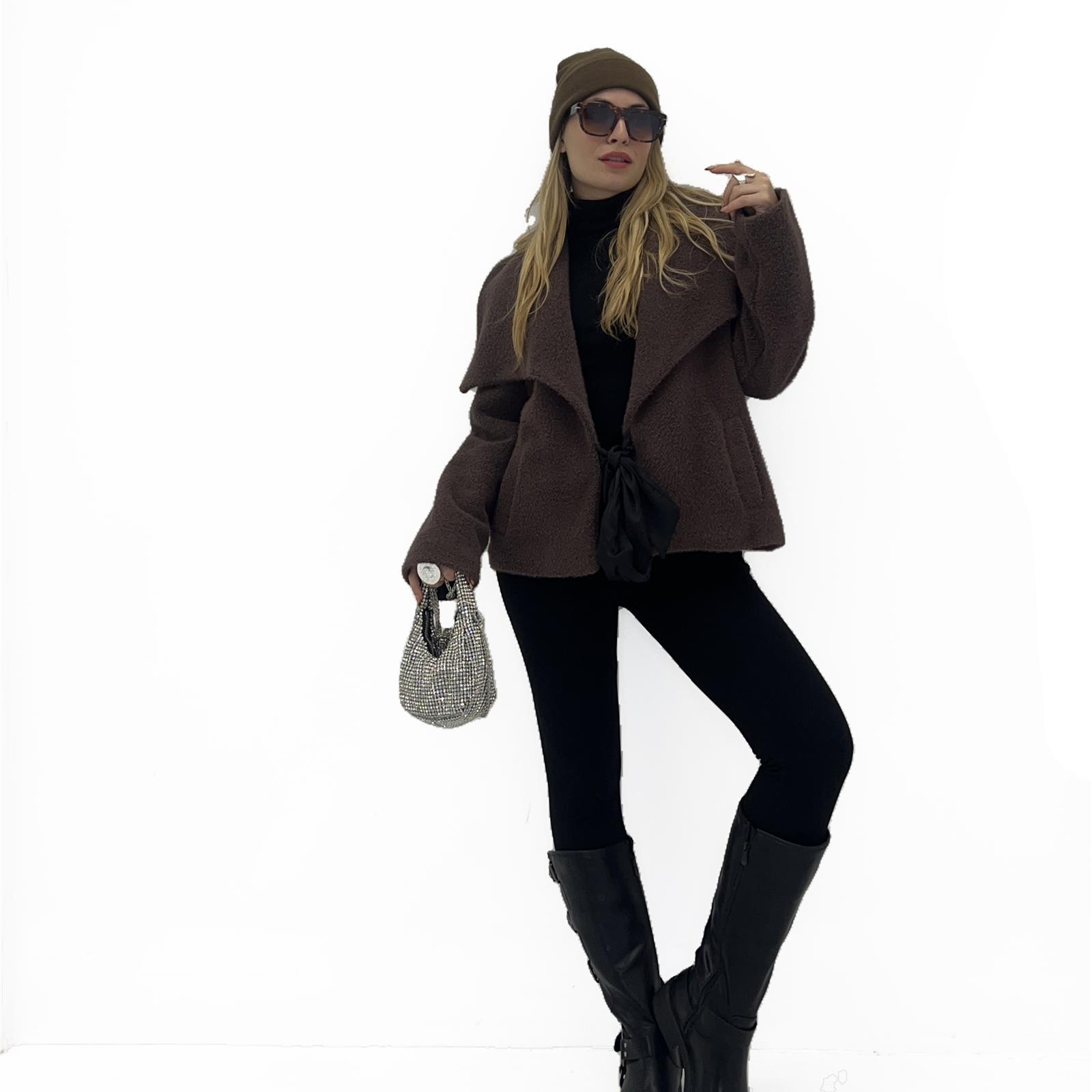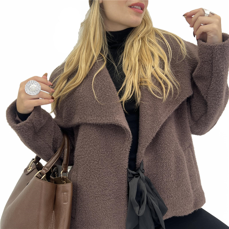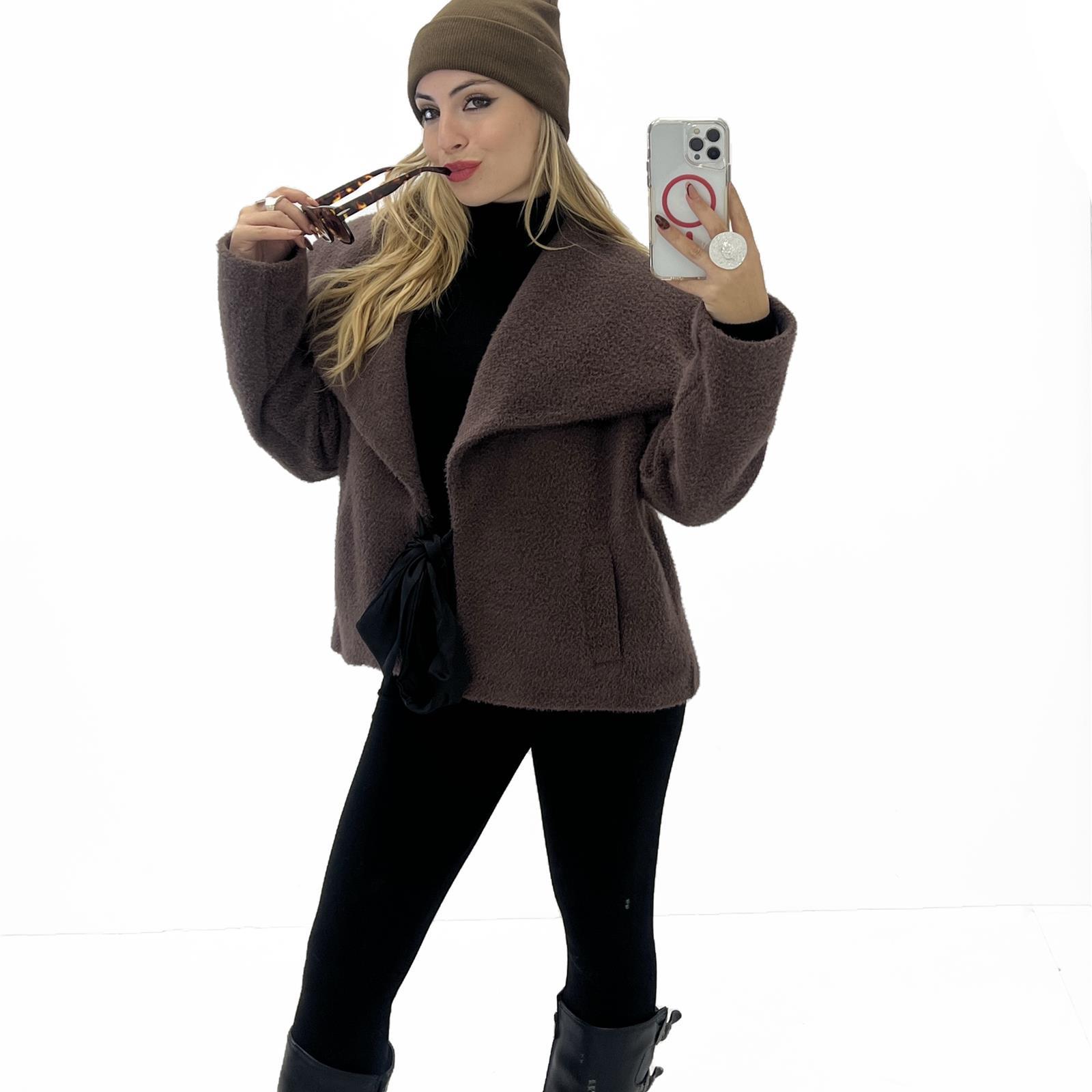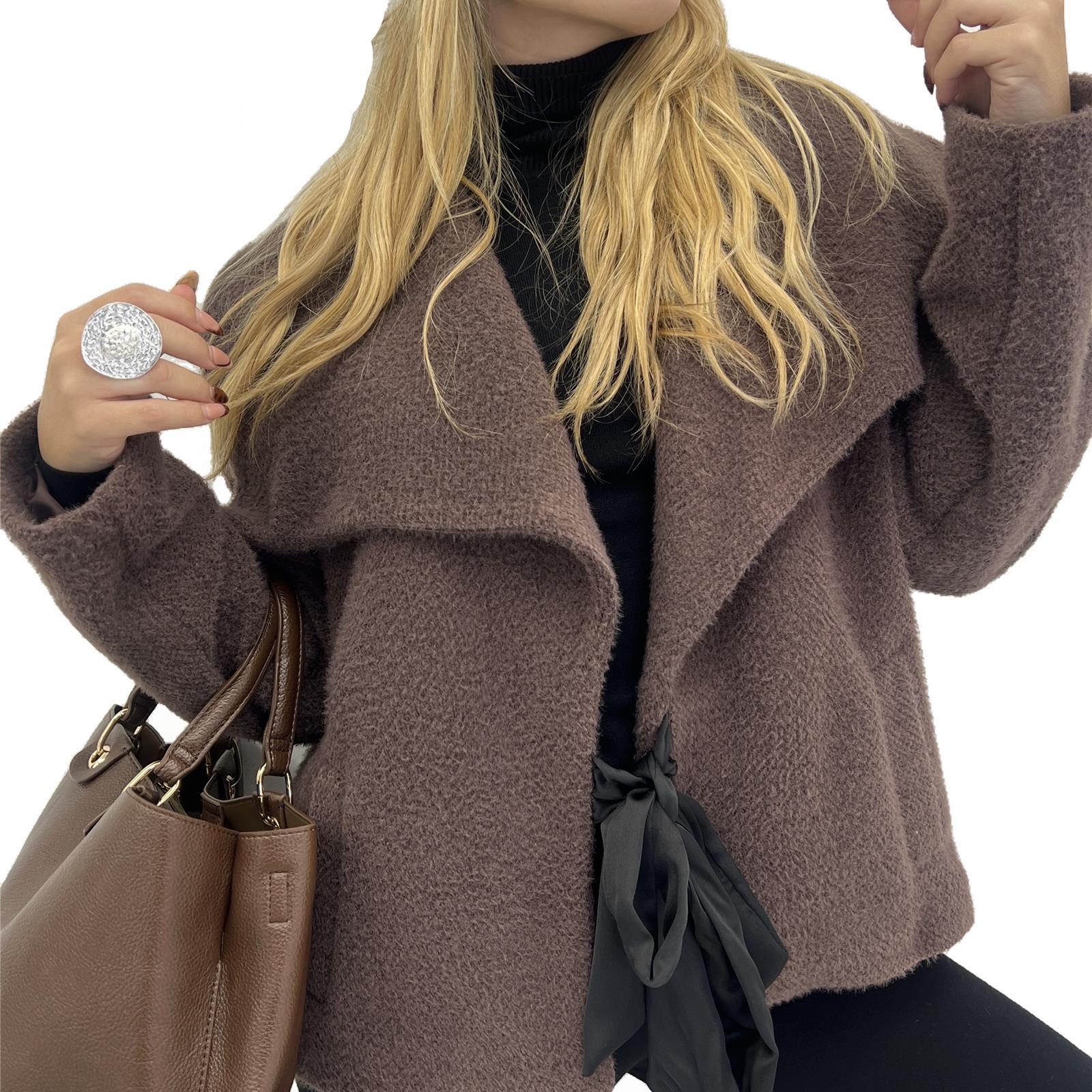 Capospalla foderato con colletto ampio, tasche laterali e nastro per chiusura