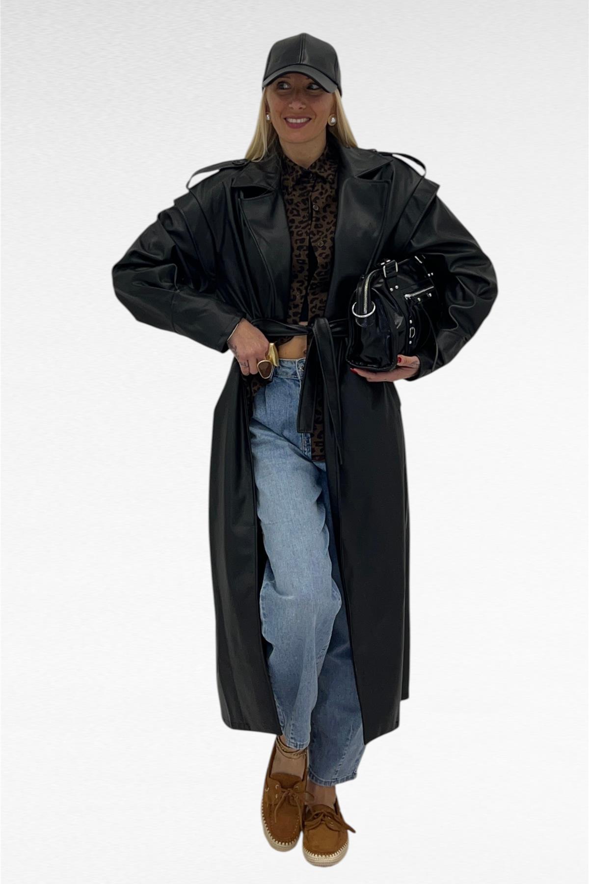 Trench in ecopelle sfoderato, con tasche laterali reali, polsini larghi, cintura in vita e un bottone per la chiusura.