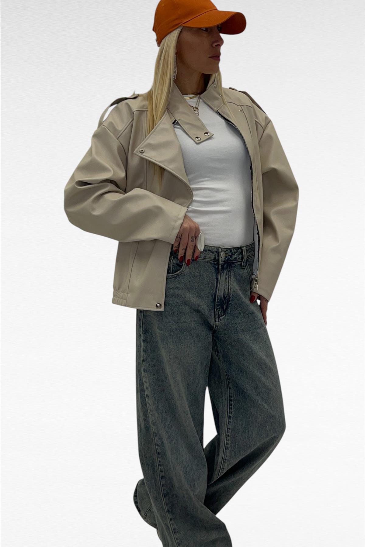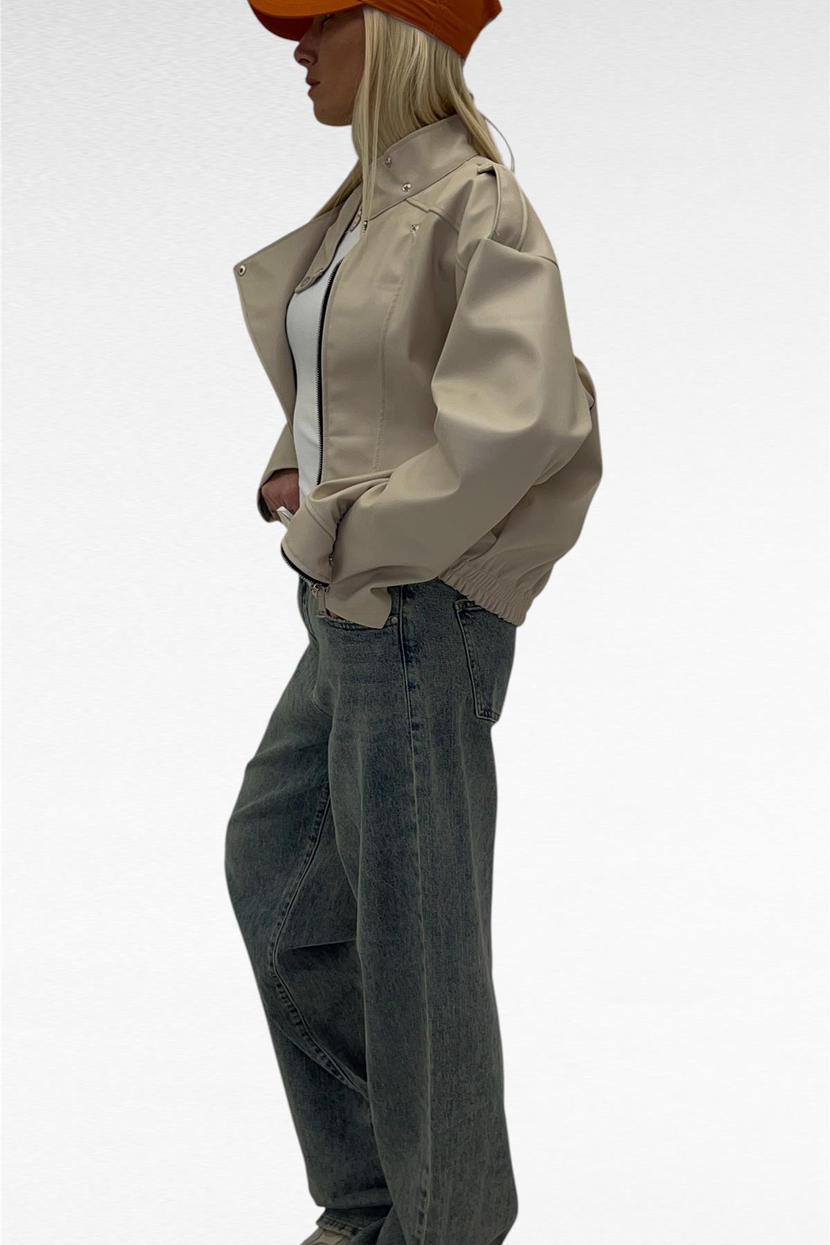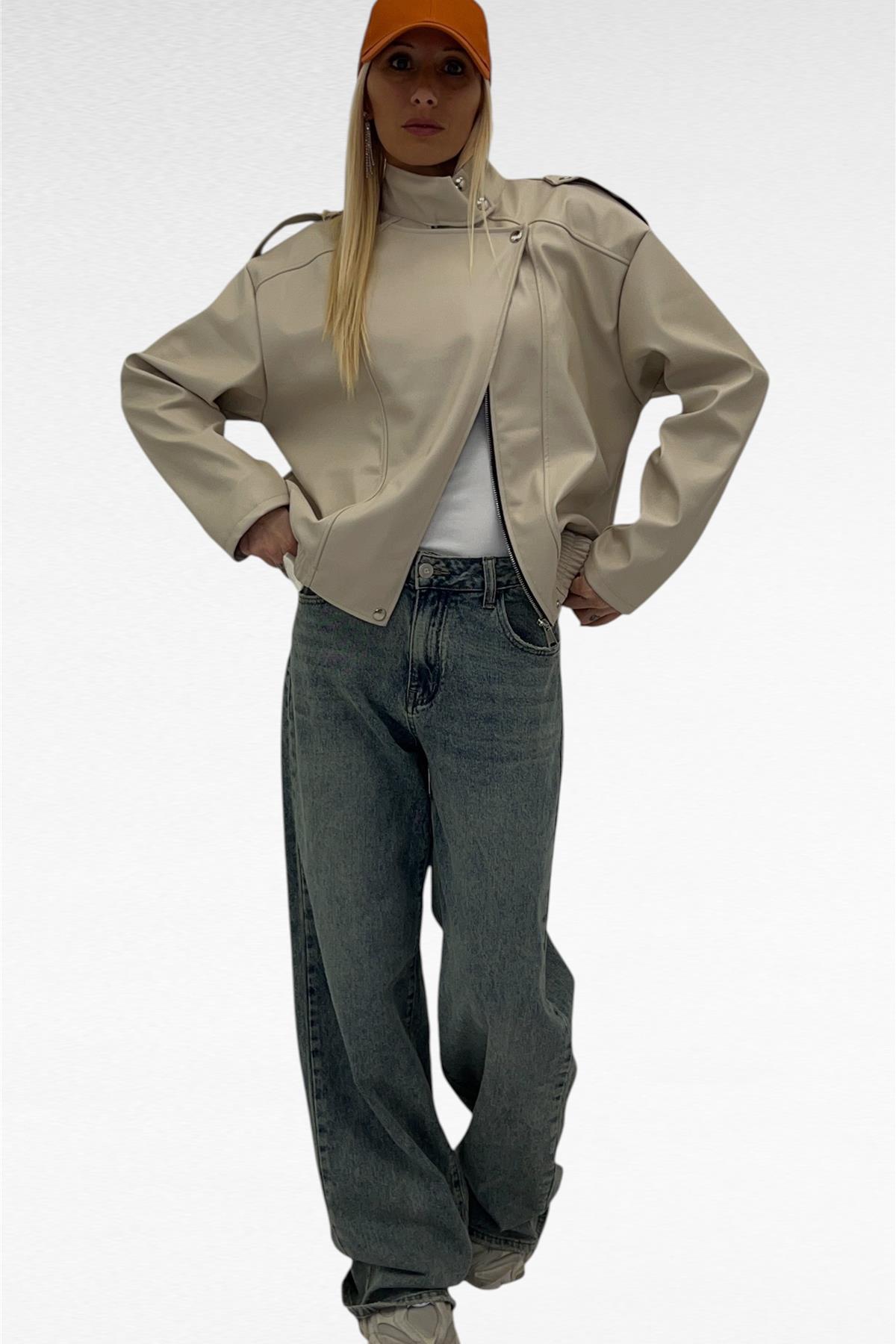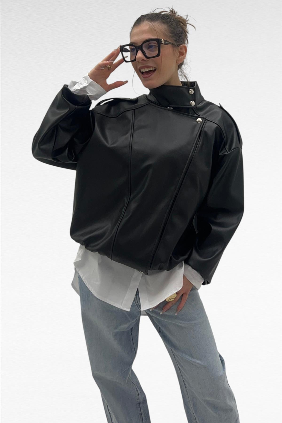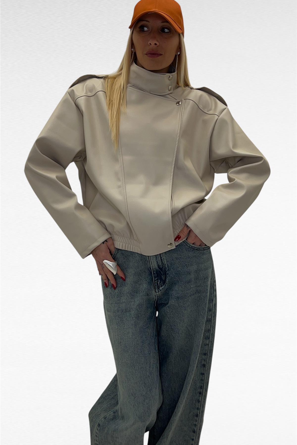 Giubbotto effetto pelle con cerniera nascosta due bottoni di chiusura al collo elastico sul fondo