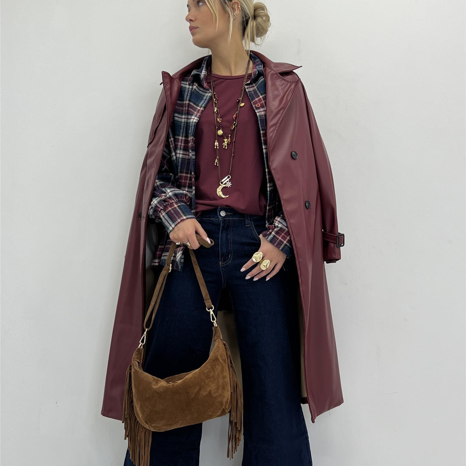 Trench effetto pelle sfoderato doppio petto con cintura in vita