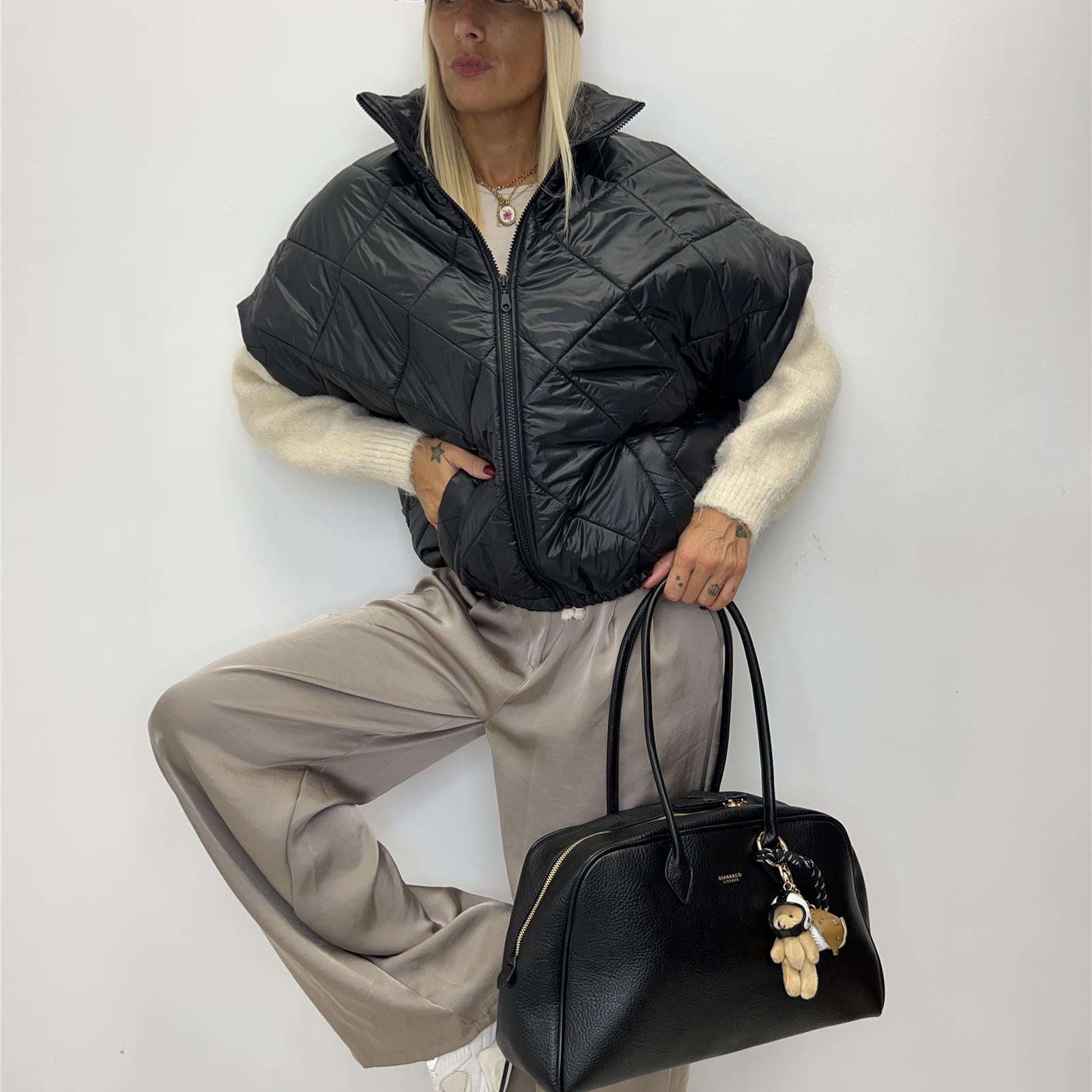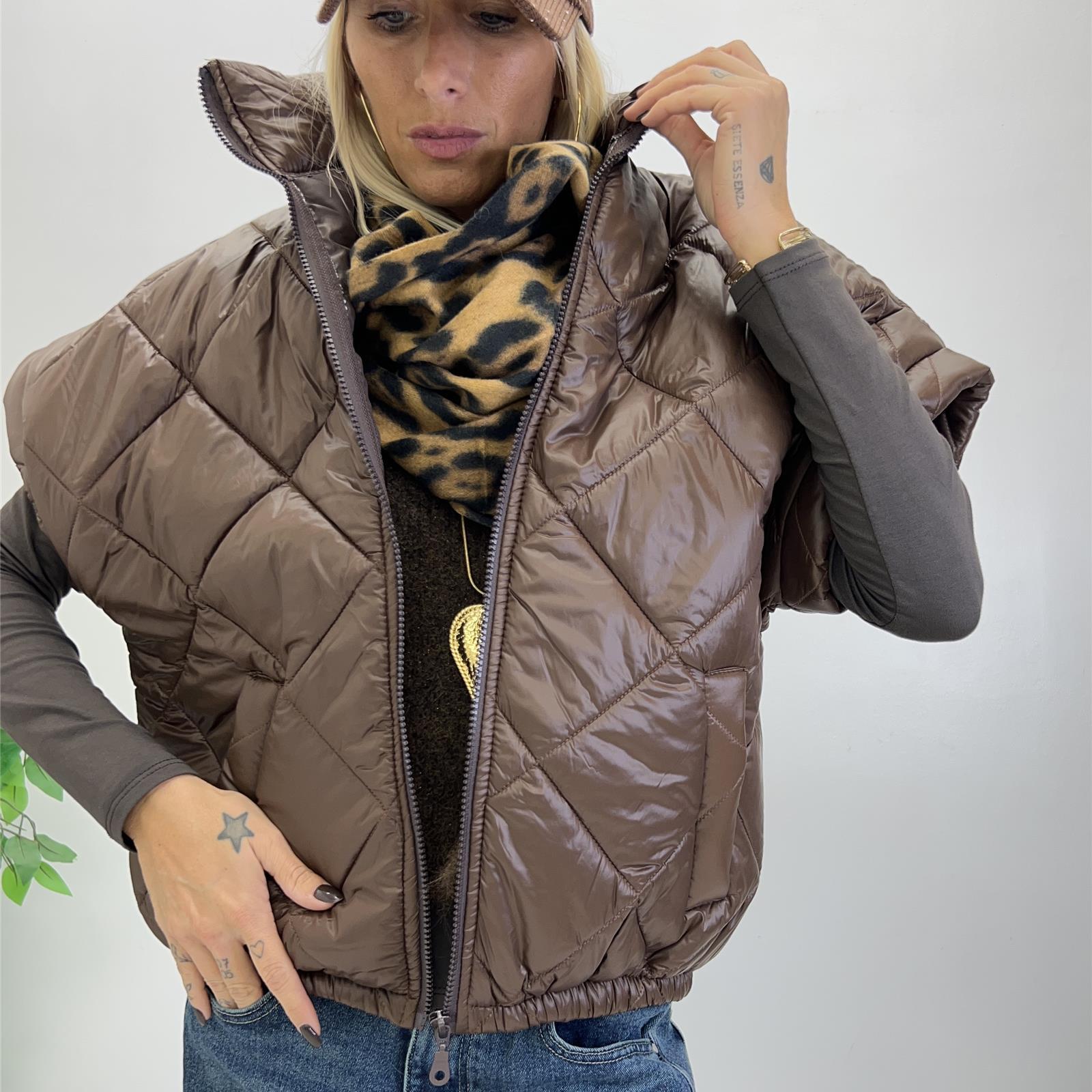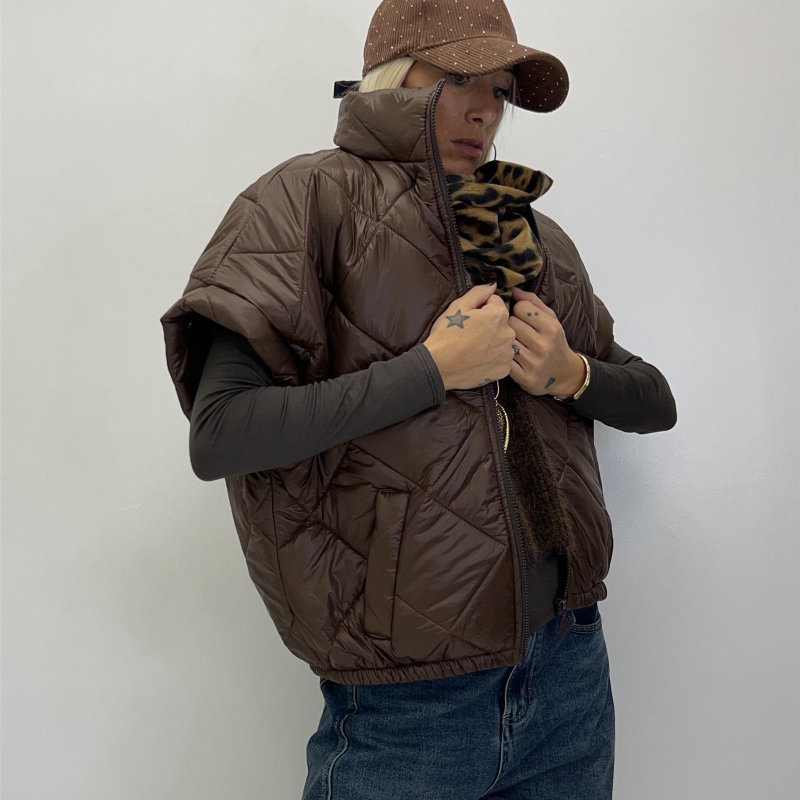 Gilet trapuntato con collo alto , zip frontale , apertura manica ampia , elastico sul fondo e tasche frontali