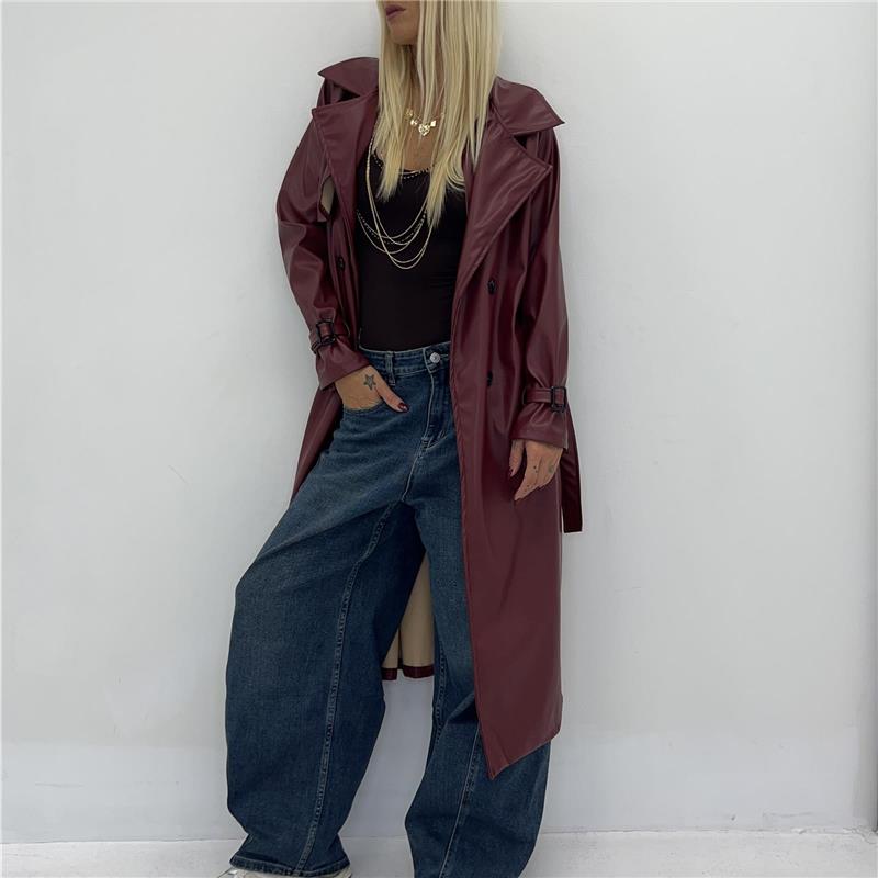Trench effetto pelle sfoderato doppio petto con cintura in vita