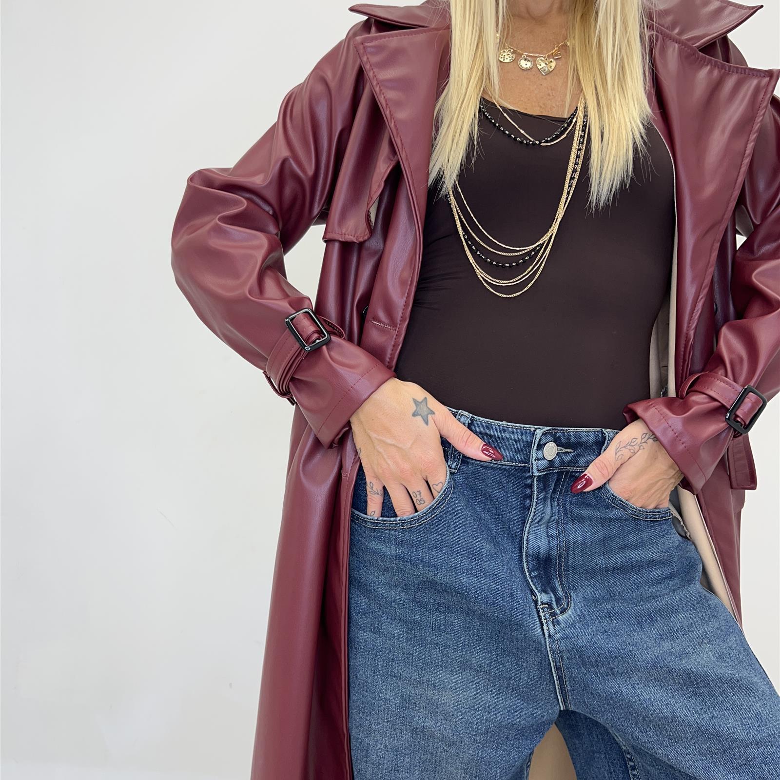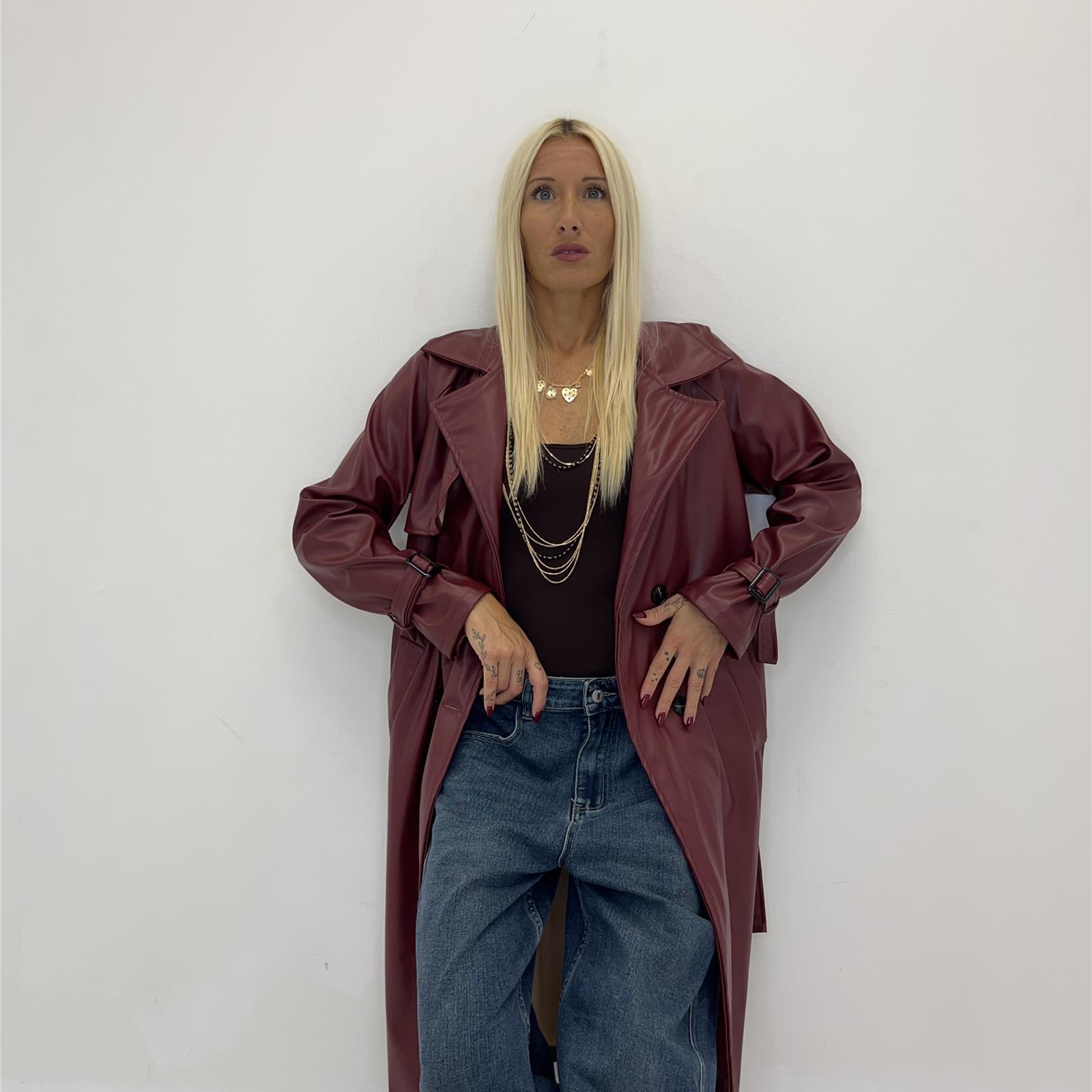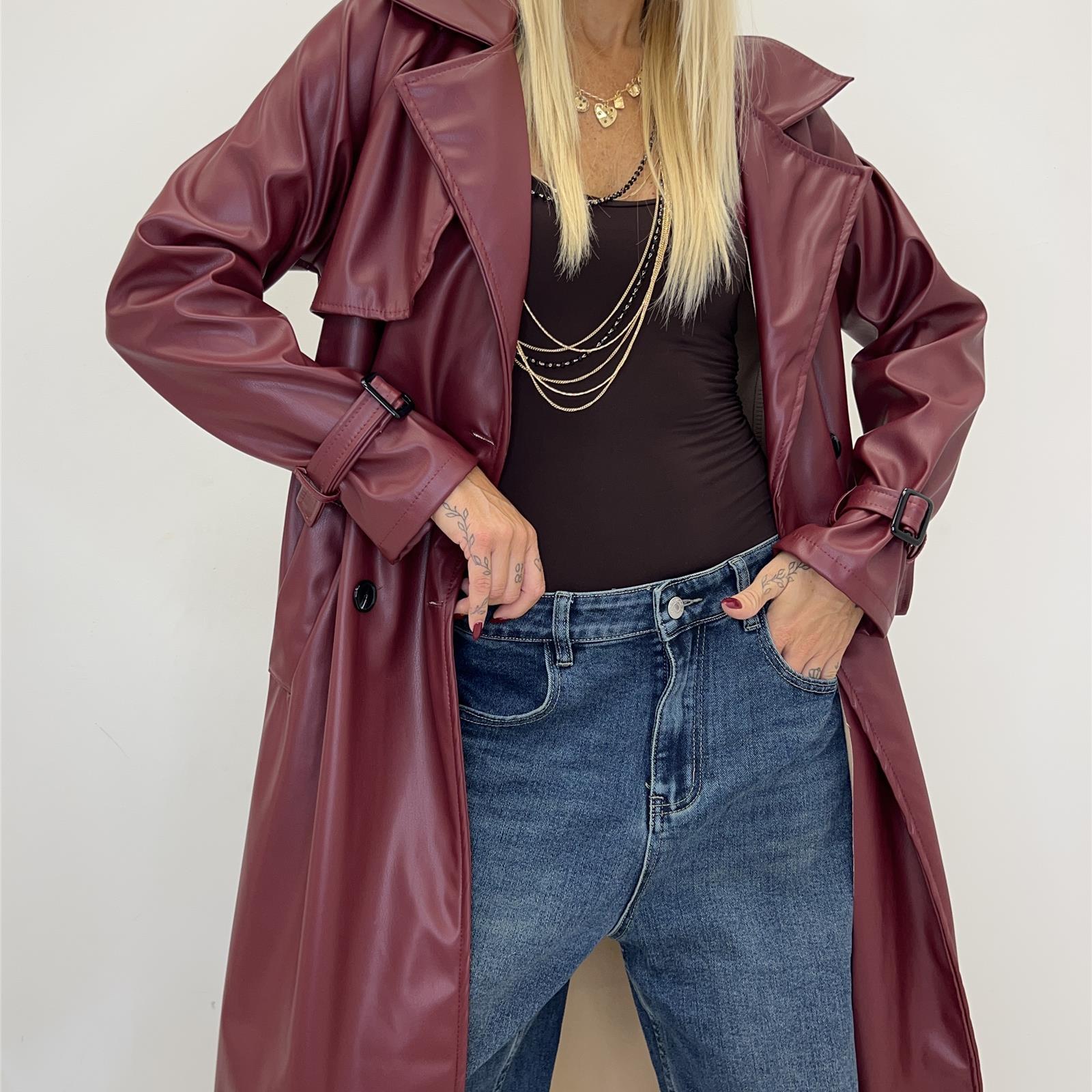 Trench effetto pelle sfoderato doppio petto con cintura in vita