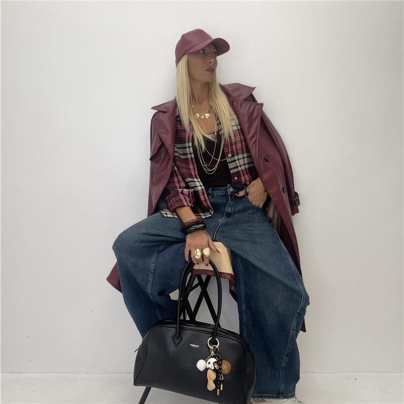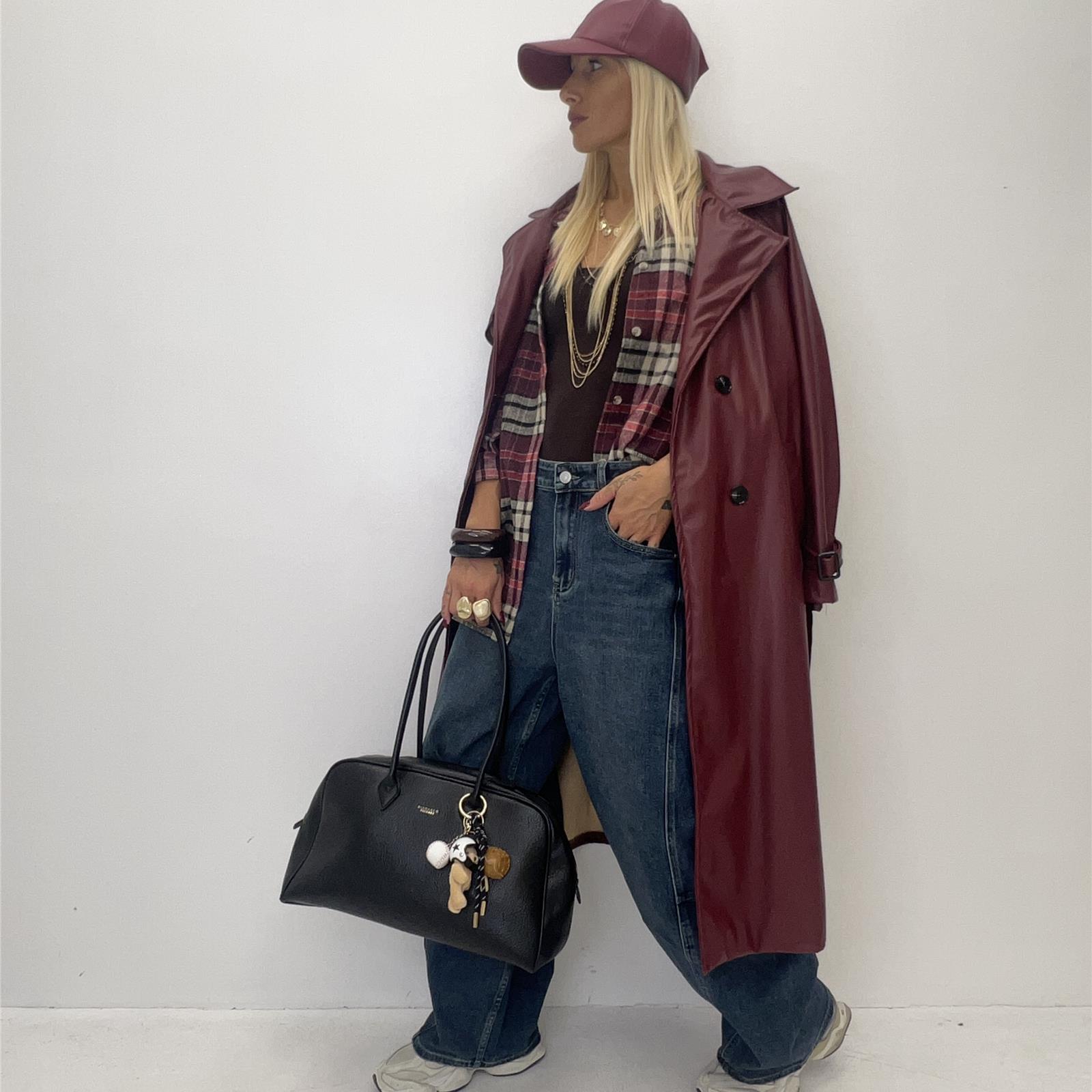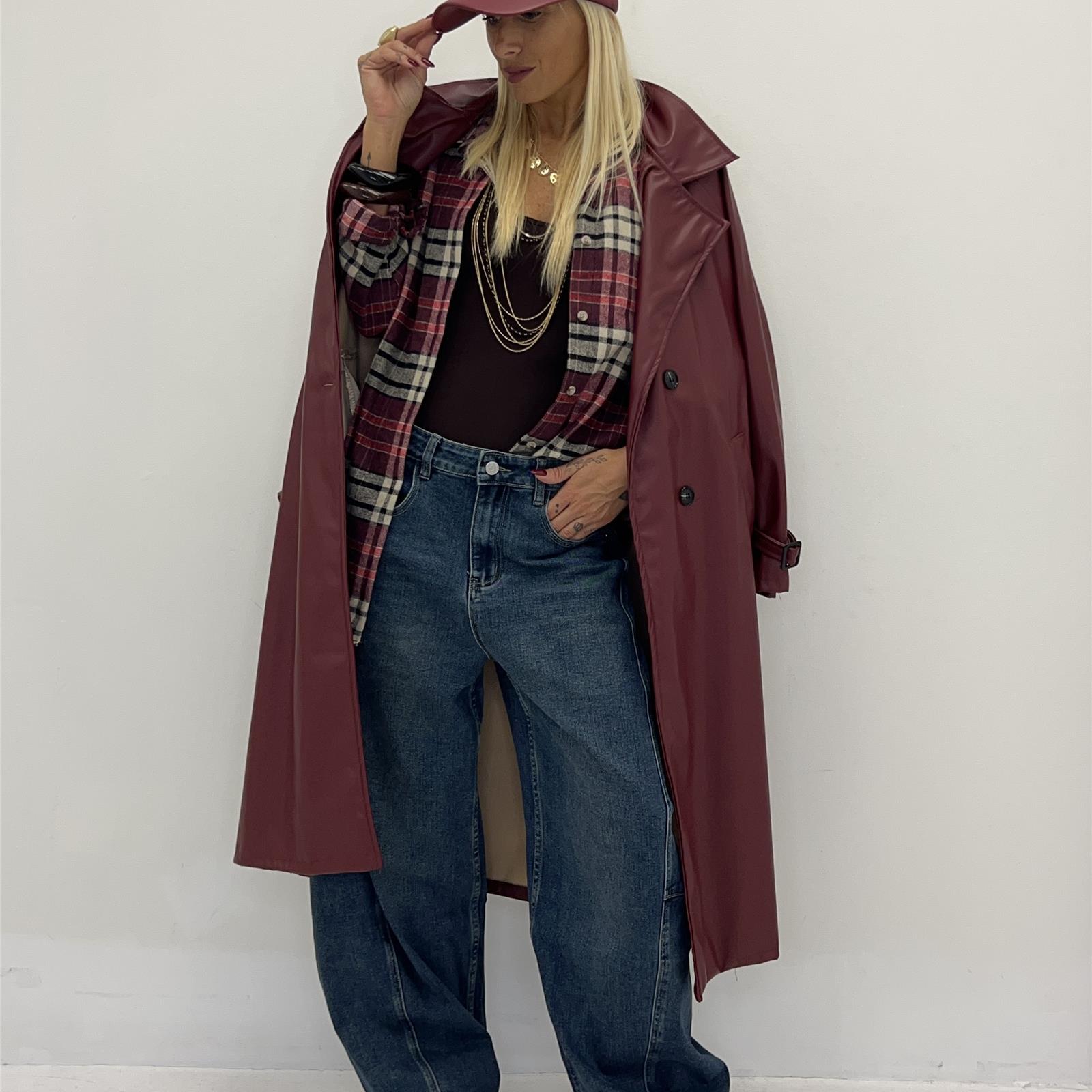 Trench effetto pelle sfoderato doppio petto con cintura in vita
