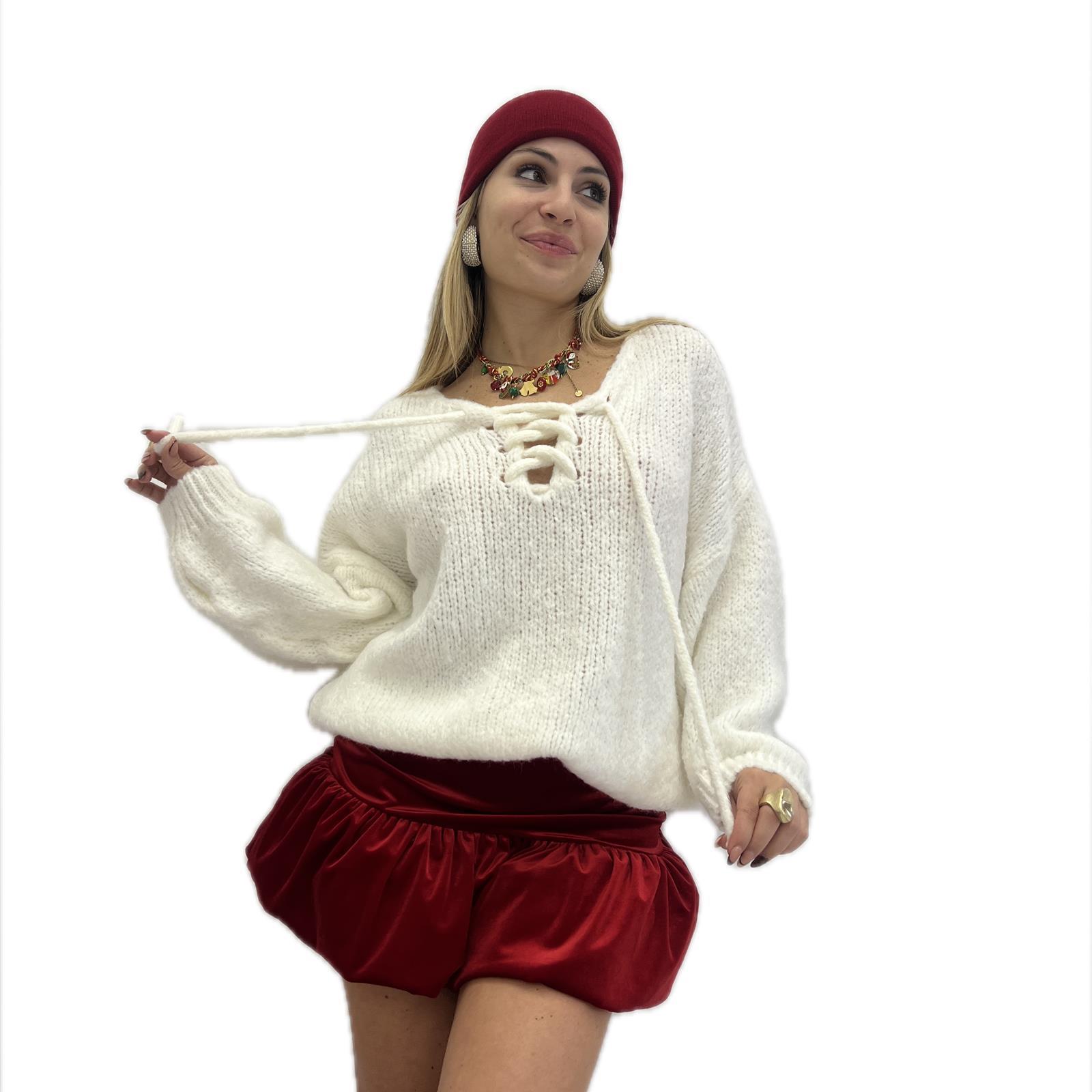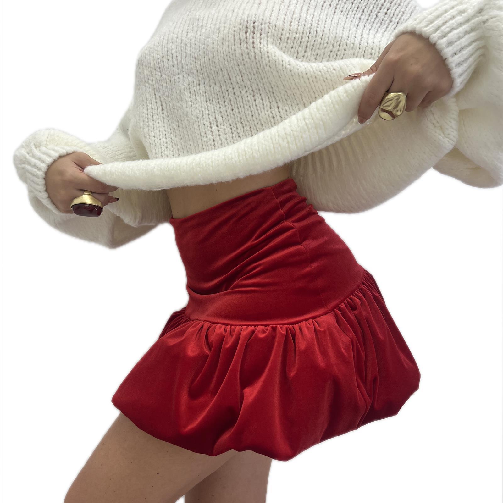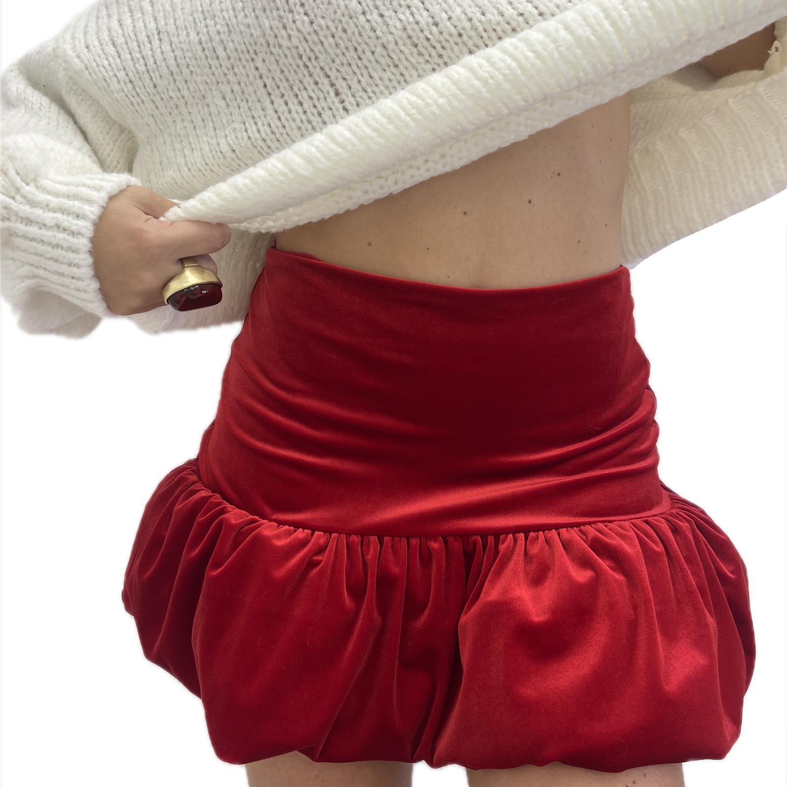 Gonna corta in velluto con balza ampia e arricciata, che crea un effetto leggermente a palloncino
