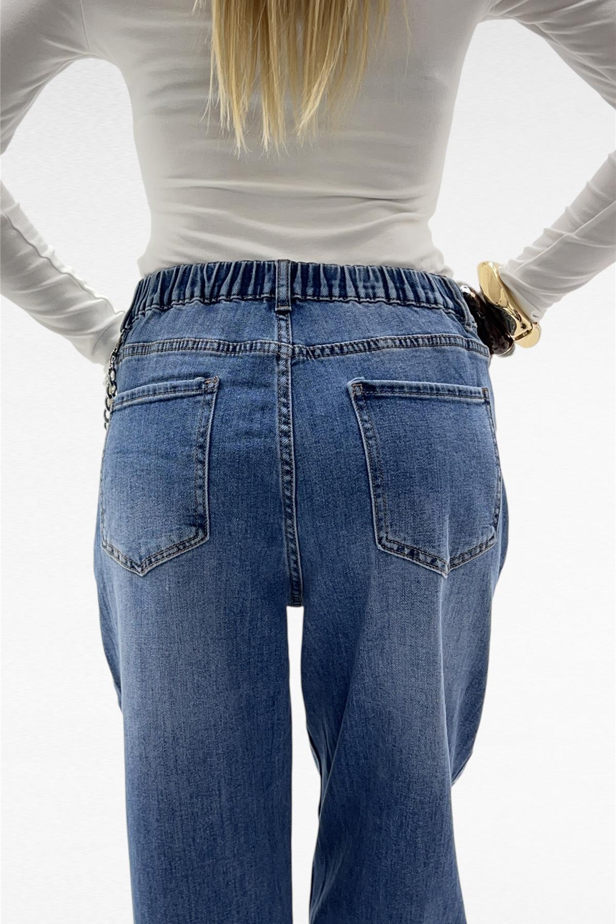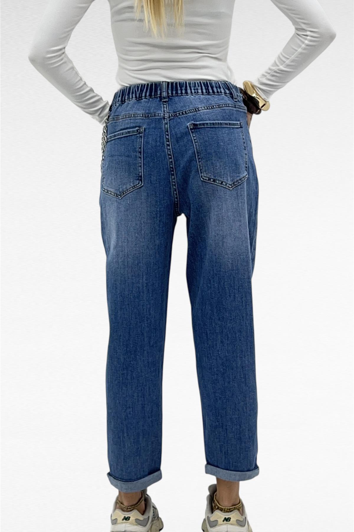 Jeans modello ballon con elastico9 sul retro e catena con perle removibile.