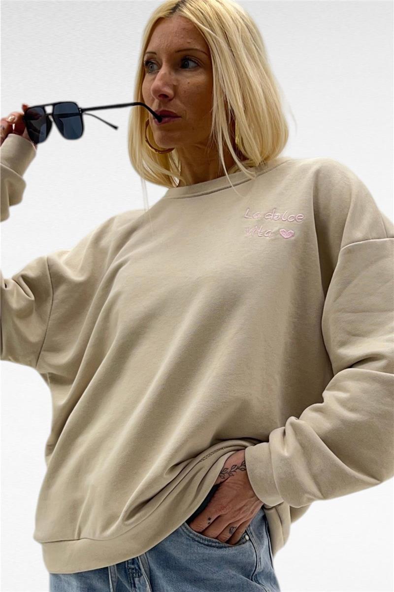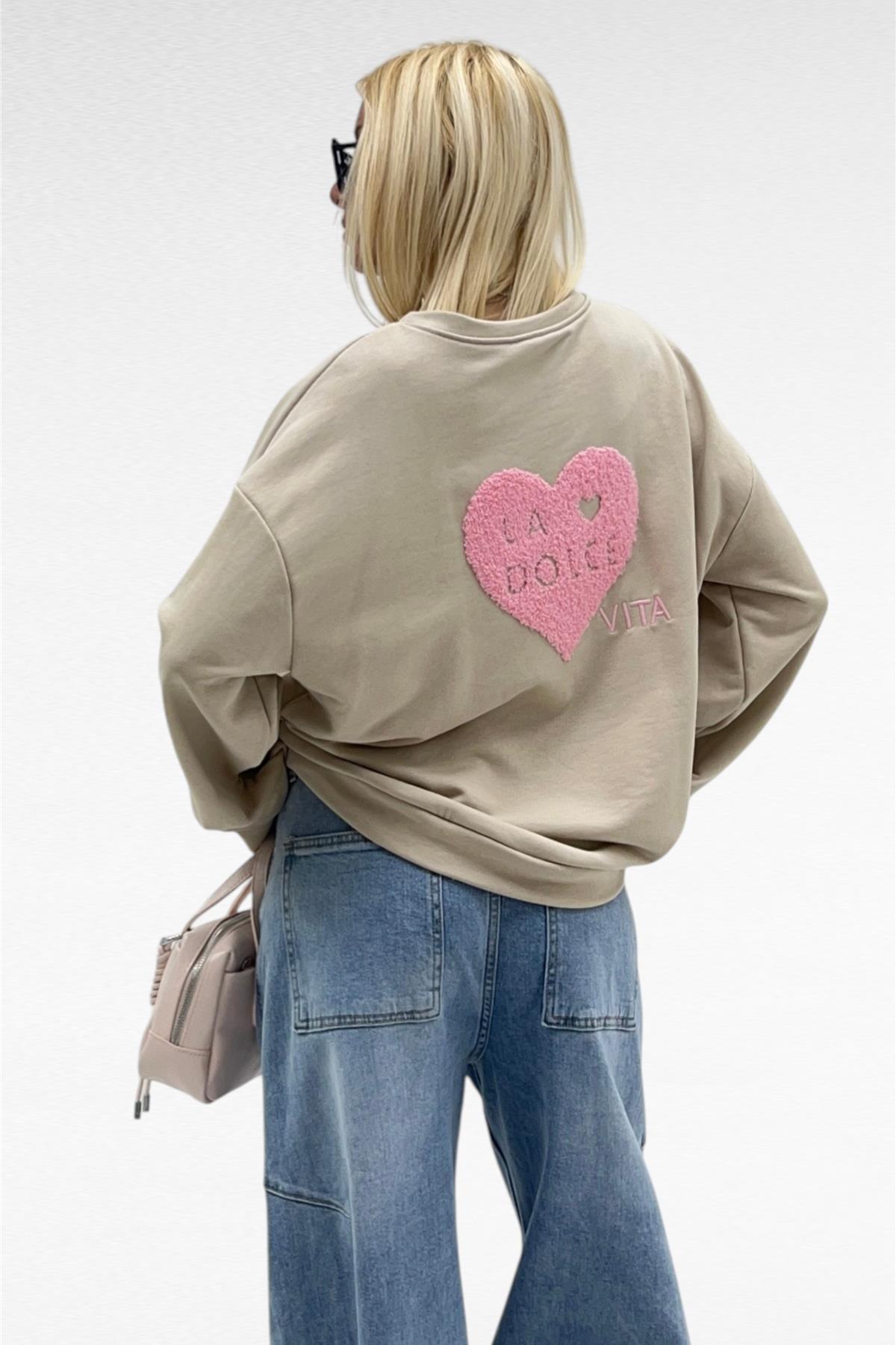 Felpa garzata elasticizzata, con polsino, girocollo e balza sul fondo. Sul retro presenta un cuore in rilievo.