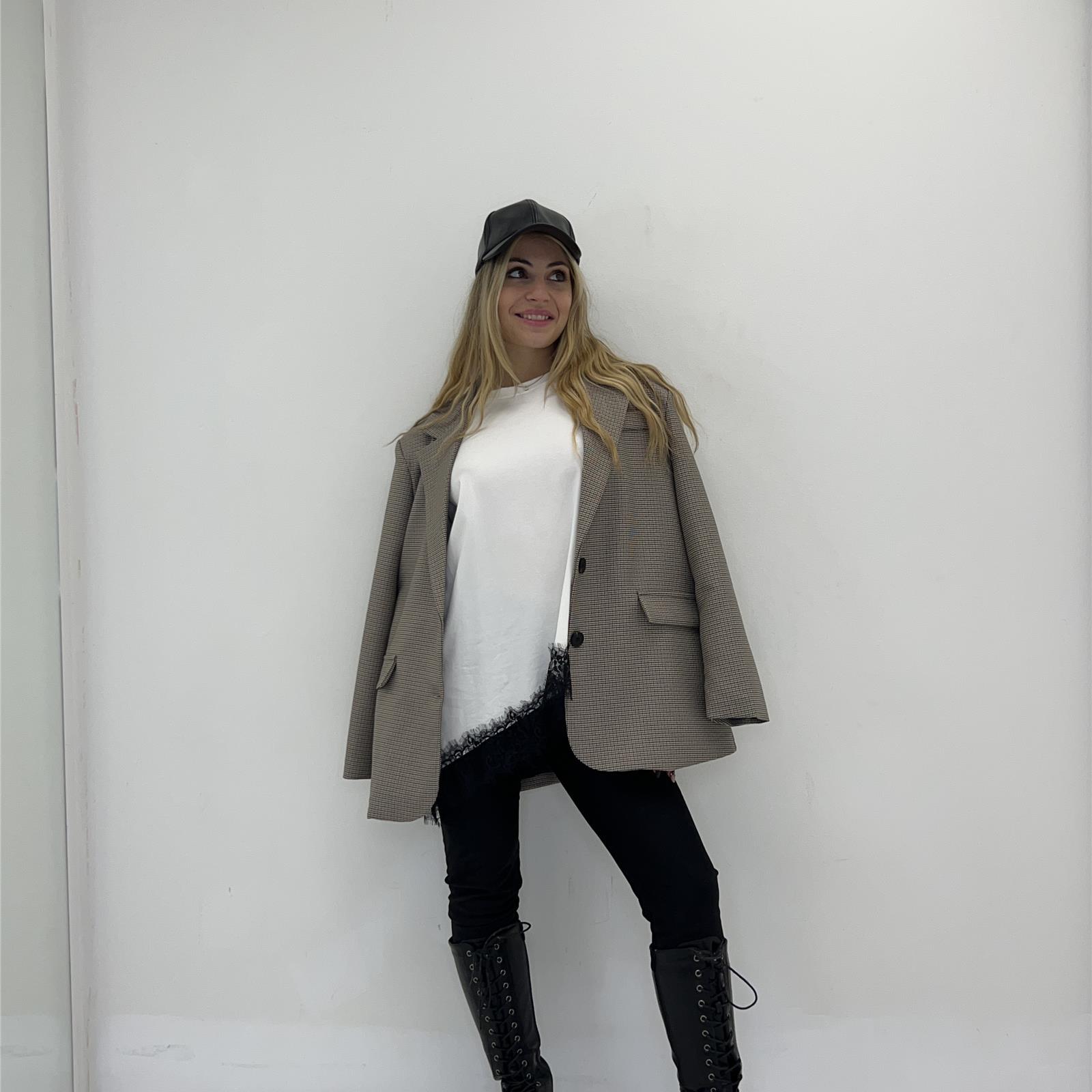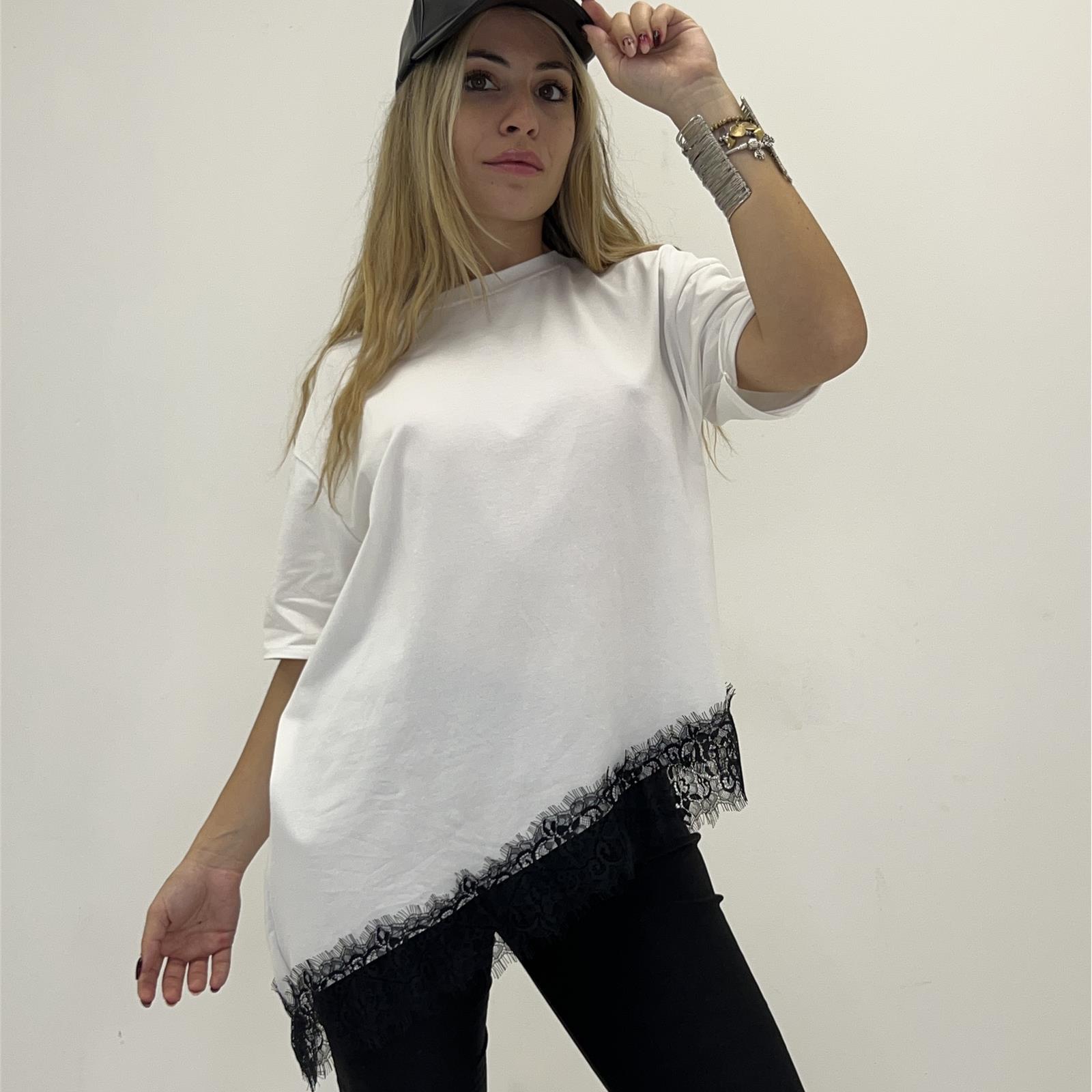 Maglia asimmetrica in cotone con pizzo alla fine , manica corta