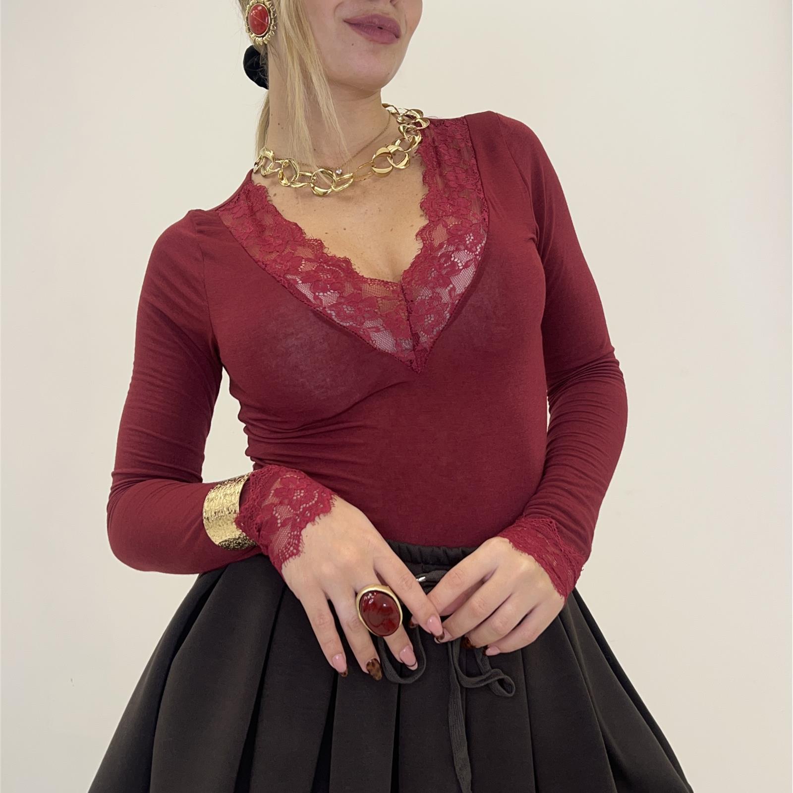 Maglia elasticizzata con scollo a V con pizzo sullo scollo e sul polso